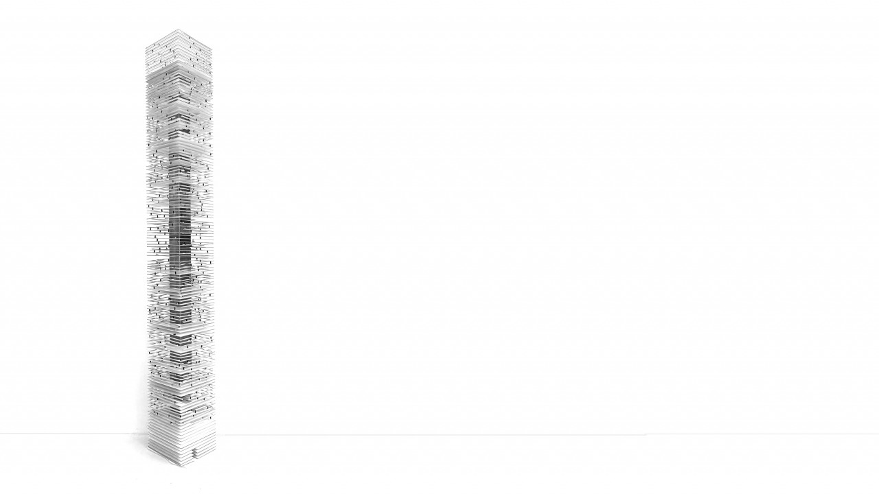 Vertical and horizontal prisms, both of very slender proportions and 100 meters long. The blocks are arranged in relative proximity and will have to attend to the relationships between the high and the long, the upright and the lying down, the extruded and the compressed.
