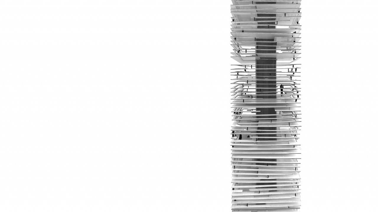 It is formed by a central communications core that holds part of these horizontal elements. The rest are layed on the previous ones since they have no structural purpose. In this way, a support building is generated in which the wooden slats shape the spaces and furniture. We can observe how, being arranged every 60 cm, these are able to shape to the entire living spaces, giving rise to different possibilities of minimum housing that vary in terms of orientation and floor layout. In addition, the materiality used, allows to obtain a sense of transparency and lightness in addition to offering privacy to users and a 360º view of the city of Madrid.