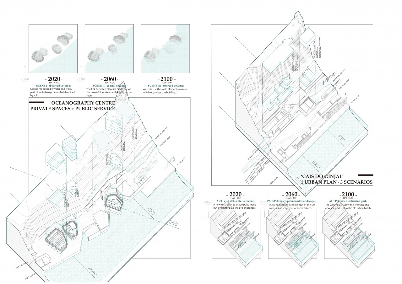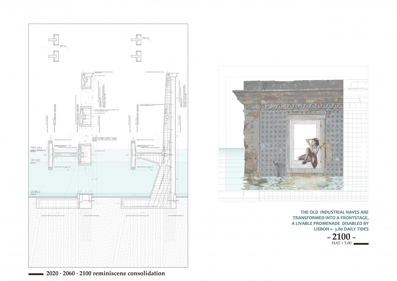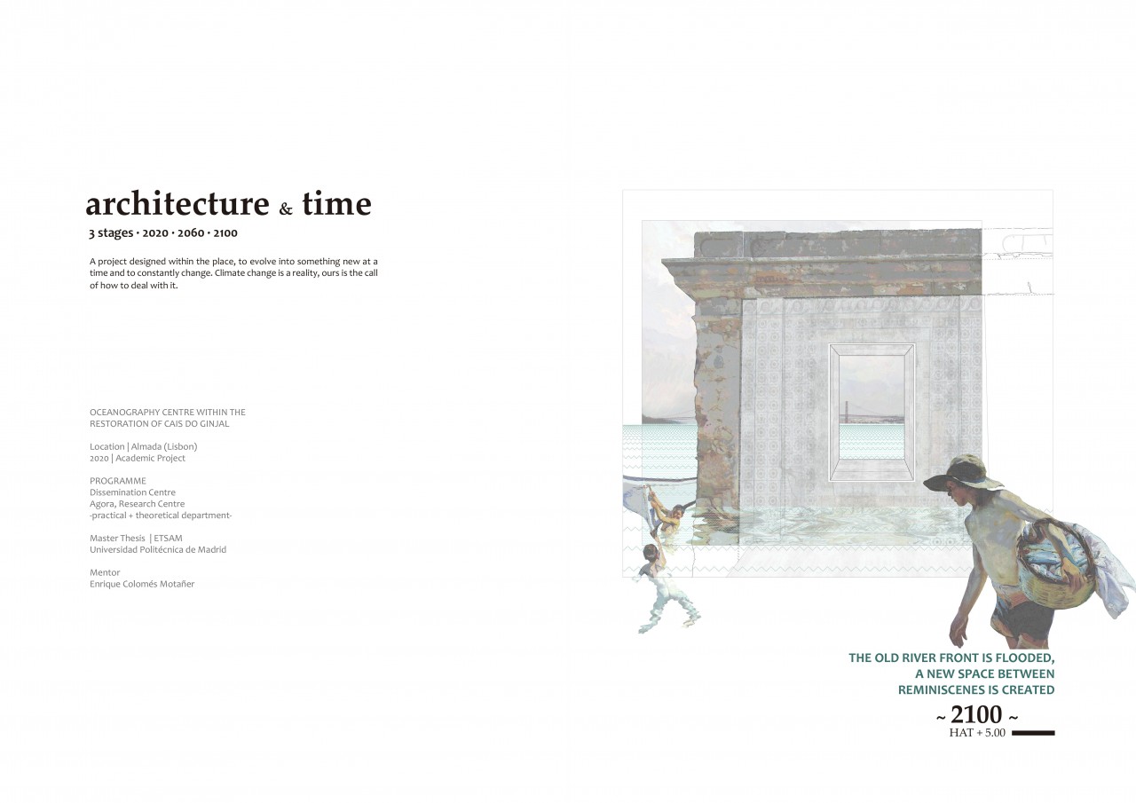 Medio físico cambiante, a menudo a velocidad inapreciable y en ocasiones acelerada. A partir de la premisa del ascenso del nivel del mar, se propone la apuesta por el medio acuático como elemento dinamizador y de recuperación del Cais do Ginjal, zona portuaria histórica en Lisboa actualmente abandonada y en proceso de colapso edificatorio. Una propuesta capaz de evolucionar a lo largo de los años y de las horas, creando diversos escenarios destinados a las actividades humanas, haciendo de la infraestructura portuaria una escenografía urbana y paisaje a través de la arquitectura.