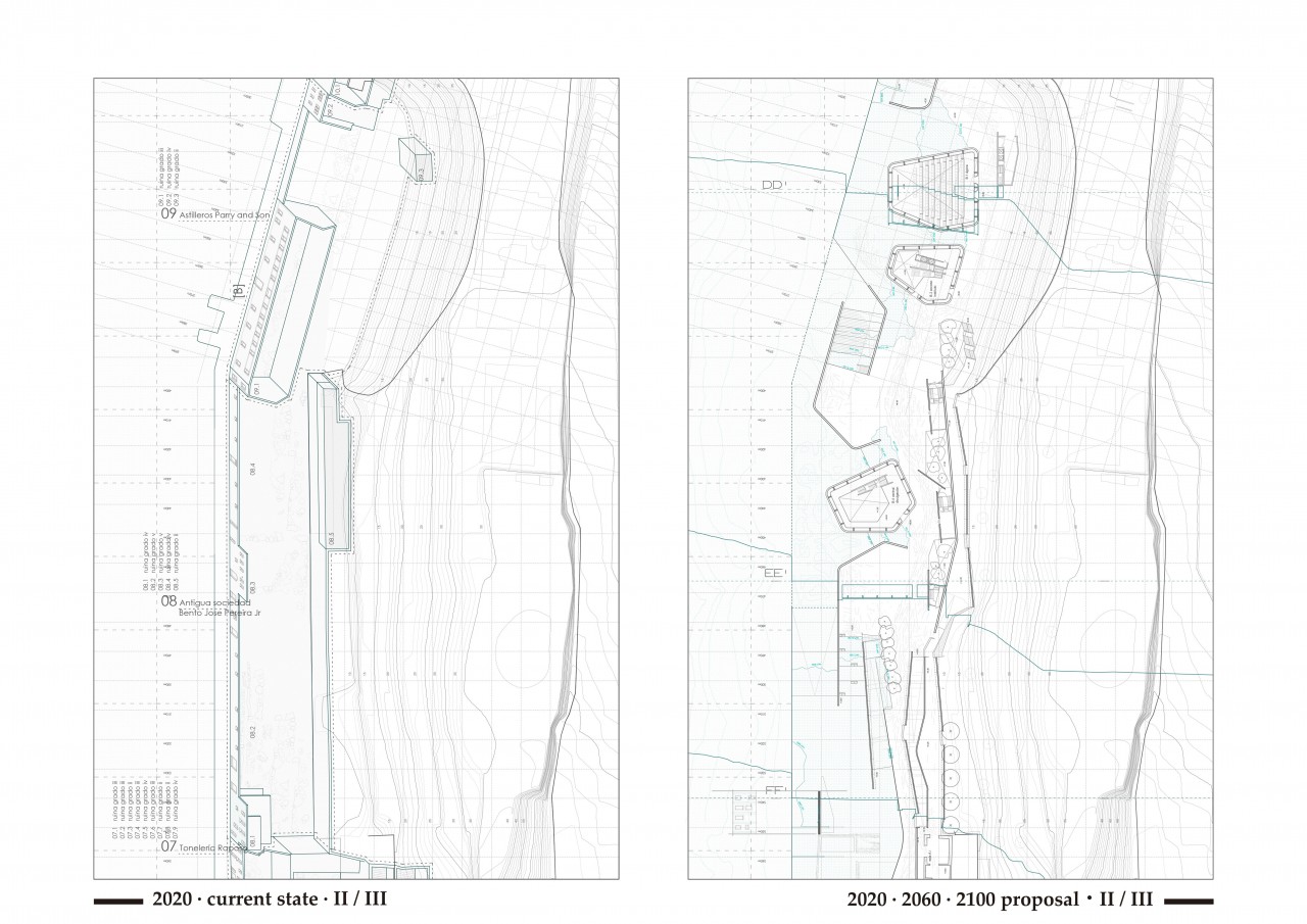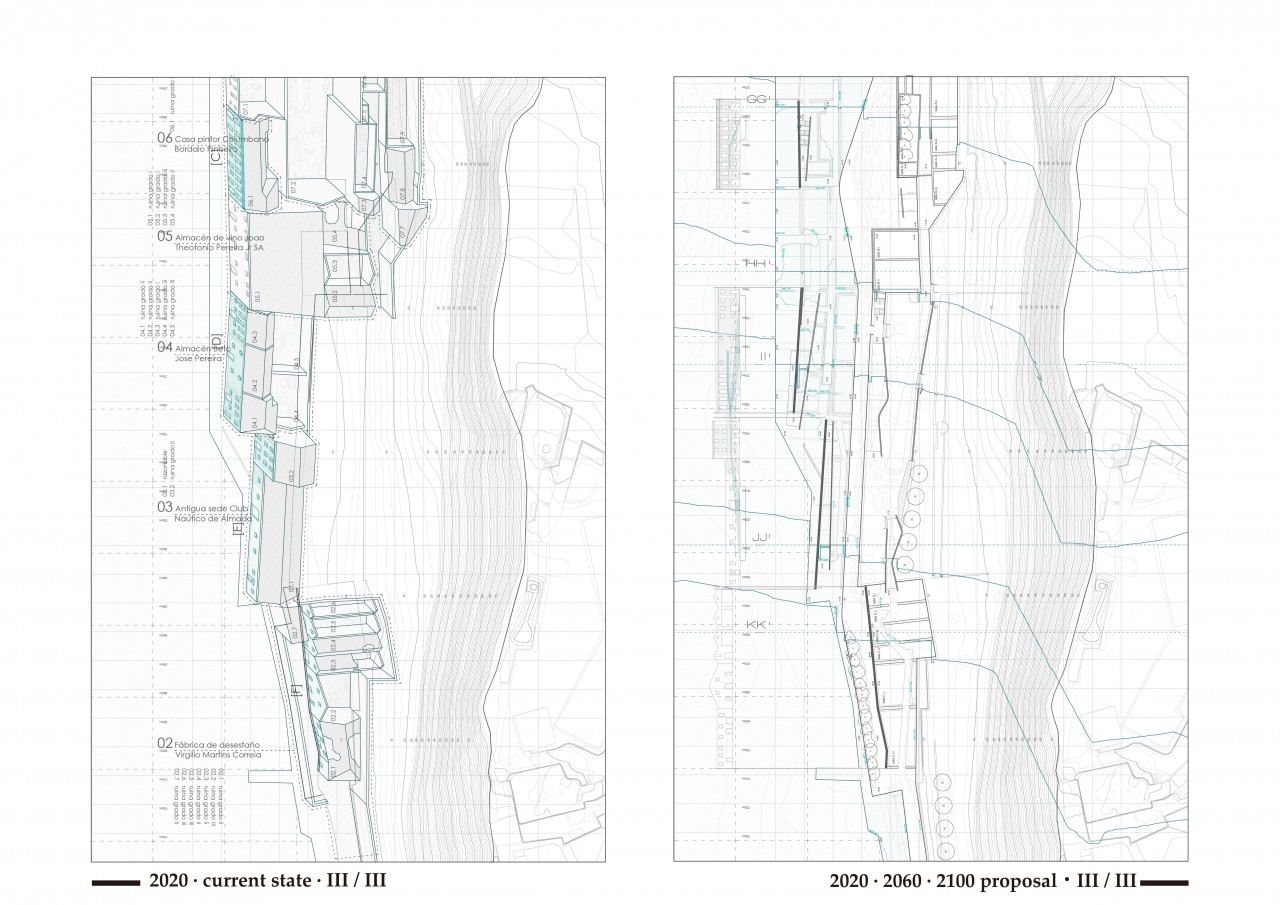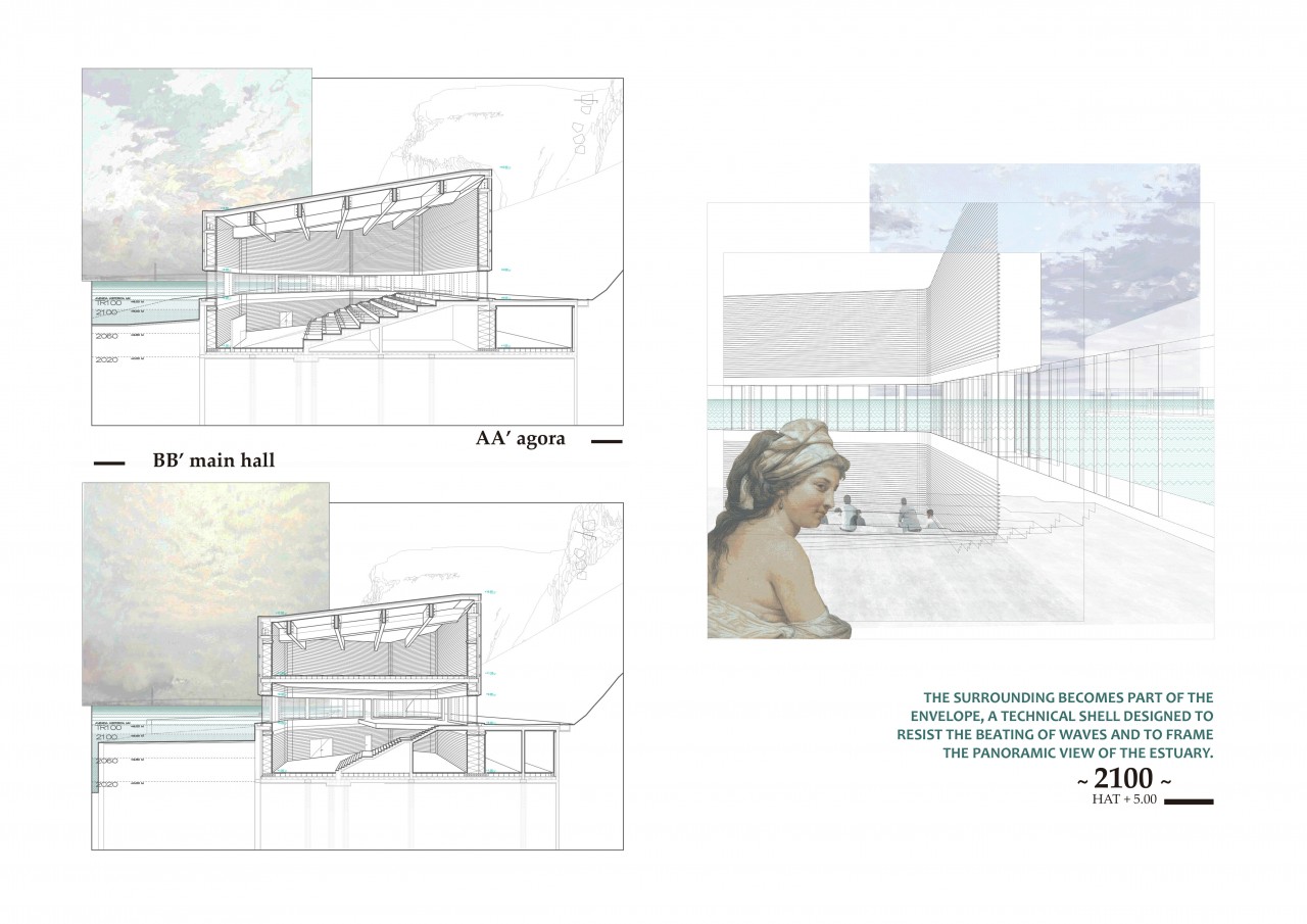 Medio físico cambiante, a menudo a velocidad inapreciable y en ocasiones acelerada. A partir de la premisa del ascenso del nivel del mar, se propone la apuesta por el medio acuático como elemento dinamizador y de recuperación del Cais do Ginjal, zona portuaria histórica en Lisboa actualmente abandonada y en proceso de colapso edificatorio. Una propuesta capaz de evolucionar a lo largo de los años y de las horas, creando diversos escenarios destinados a las actividades humanas, haciendo de la infraestructura portuaria una escenografía urbana y paisaje a través de la arquitectura.