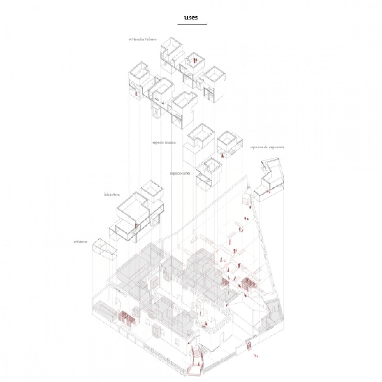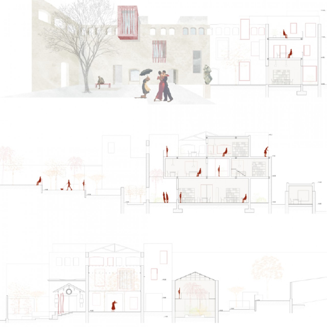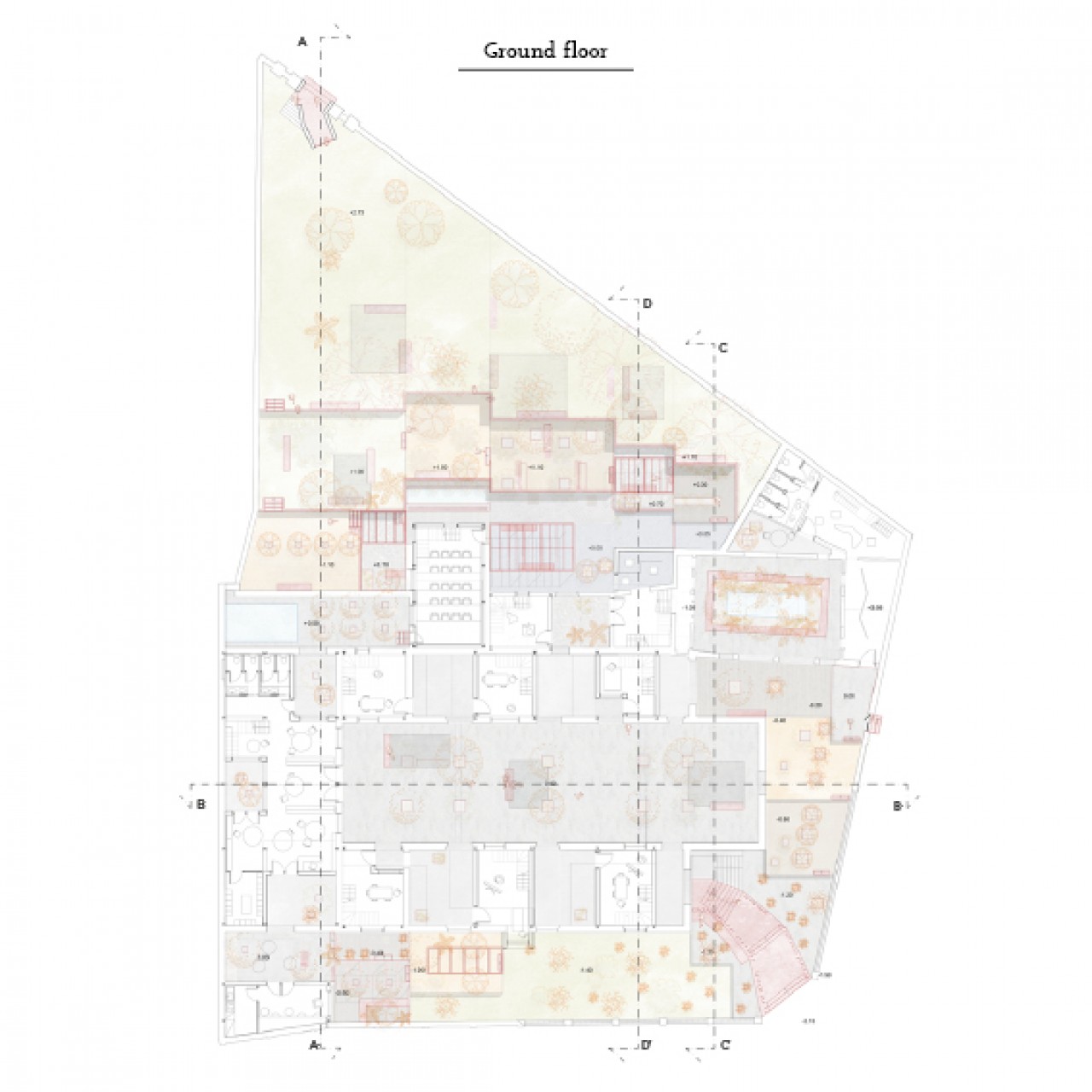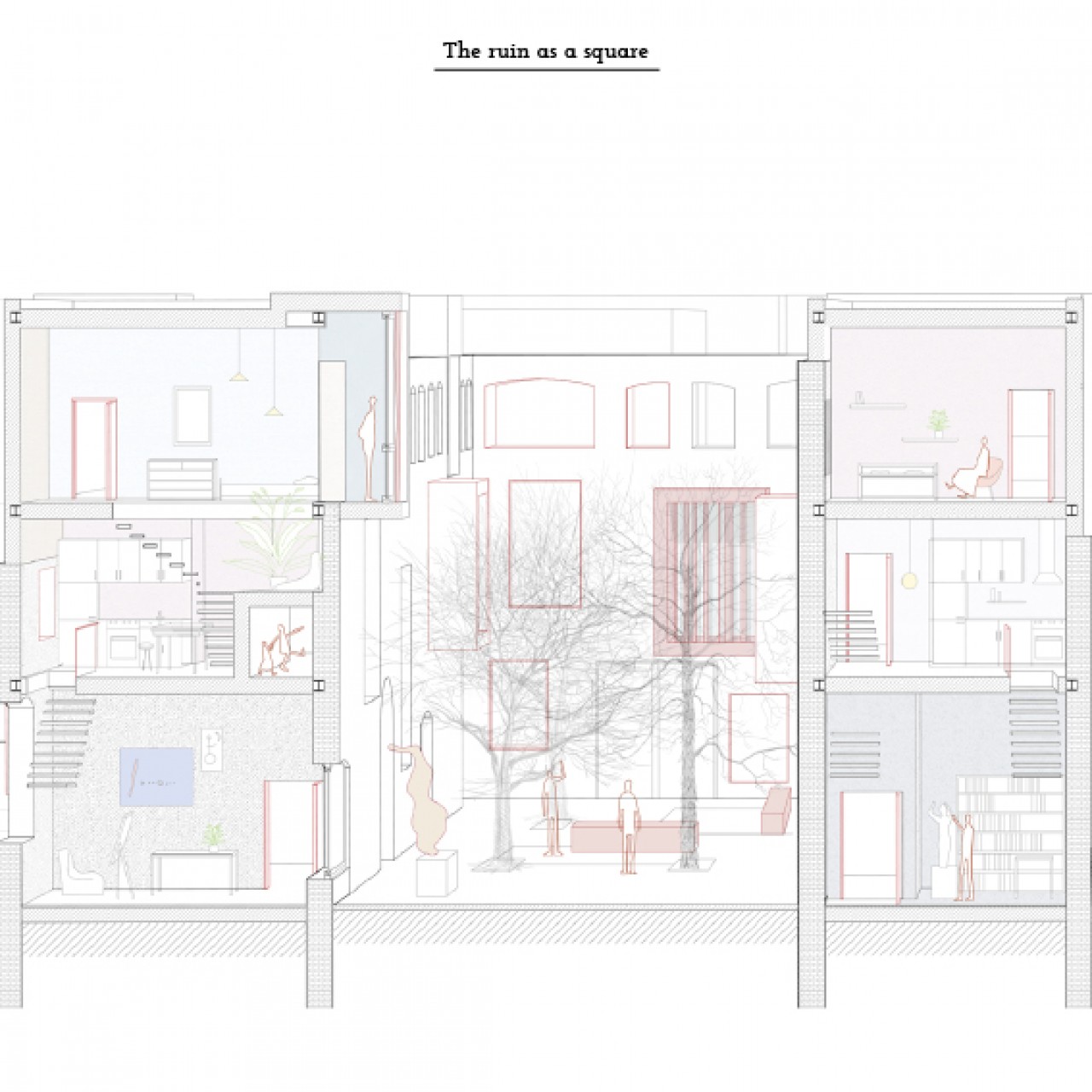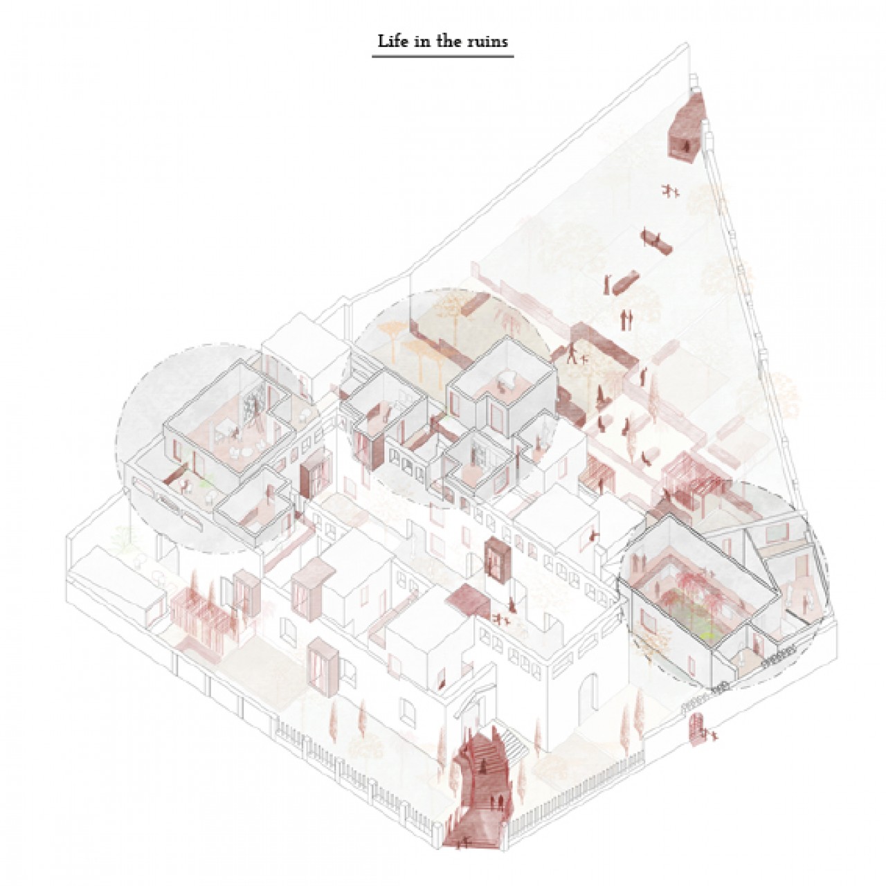 The ruin of of pre existence is the protagonist in the project. Its tracks guide in following main directions; it helps in defining the spatial configuration and marks the passage between inside and outside of the area.