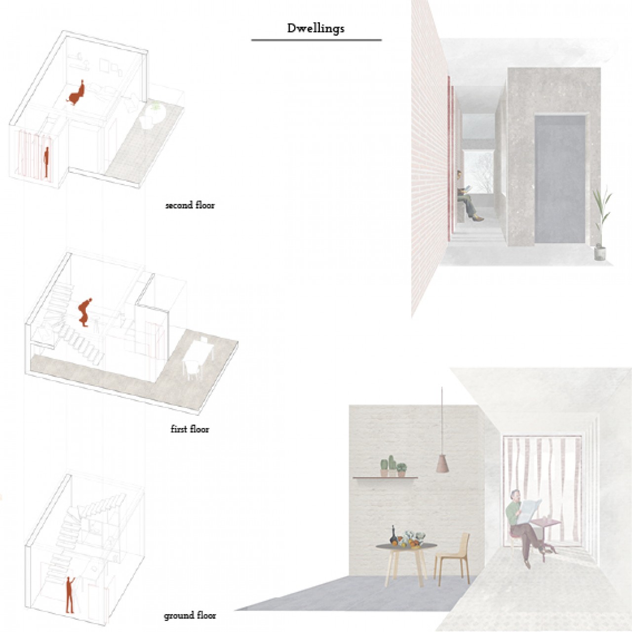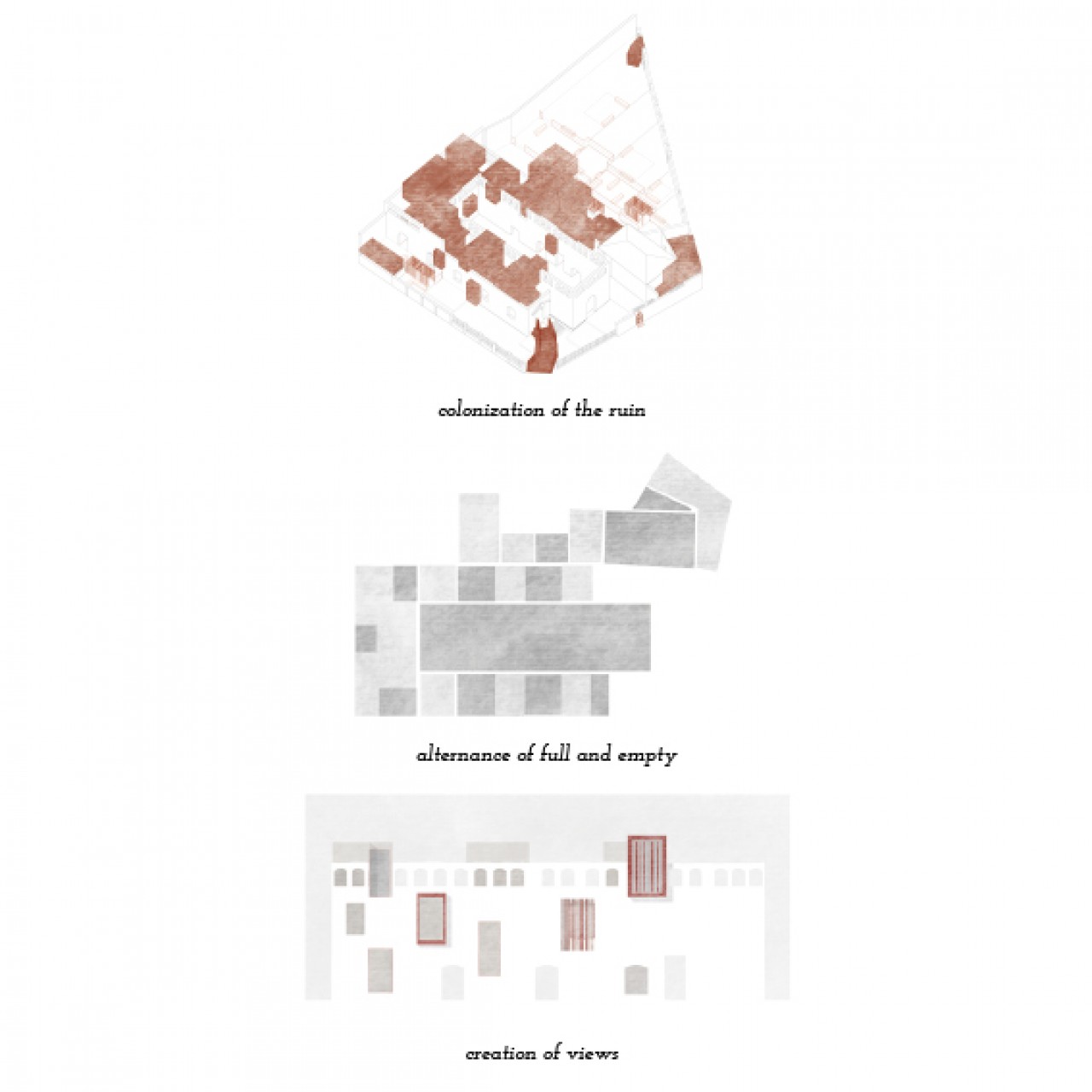 The intervention is based on the creation of volumes inserted between the maintained part of ruin. These volumes interact one with the other creating a game of full and empty places. Moreover they define spaces half public and half opened.