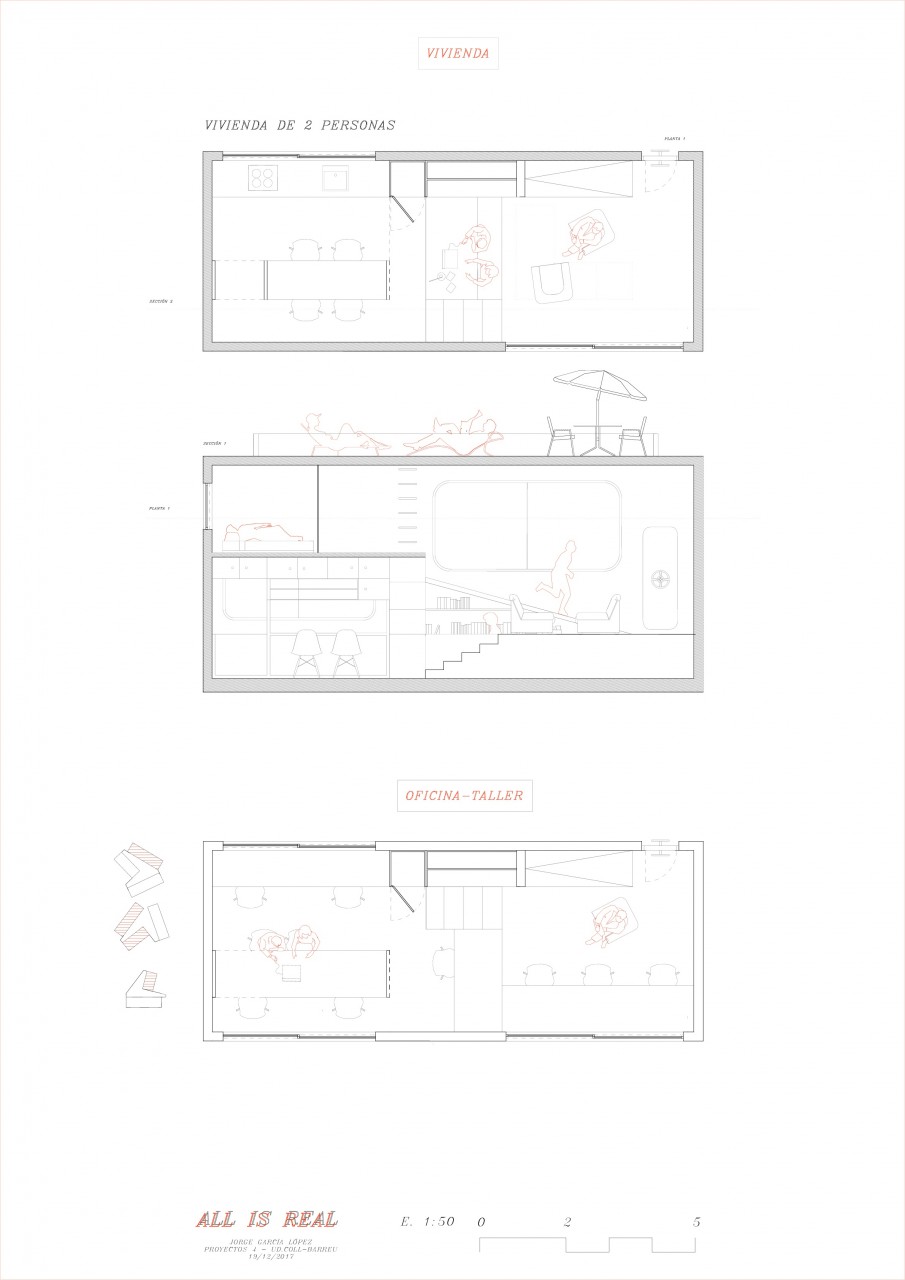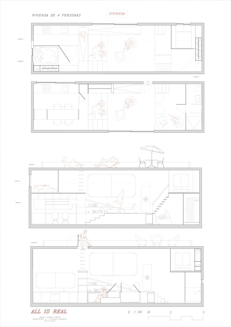 También se lleva esta tipología a la vivienda pero a una escala más modesta; se divide en cápsulas mueble (nodos), donde las conexiones entre ellas articulan el espacio. ¿Por qué siempre las viviendas presentan una sola entrada y a pie de calle? Es hora de que las cosas empiecen a cambiar. Por eso en el proyecto se desmaterializa esta idea, creando una especie de vivienda submarino, la cual presenta escotillas y entradas elevadas del suelo.