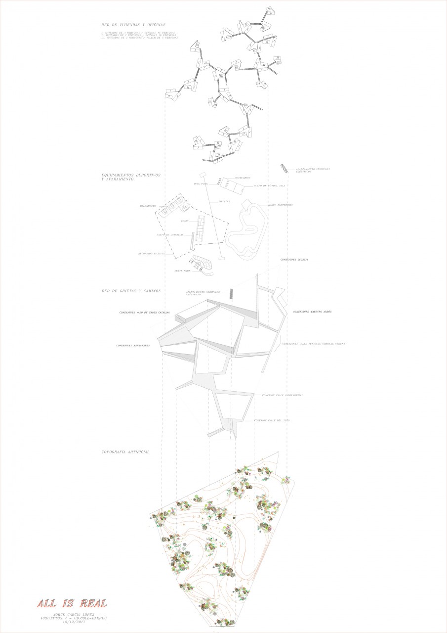 Sobre esta planta se superpone una red de plataformas y pasarelas, con una geometría más cristalizada, sobre pilares levemente inclinados. Se busca una permeabilidad isótropa. Esta interconexión de nodos, nace de la búsqueda de la hibridación de espacios de oficia-taller junto con módulos de vivienda.