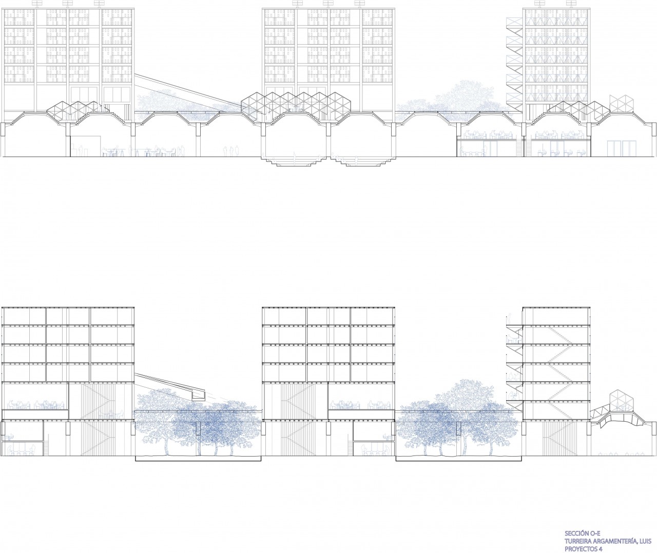 The purpose that everything is connected to everything leads me to make the deck passable in a north-south direction, and to connect the towers with each other from a system of footbridges with east-west direction.