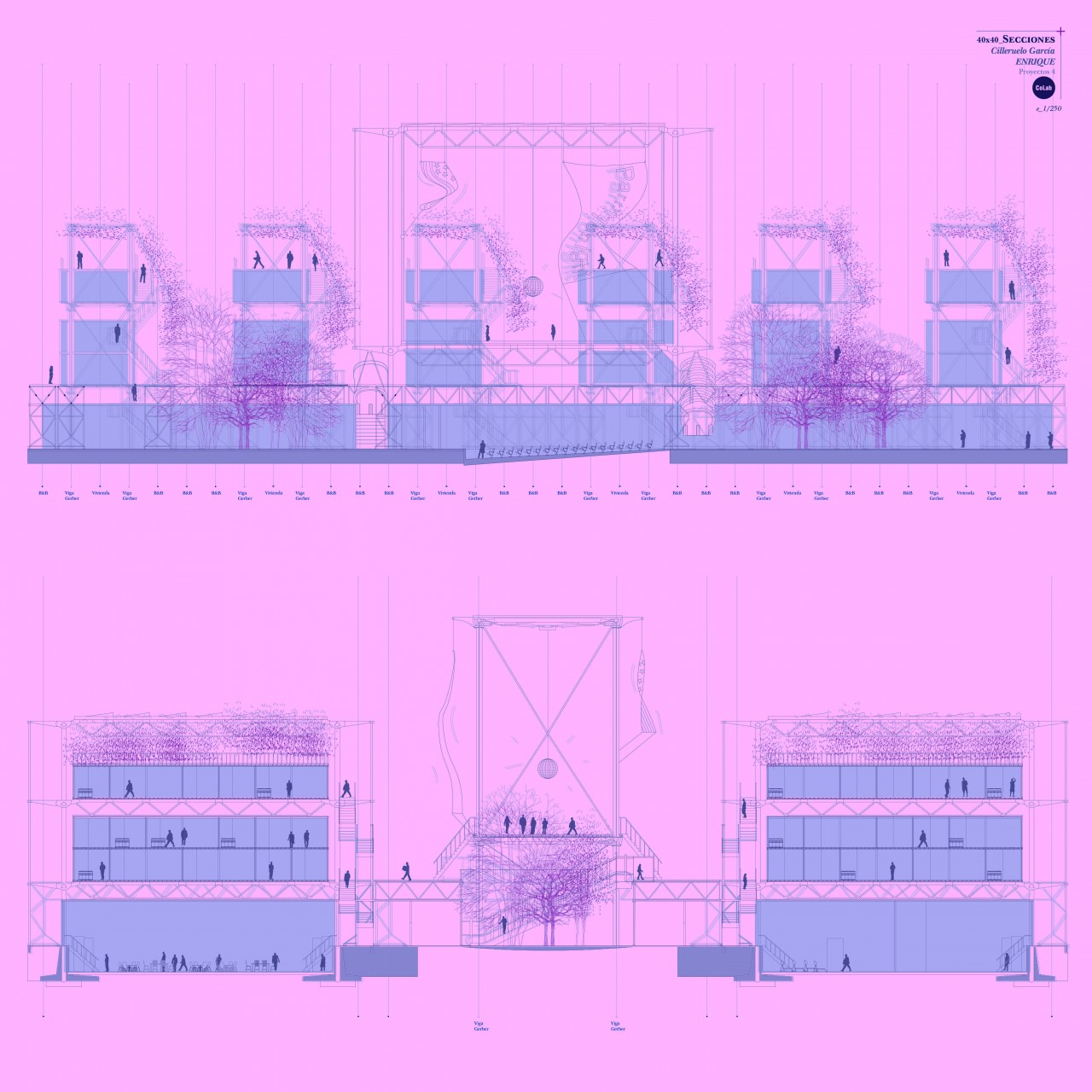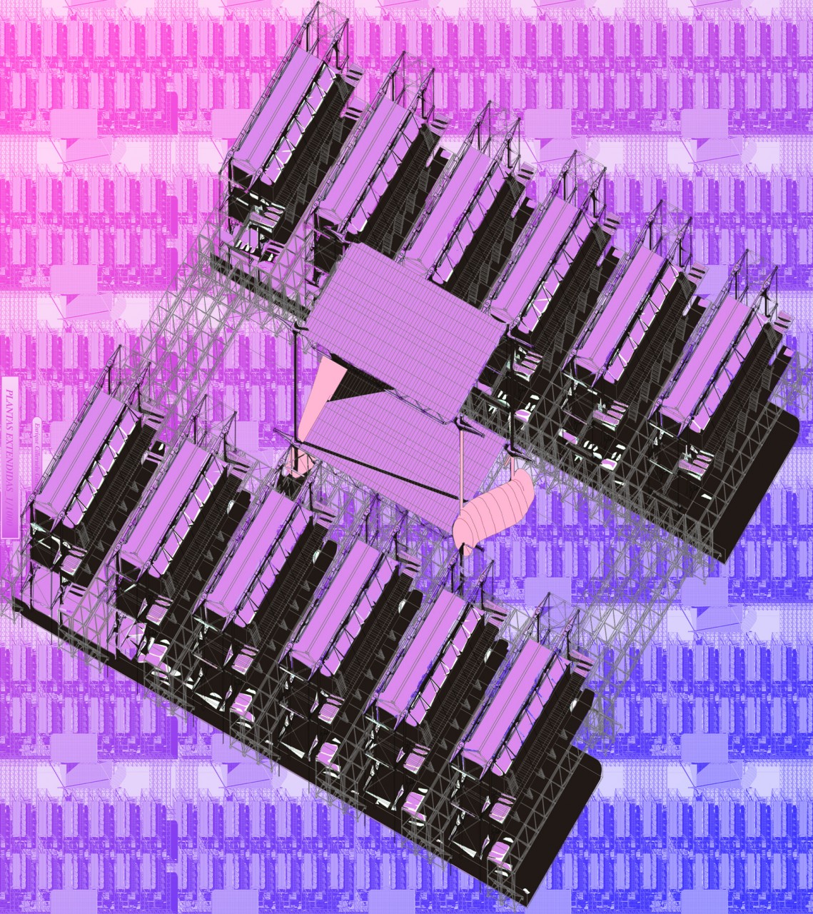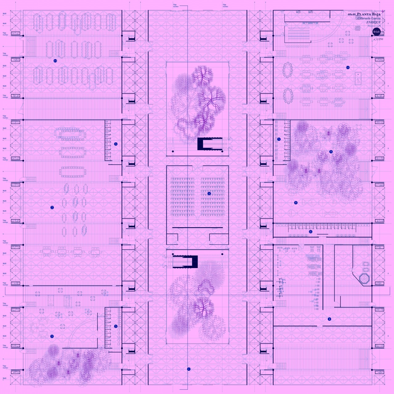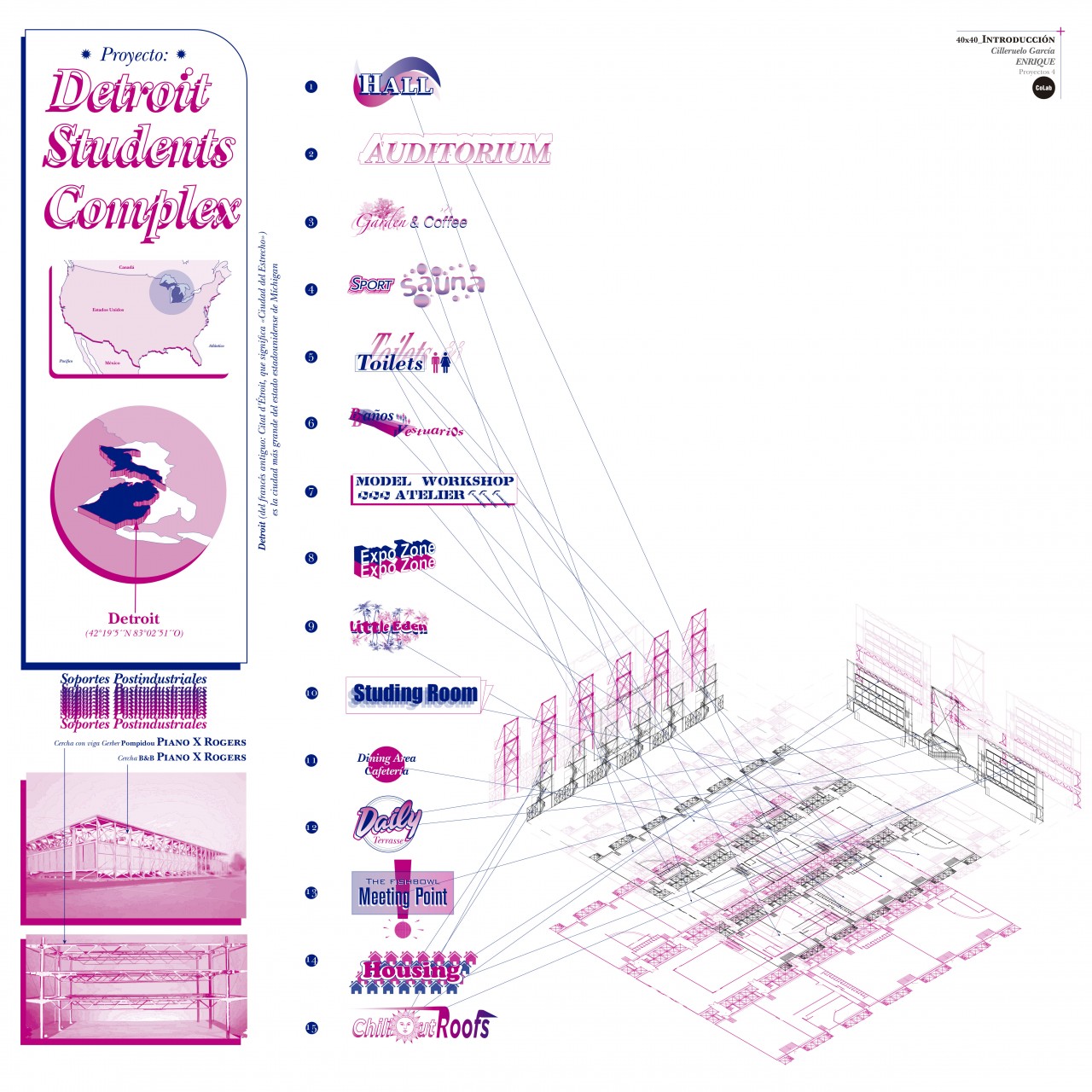 The Detroit Students Complex project answers a series of requirements to work with industrial structures, to create new systems that may not relate to their initial use. To do this, we imagine a pixel unit of _100x100_ meters, where using _supports and _infills we will respond to this way of projection. The objective of working with a square space of known dimensions is to be able to get this one to be replicated "i n f i n i t e l y" in all directions maintaining its systematic character.