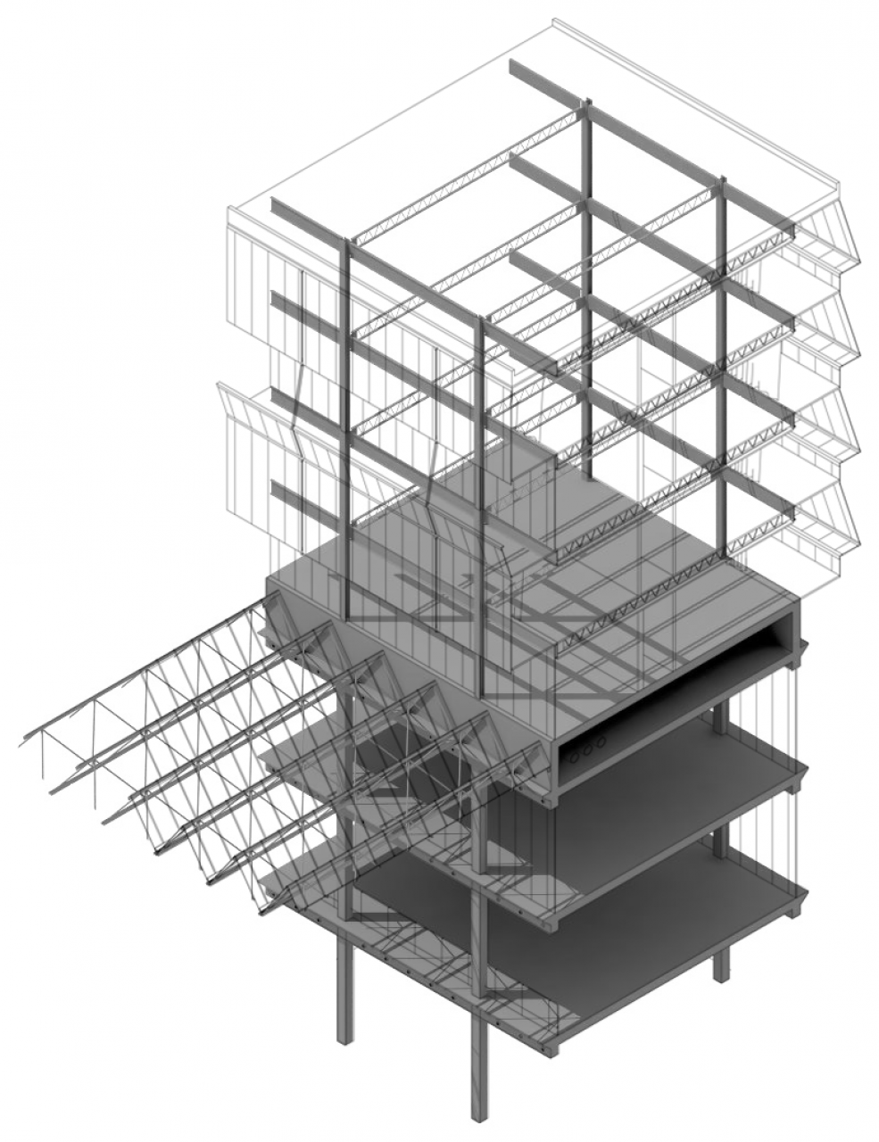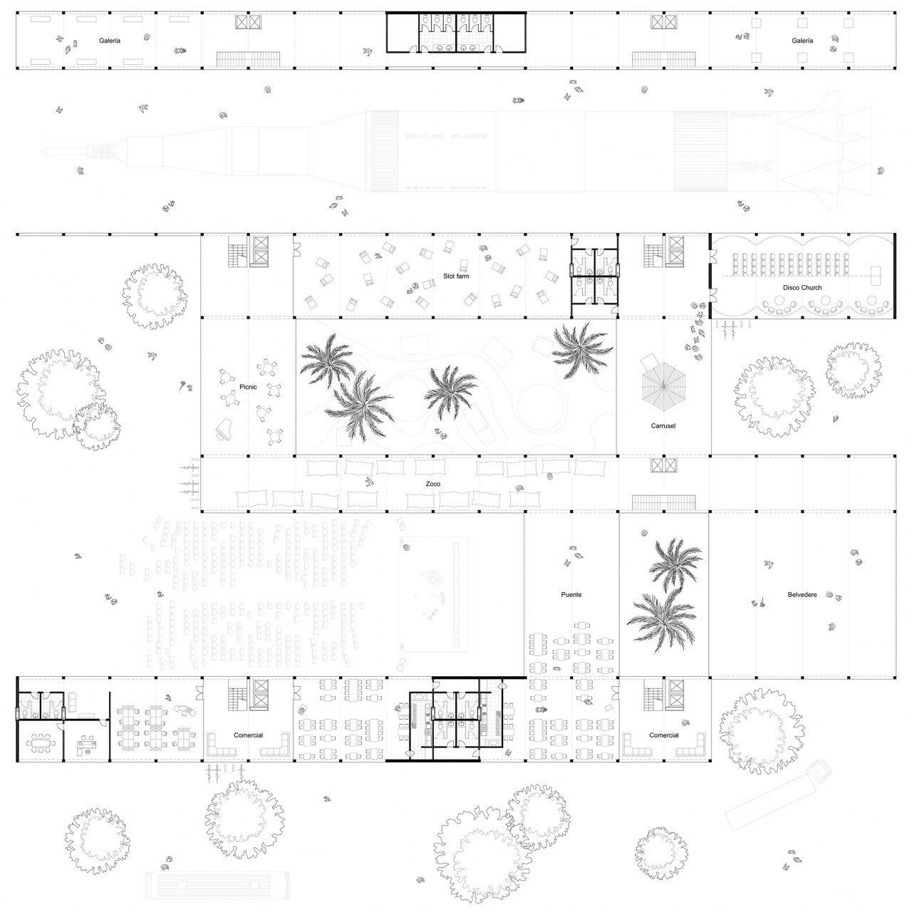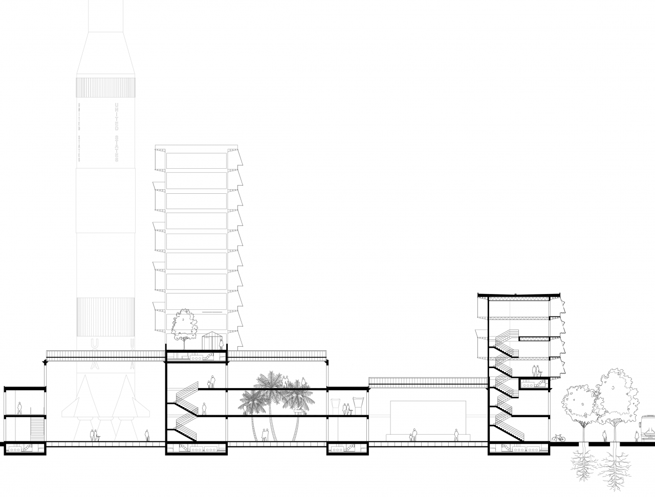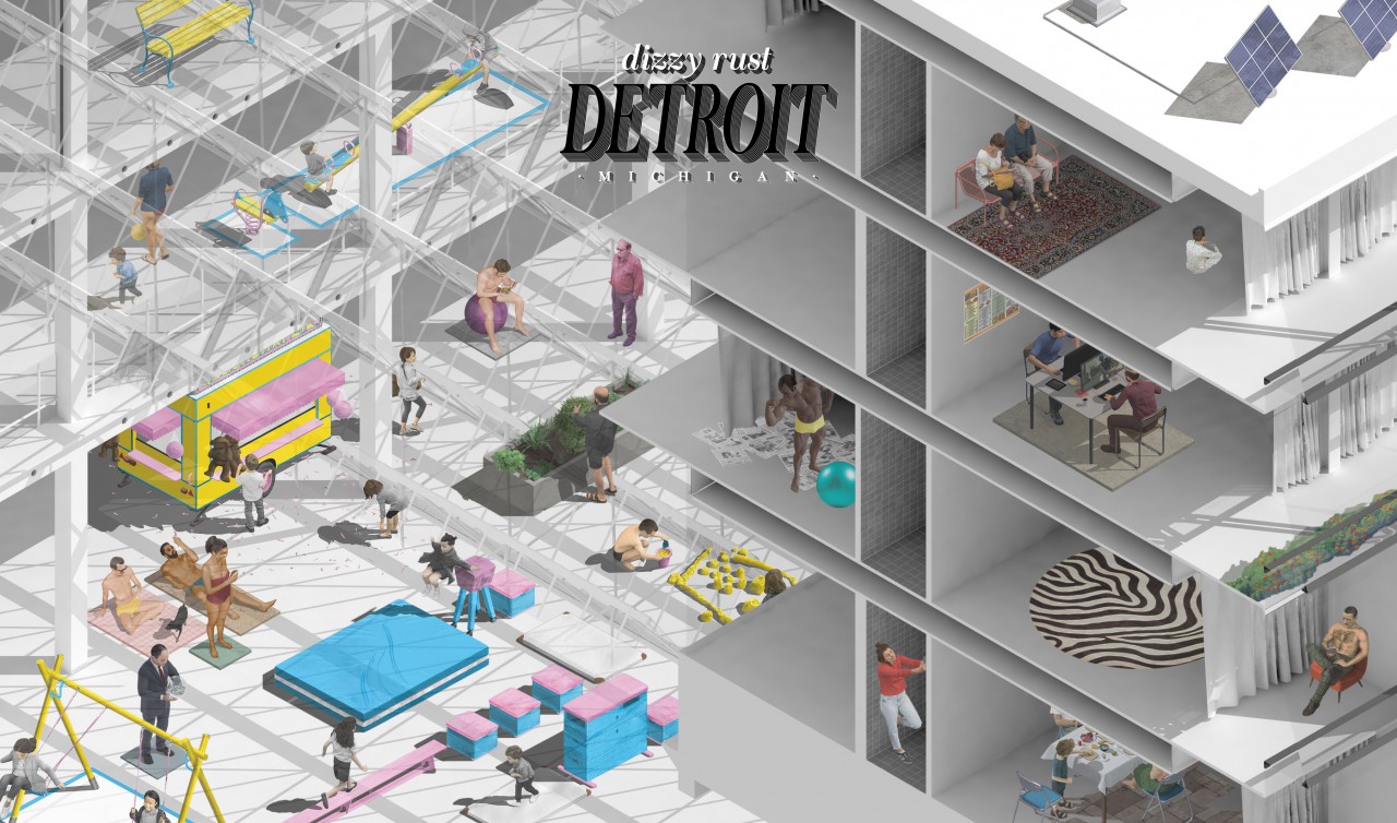 The project starts from the assemby of two previous case studies: Stirling’s Leicester University Engineering Building (industrial scale) and the Eames House in Los Angeles (domestic scale). A 10.000 sqm plot located in Detroit becomes the scene where both constructive systems join to create a high-density open building, capable of generating the support for a city by indefinitely replicating itself.