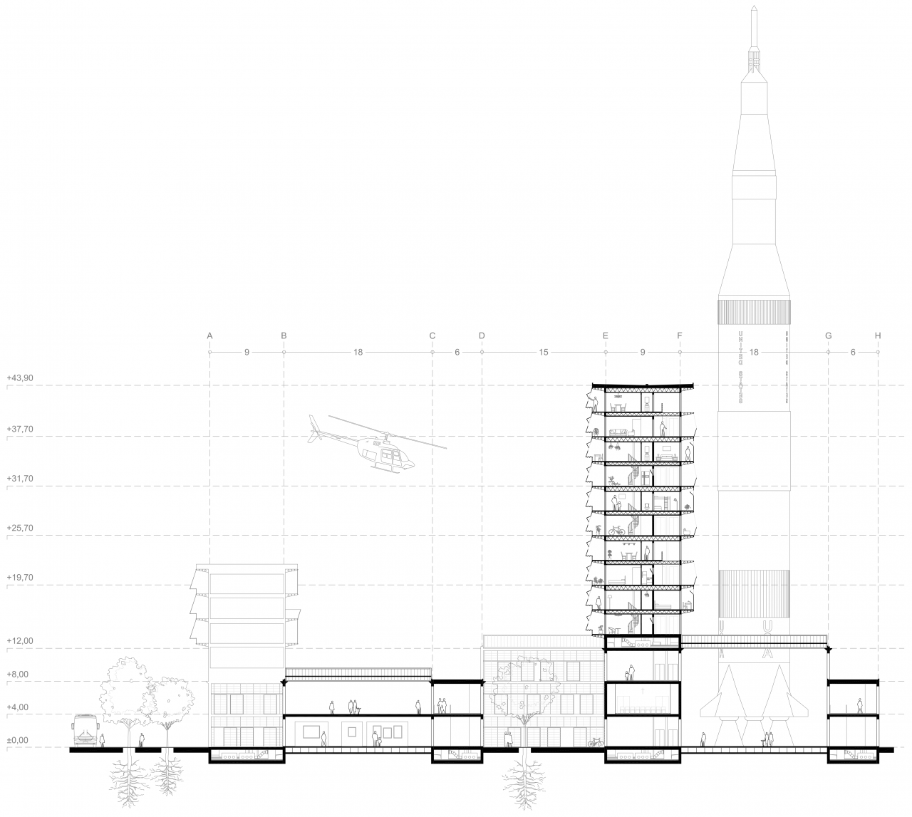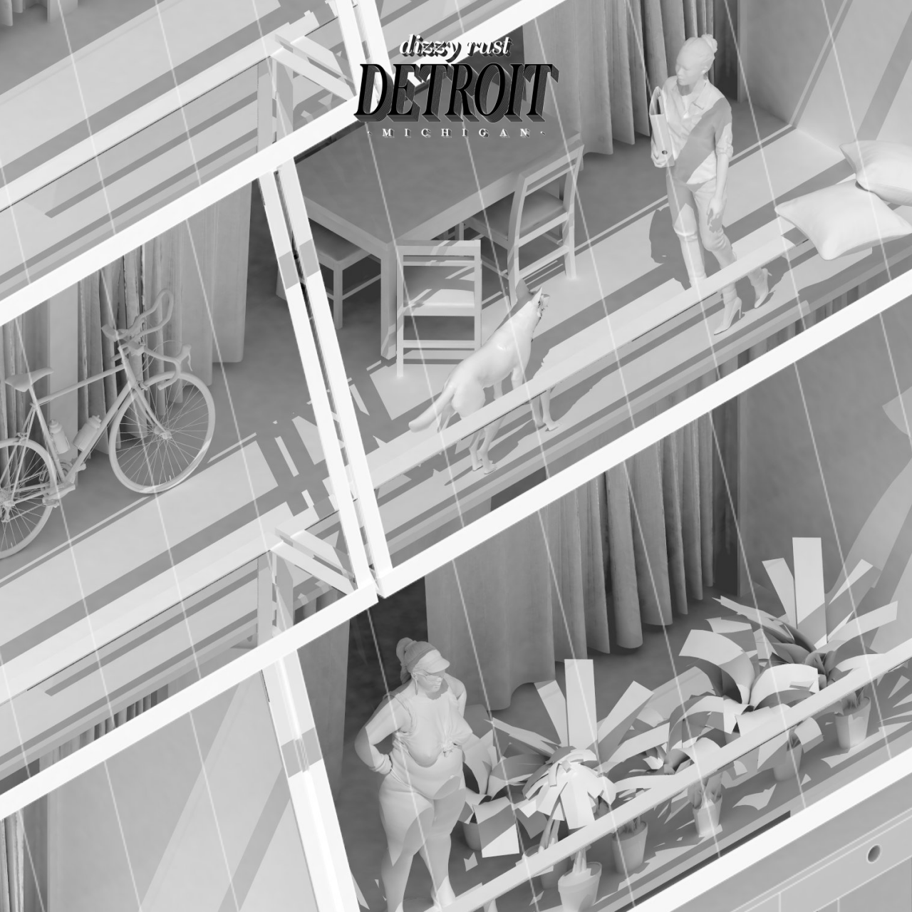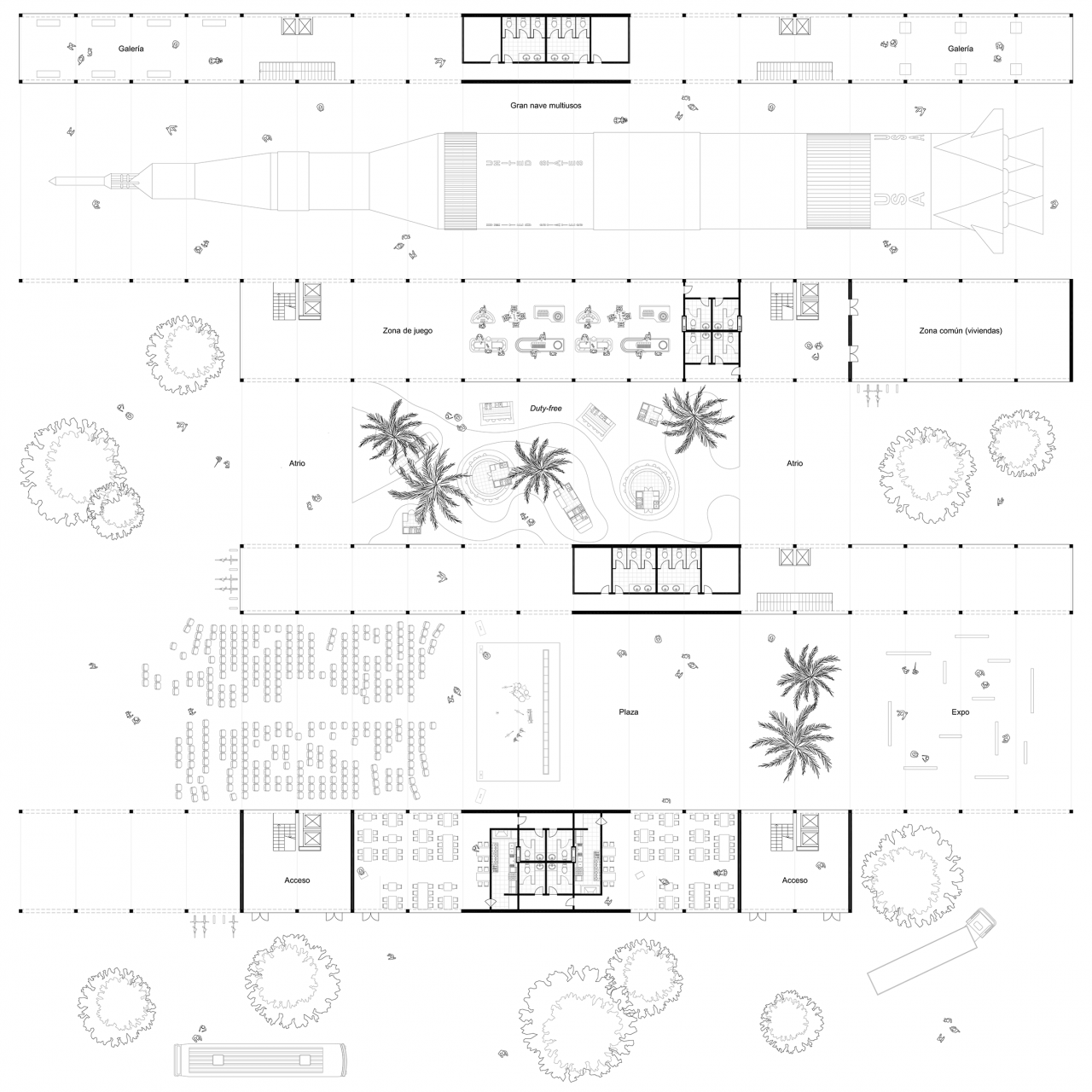 The project starts from the assemby of two previous case studies: Stirling’s Leicester University Engineering Building (industrial scale) and the Eames House in Los Angeles (domestic scale). A 10.000 sqm plot located in Detroit becomes the scene where both constructive systems join to create a high-density open building, capable of generating the support for a city by indefinitely replicating itself.