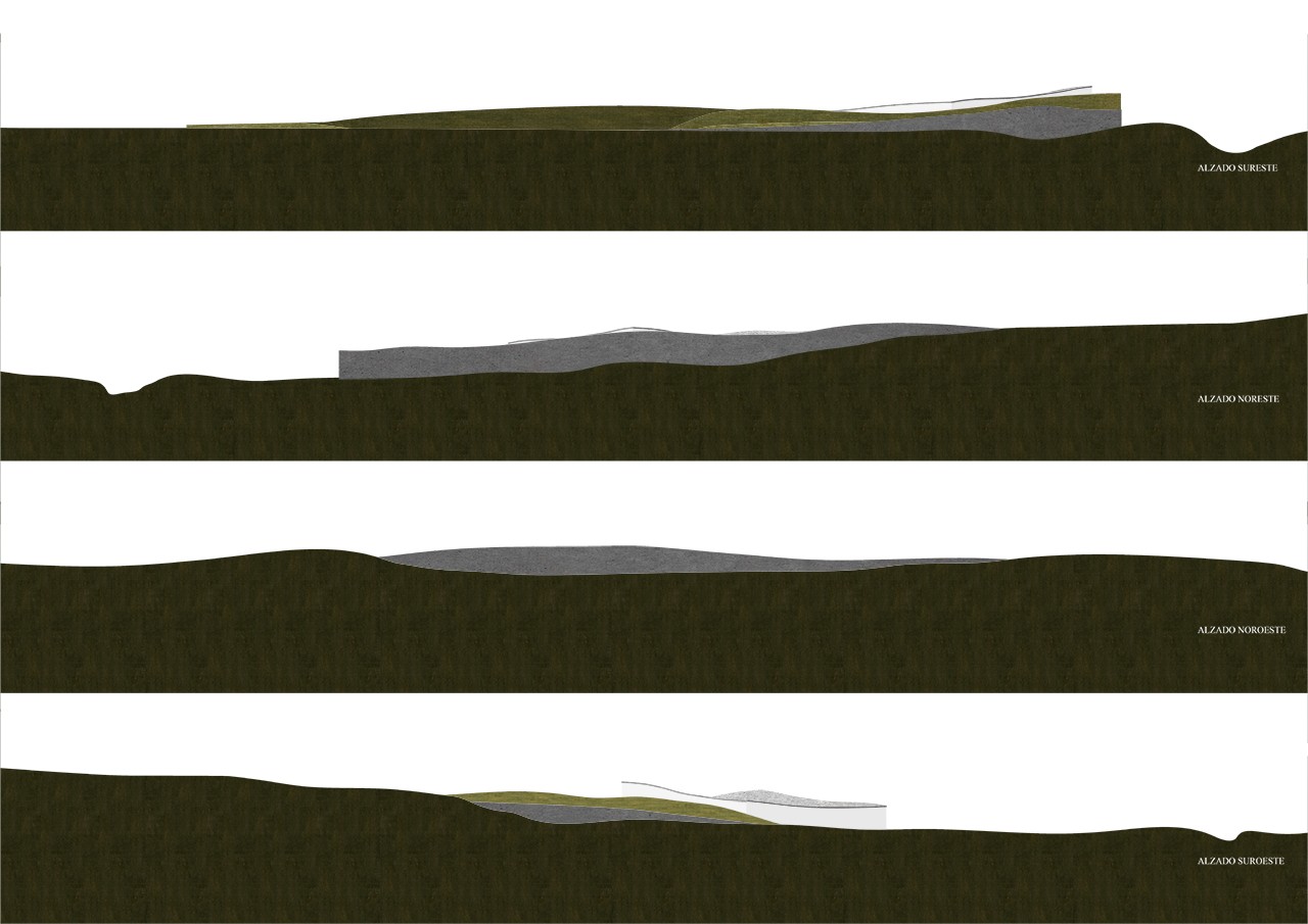 The idea for the project comes from its natural surroundings, taking as the starting point the hypothesis of space that would be created by transforming radically the site and it configuration, obtaining a result similar to a land art intervention. The operation is conducted in a rectangular perimeter, creating a contrast between the rigid regular limitations of the construction with the natural undulations of the land surrounding and the one who will be created inside. The ruins of the already missing Zoo are represented by some of its most significant architectural pieces designed by Javier Carvajal, and who rest both in and out of the new construction. Apart from that, the newly generated space have a new set of rules from the ones existing when the Zoo was still there, and the new buildings appear in between of the vegetation, as opposed to what happens nowadays. The only building in this new surface, dedicated to everything sports-related apart from playing outdoors, has an undulating roof to become camouflaged with nature. The only exception to this is the indoor track, which goes through the construction as a tunnel (illuminated with two patios).