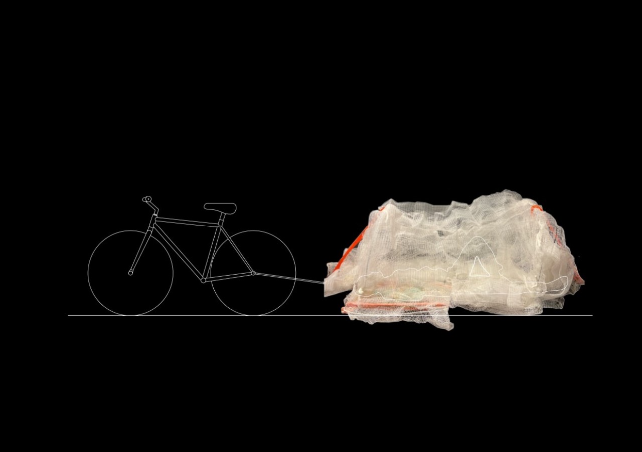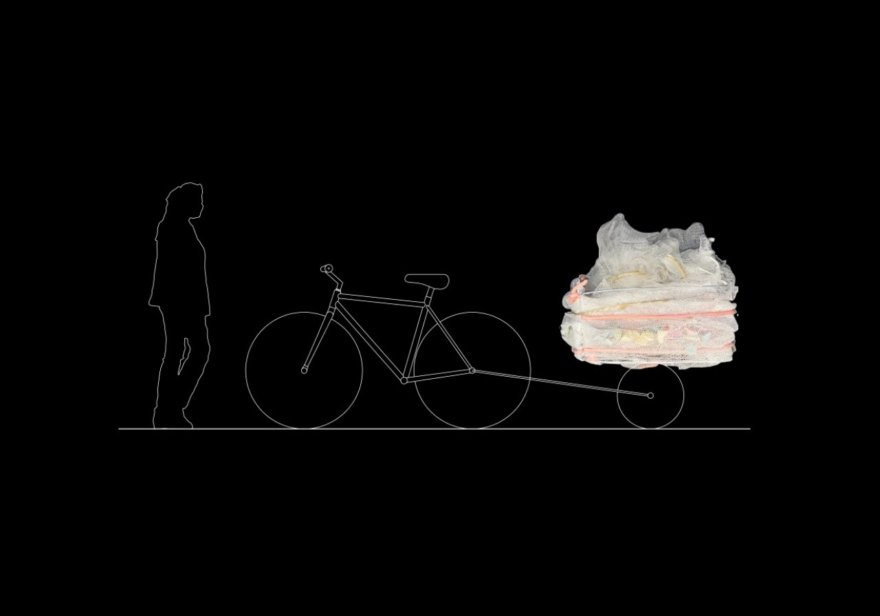 The interesting thing about this device is that it is made of nets found in the sea, inside which the amount of rubbish that the pilgrim finds along the way accumulates.