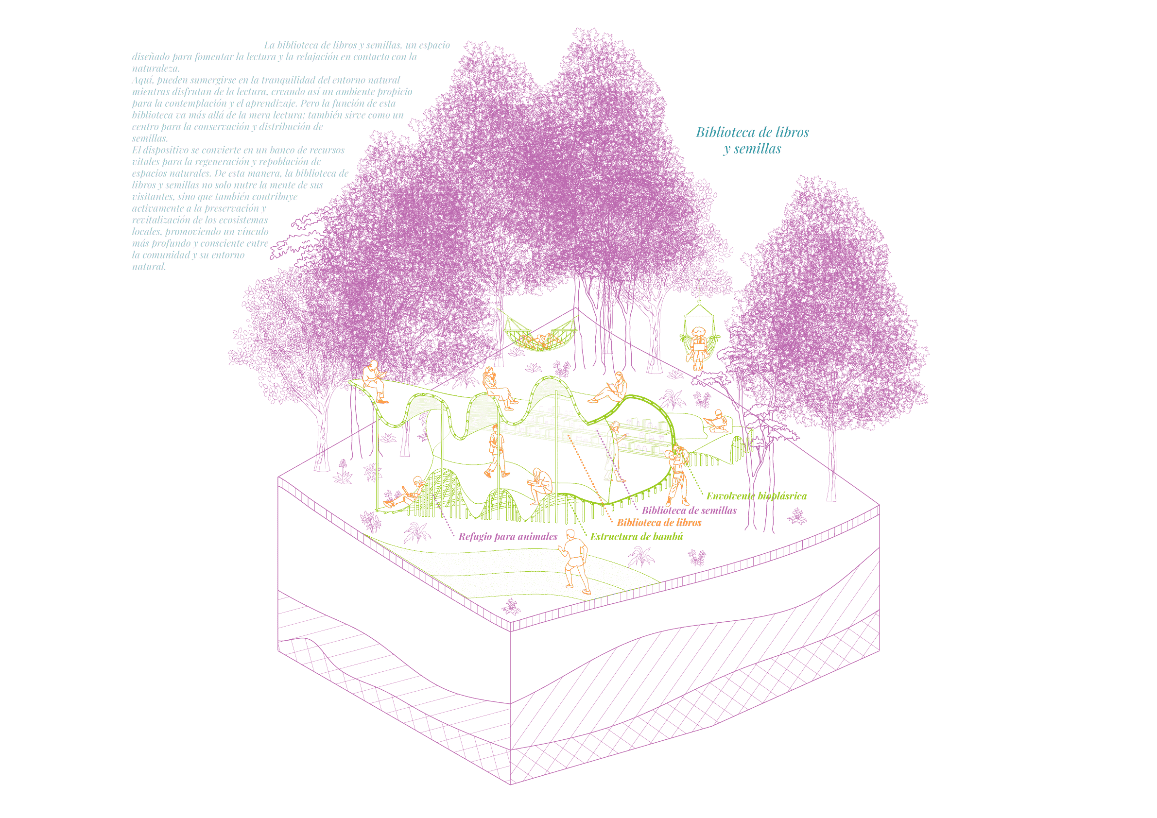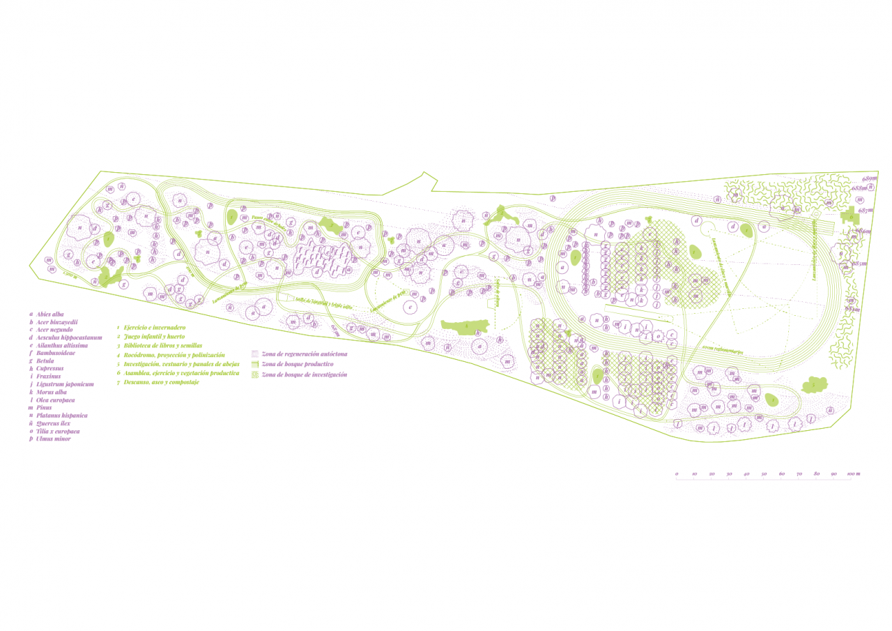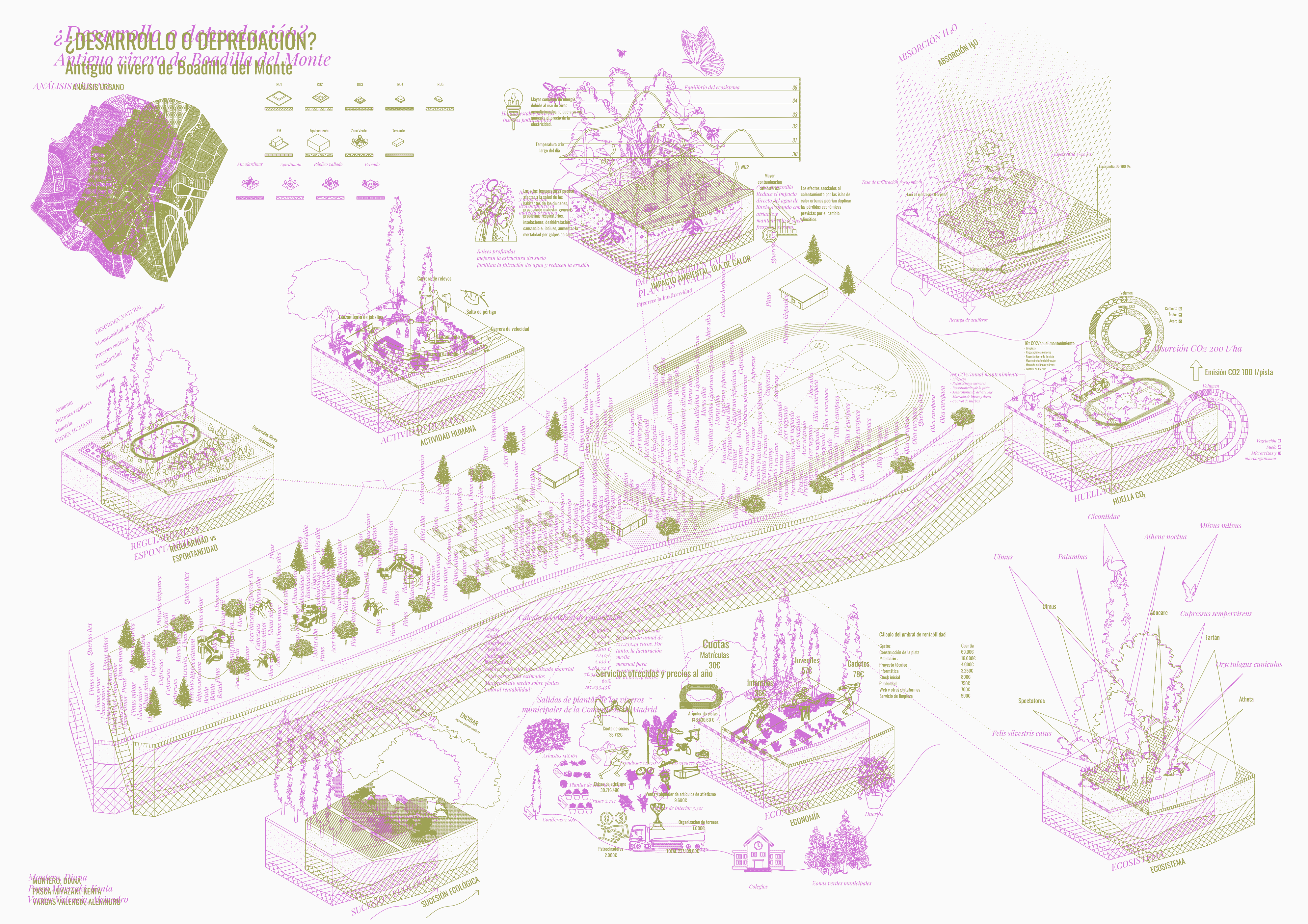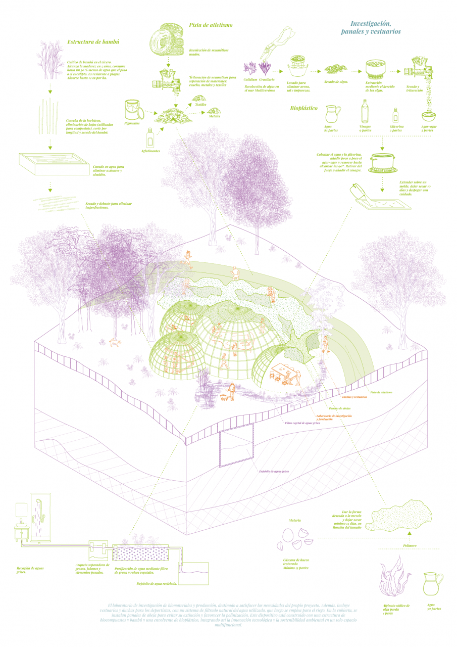 The Boadilla plant greenhouse, closed years ago, was reclaimed by nature with trees, plants, and wildlife. Now, the municipality wants to replace it with an athletics track, sparking environmental controversy. My project aims to combine both ideas: preserving nature and building the track. I proposed a design that includes the track without destroying the greenhouse, adding sports routes through the vegetation. I installed devices that promote community engagement, combining sports and nature. These include a pollinator climbing wall, a library of books and seeds, and a lab with showers that recycles water. The devices, made from biomaterials like waste-based biocomposites and algae-based bioplastics, foster ecosystem circularity. Among the biocomposites, I used eggshells, coffee grounds, and aromatic herb residues, and the algae-based bioplastics serve as coverings for the devices. Thus, I transformed an abandoned site into a sustainable future vision that combines nature and sports.