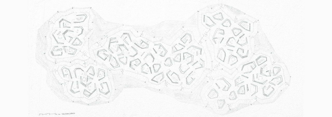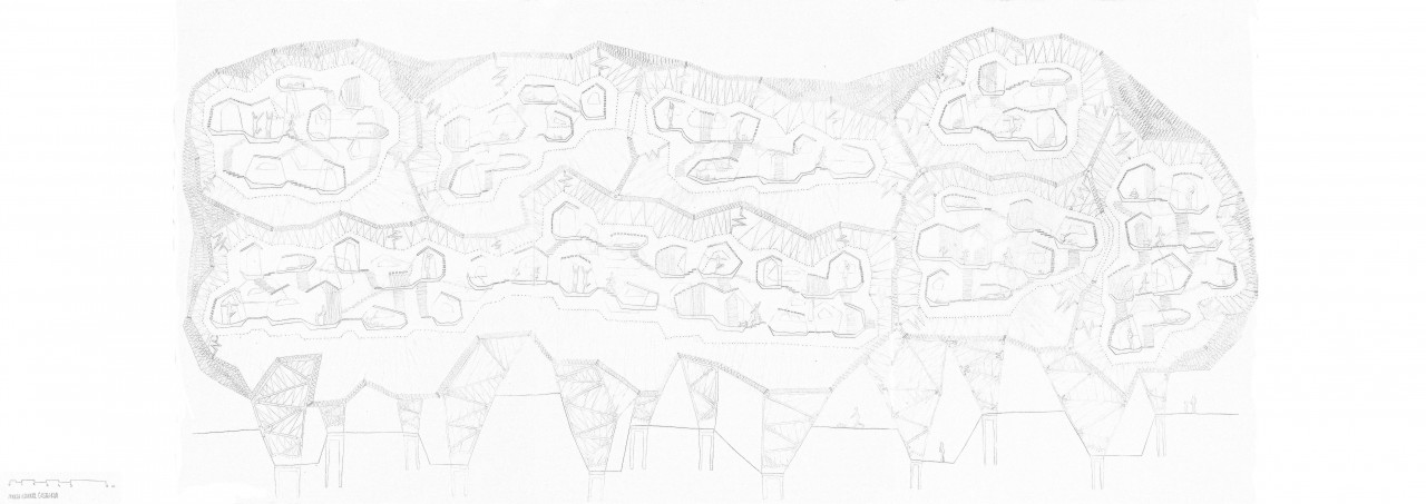 Through the superposition of layers I have come to design a building that is characterized by having a chaotic wired structure consisting of one hundred individual habitable capsules, exterior connections surrounding the building and a facade made of porous organic modules with vertical gardens.
