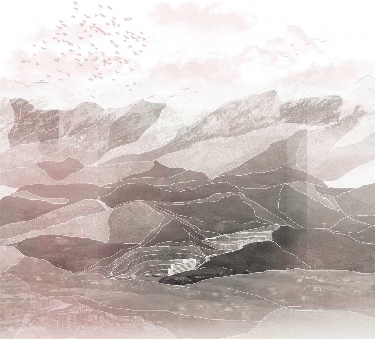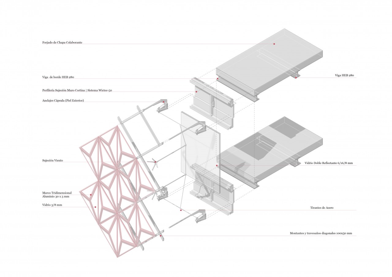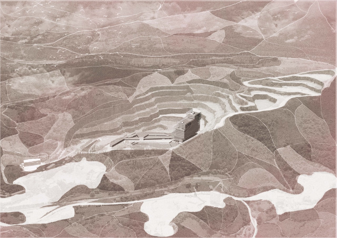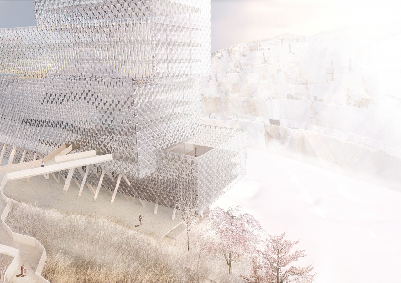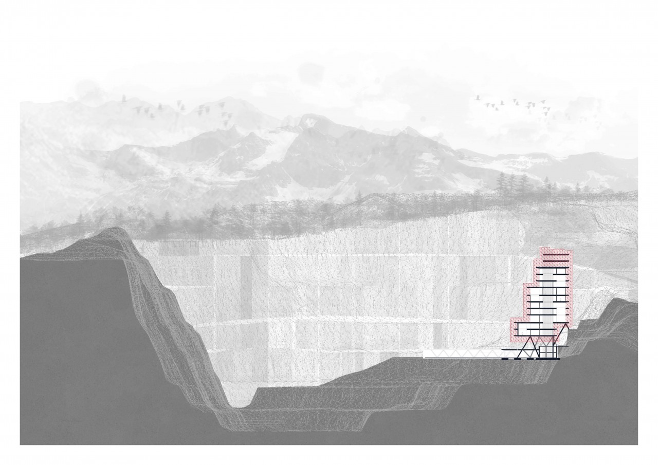 The upper layers are wrapped in a three-dimensional waterproof capsule that seals and protects the building and its specific program. The mineral reflections of the quarry on the facade, achieve the mimicry with the environment.
