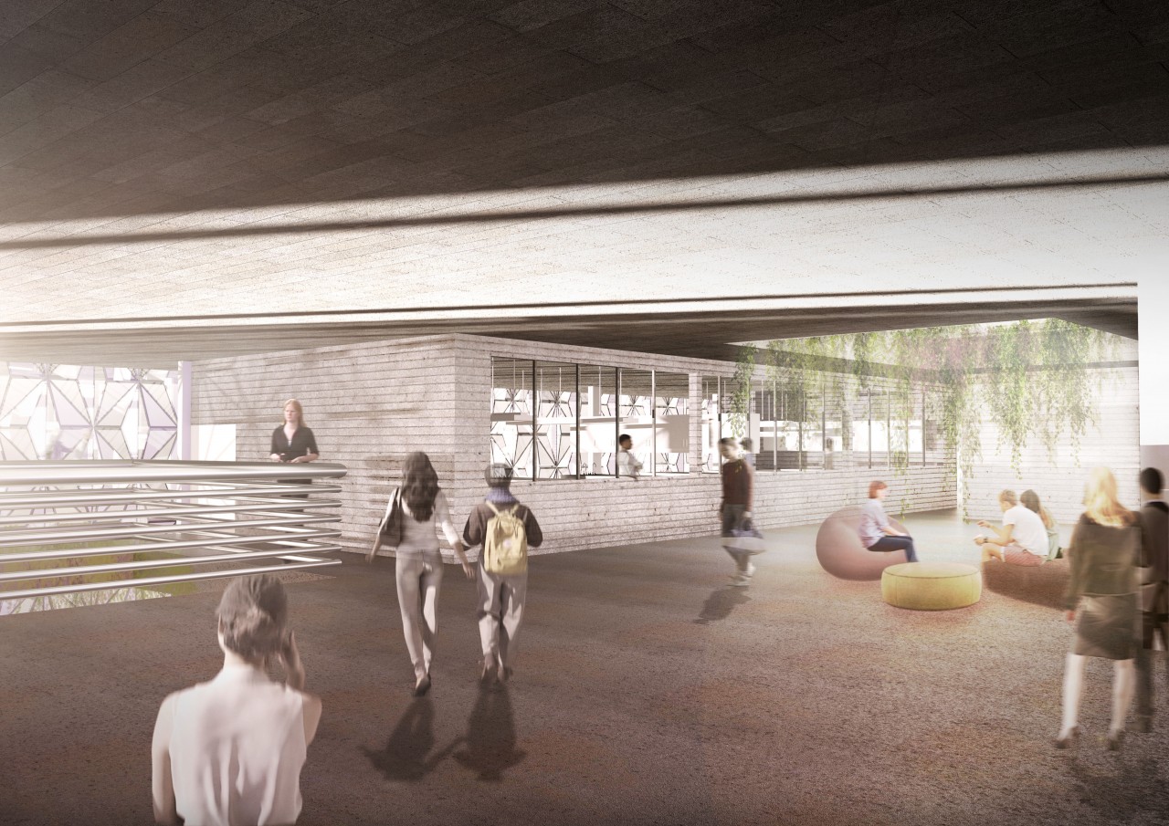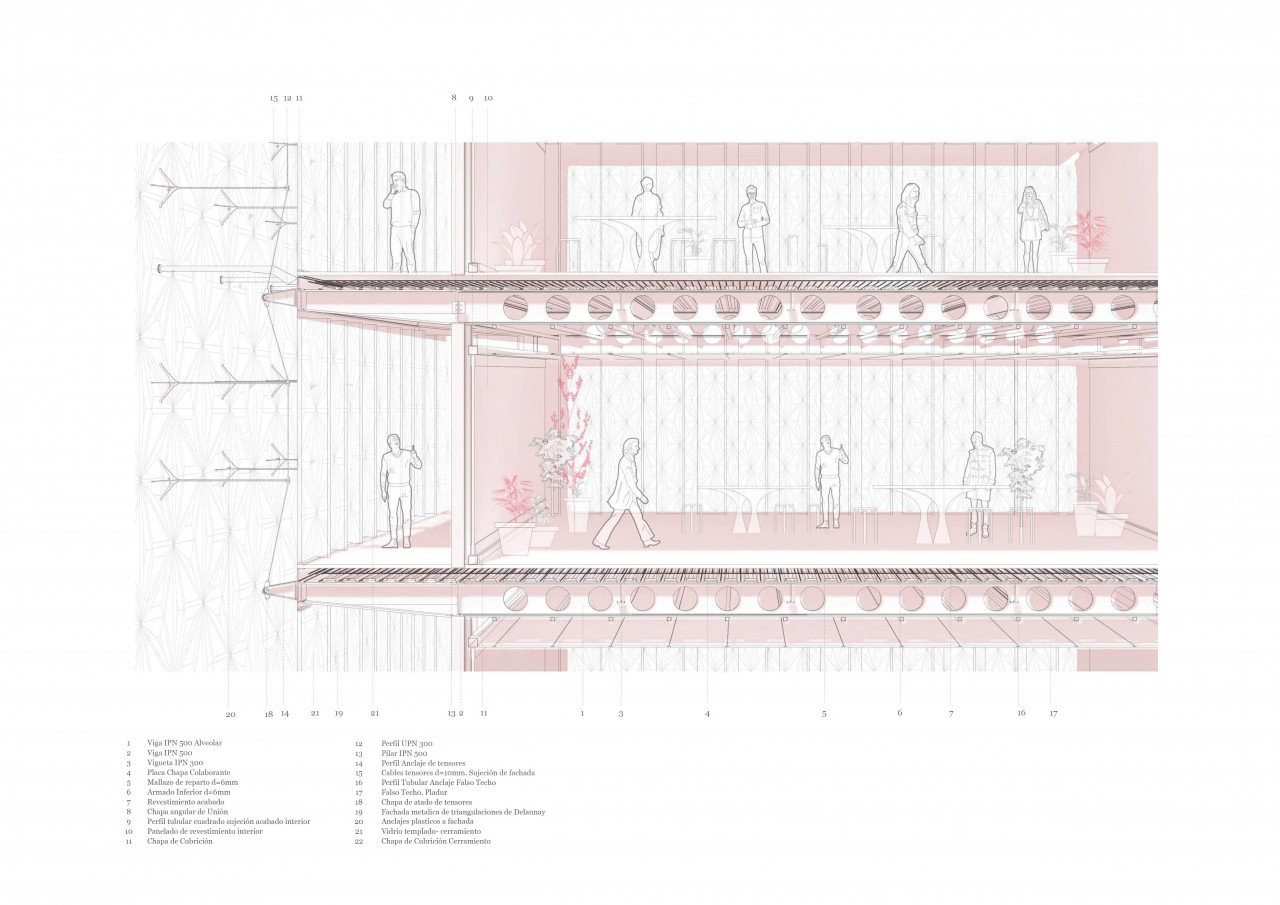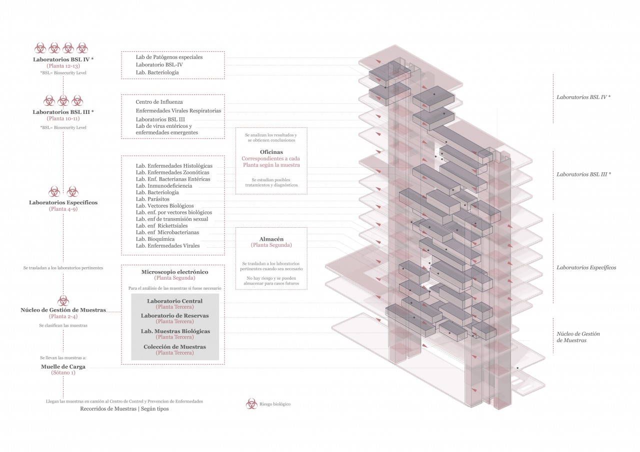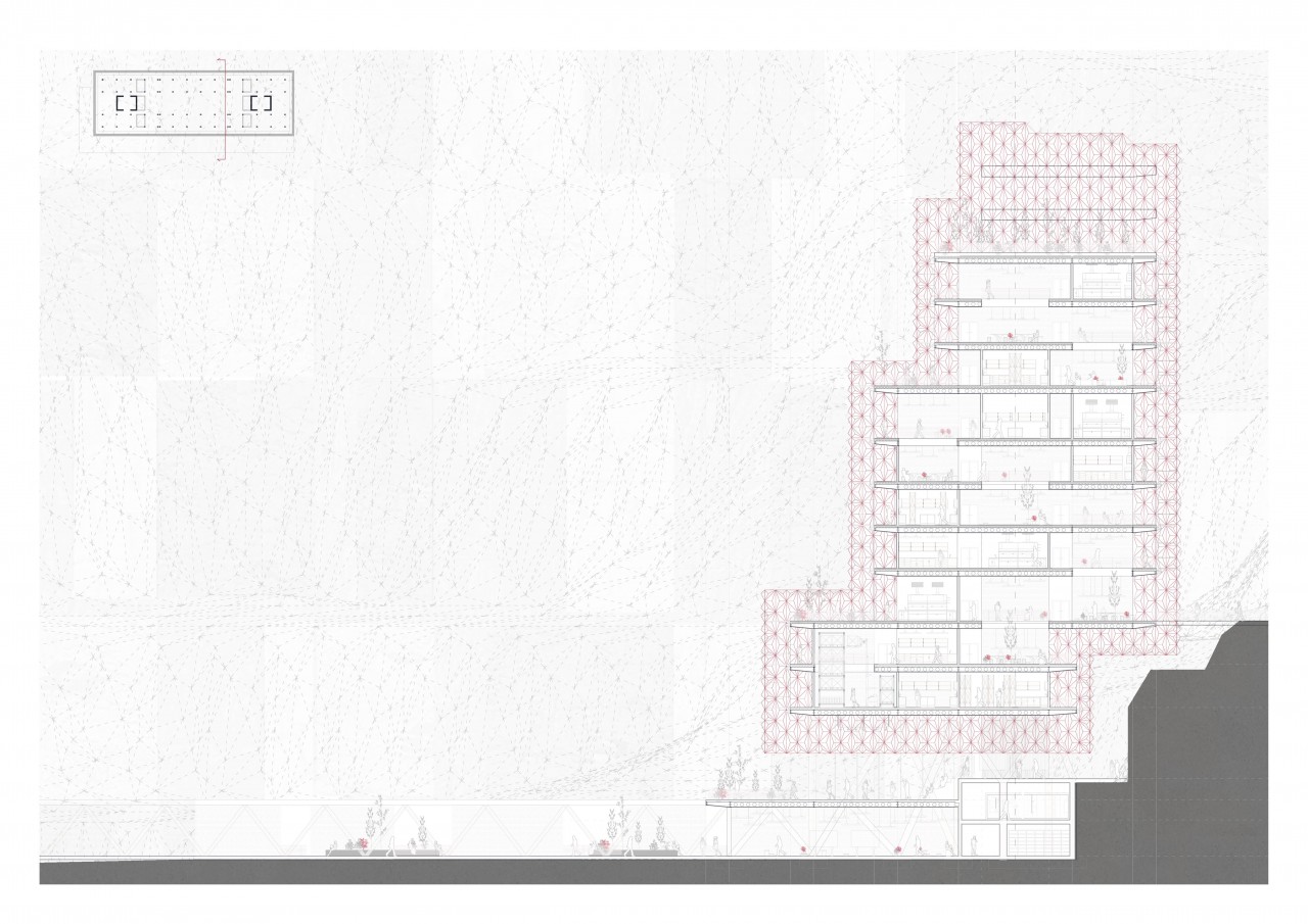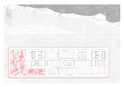 On the other hand,the land acts on the building in section on the upper strata, hosting the laboratories.