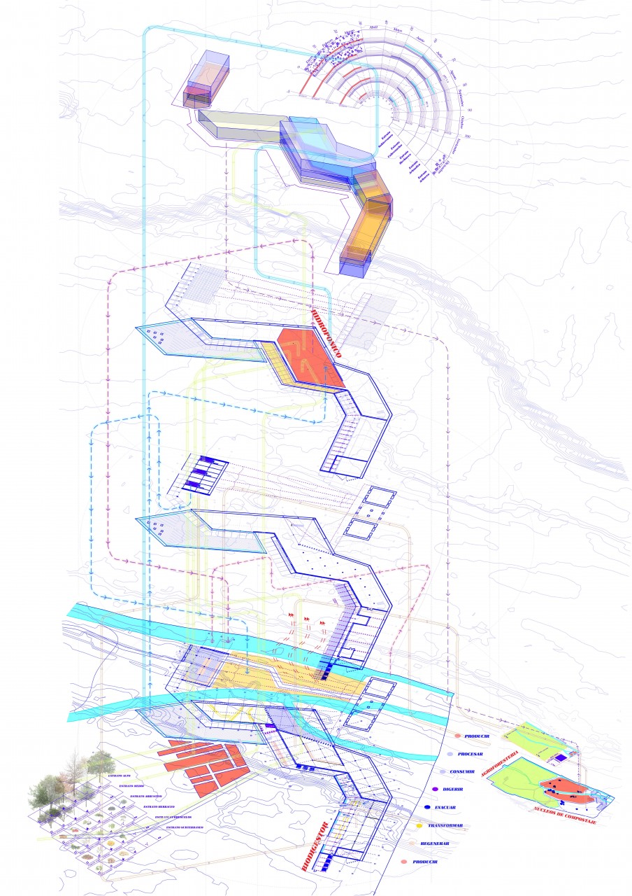 The territory is progressively transformed through the practice of agroforestry, proposing an edible forest paired with productive gardens and aquaponics systems, where production and regeneration coexist. The cycle of PRODUCE - PROCESS - CONSUME - DIGEST - EVACUATE - TRANSFORM - REGENERATE is the heart of the project and is tightley intertwined both with the bulding program and its spatial organisation, as well as all the agents interacting with it, representing a cycle that could be extrapolated to any organic process.