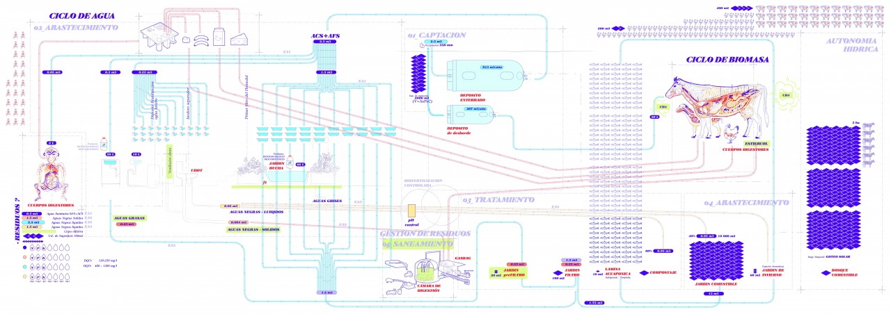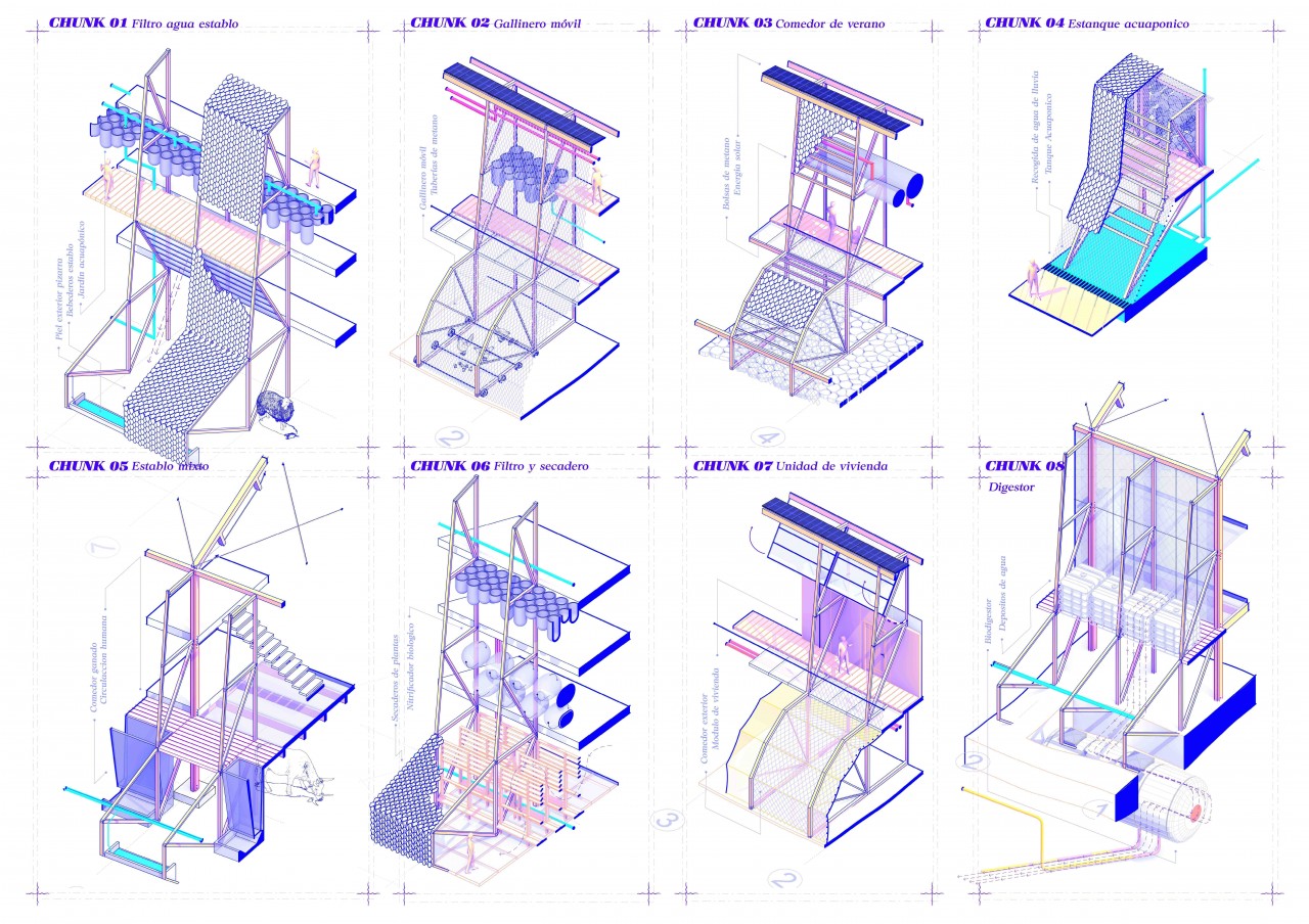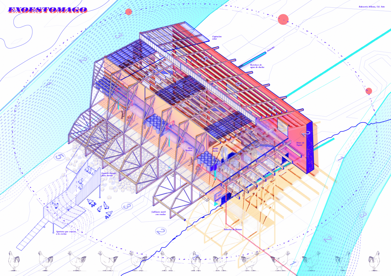 EXOESTÓMAGO responds to the traditional extractive model, where the process of production consumption and waste are conceiled, by proposing a new way of building where urban clusters become not a set of isolated buildings, but a multispecies metabolic organism. The project forms part of an agroecological cooperative inhabited by a hundred people in the territory of León, where each bulding becomes a micropowerplant that exposes its internal functionalities. Exo-stomach responds to the alimentary necessities of the cooperative and sevres as an example of green agriculture practices.