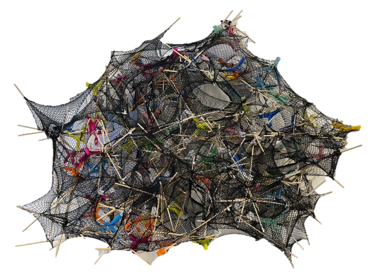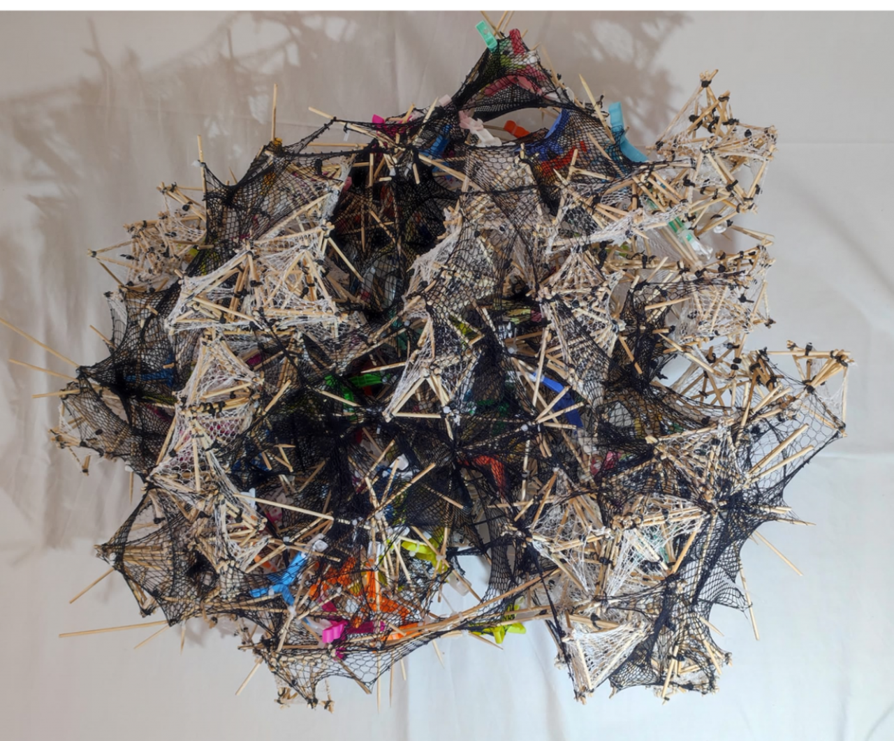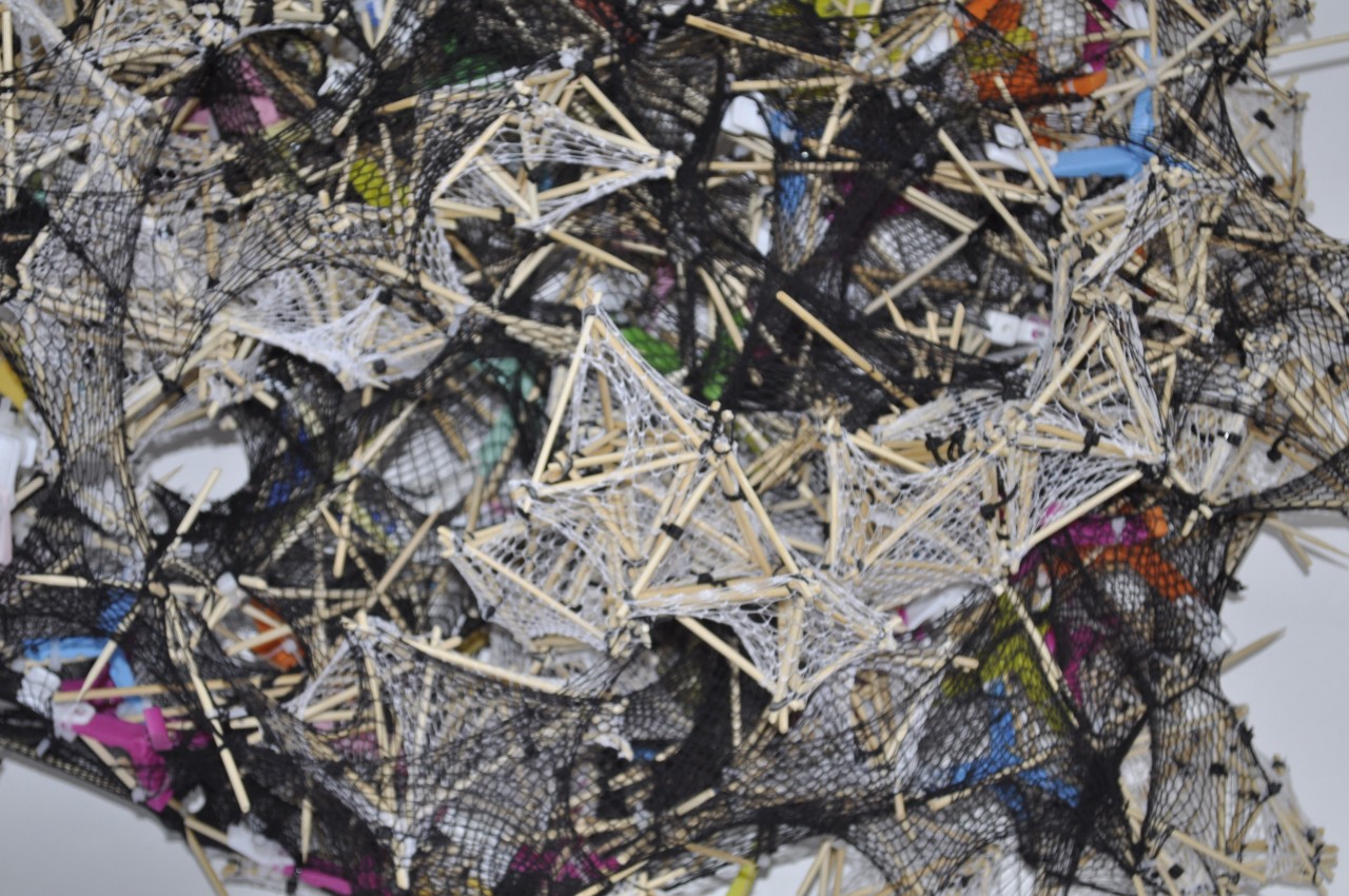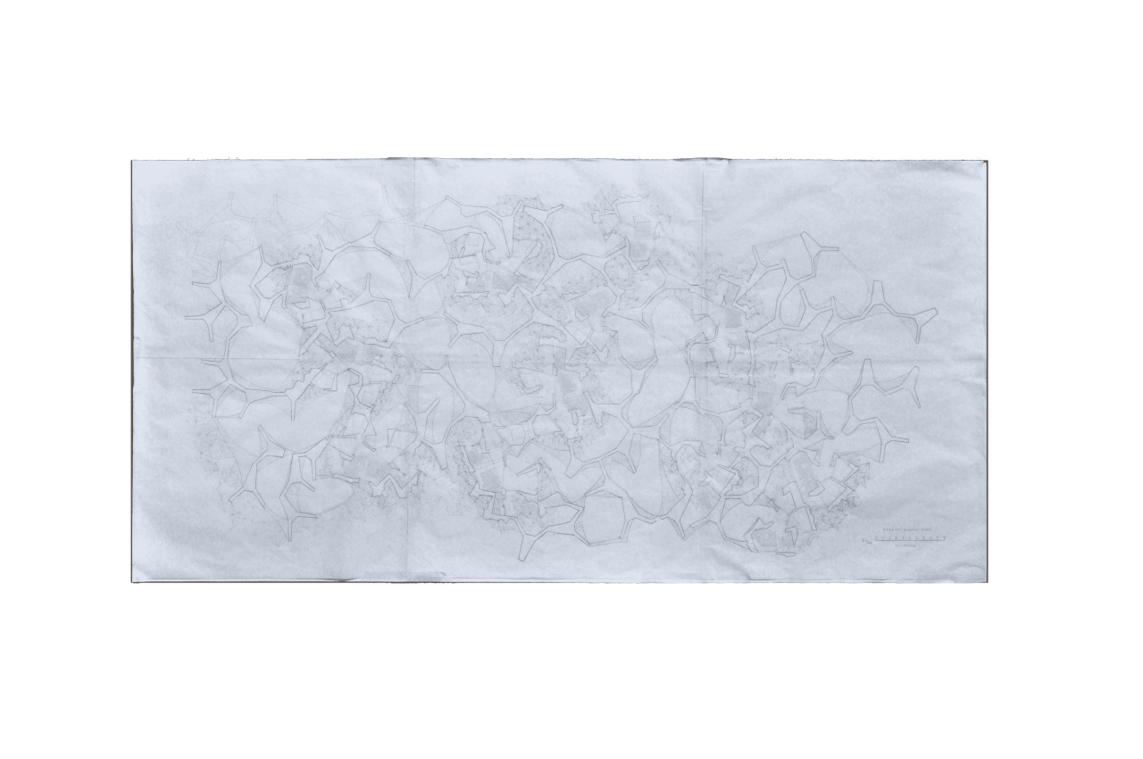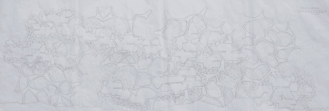 tetrahedra which wrap the habitable modules. This modules are composed os two terraces that connect bathrooms (as the main area of the house) and bedrooms or common rooms. In addition, the common spaces are not at the same height, they create a topography inside and are divided by an interior mesh that forms a world of cobwebs.