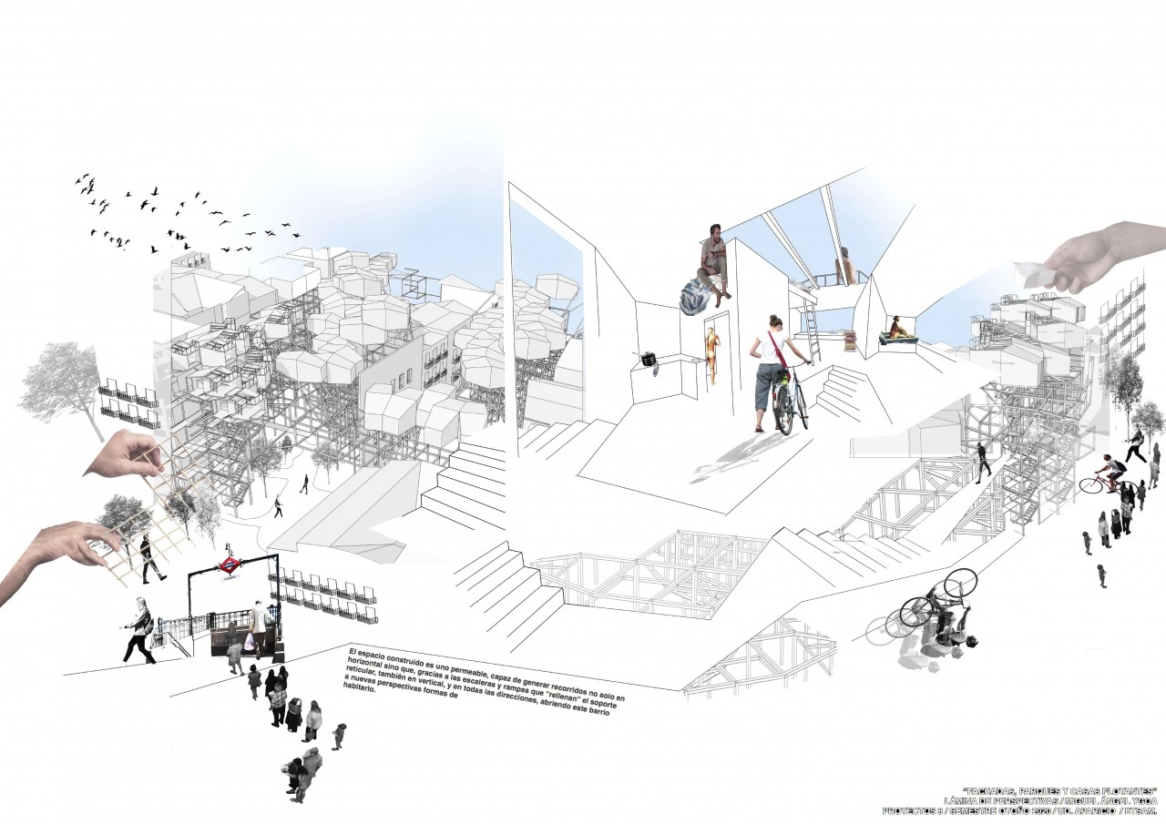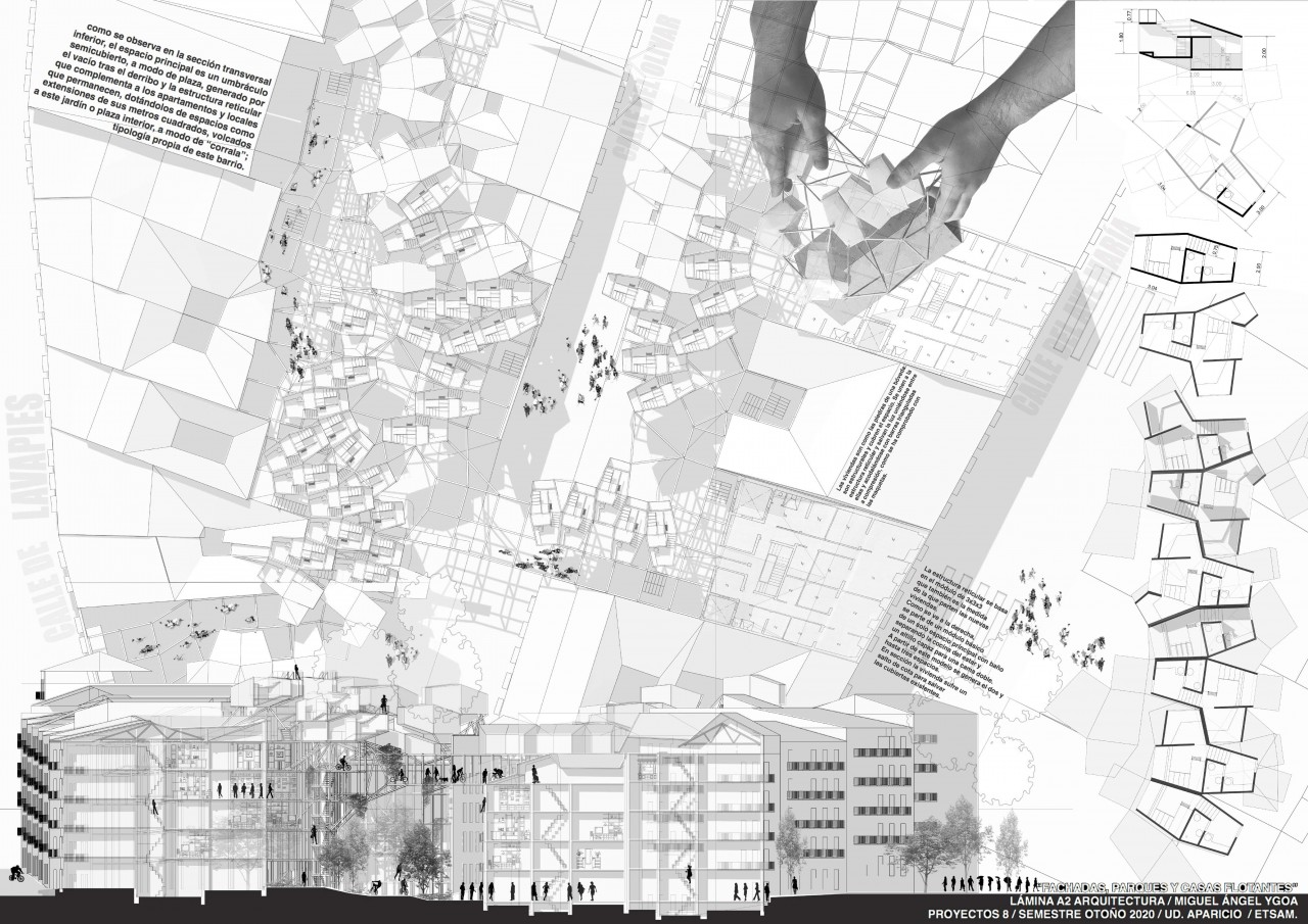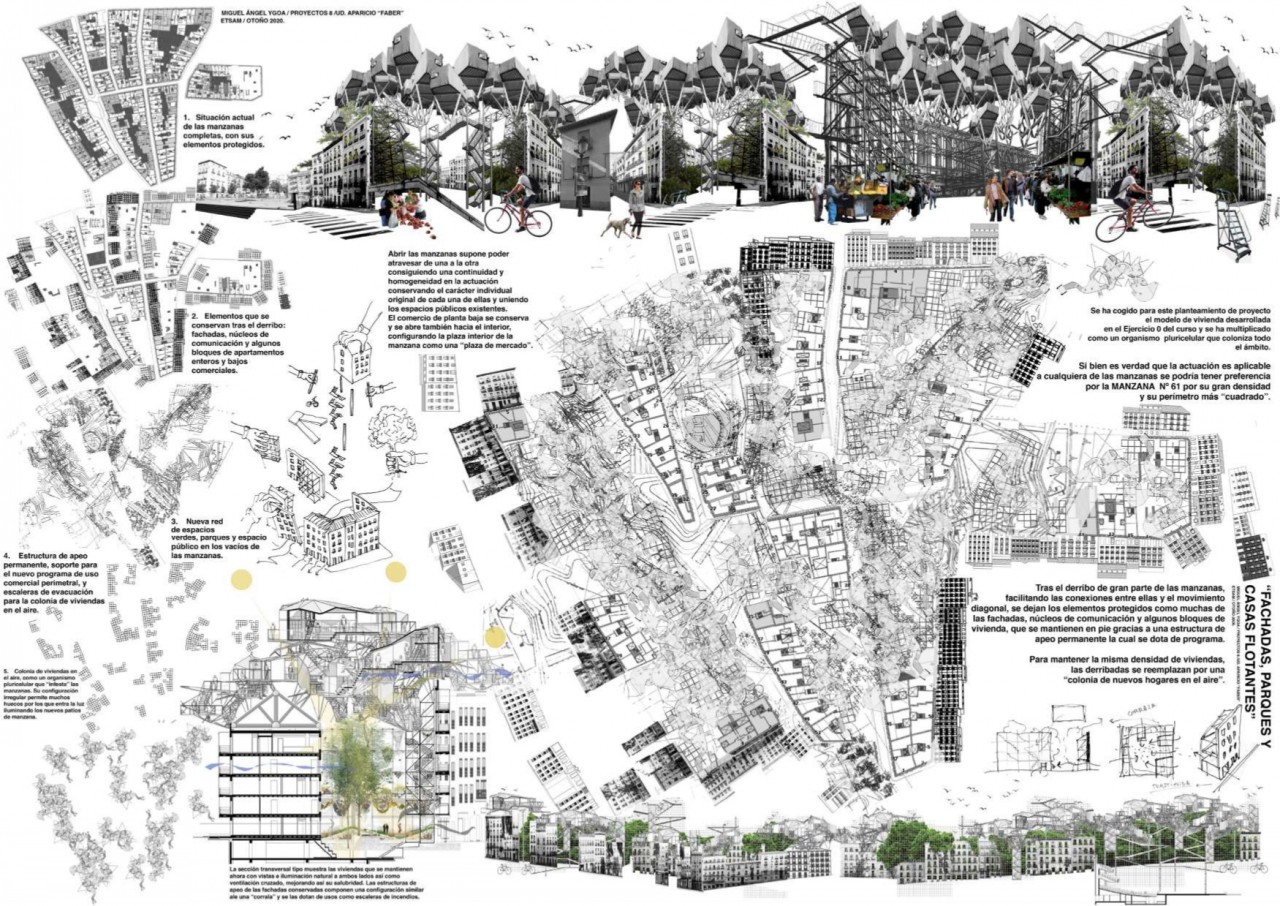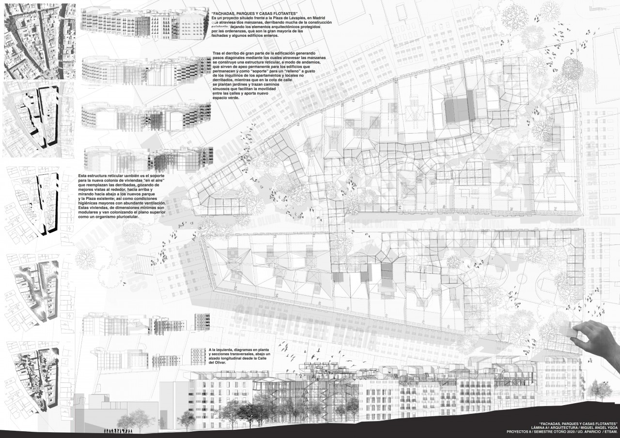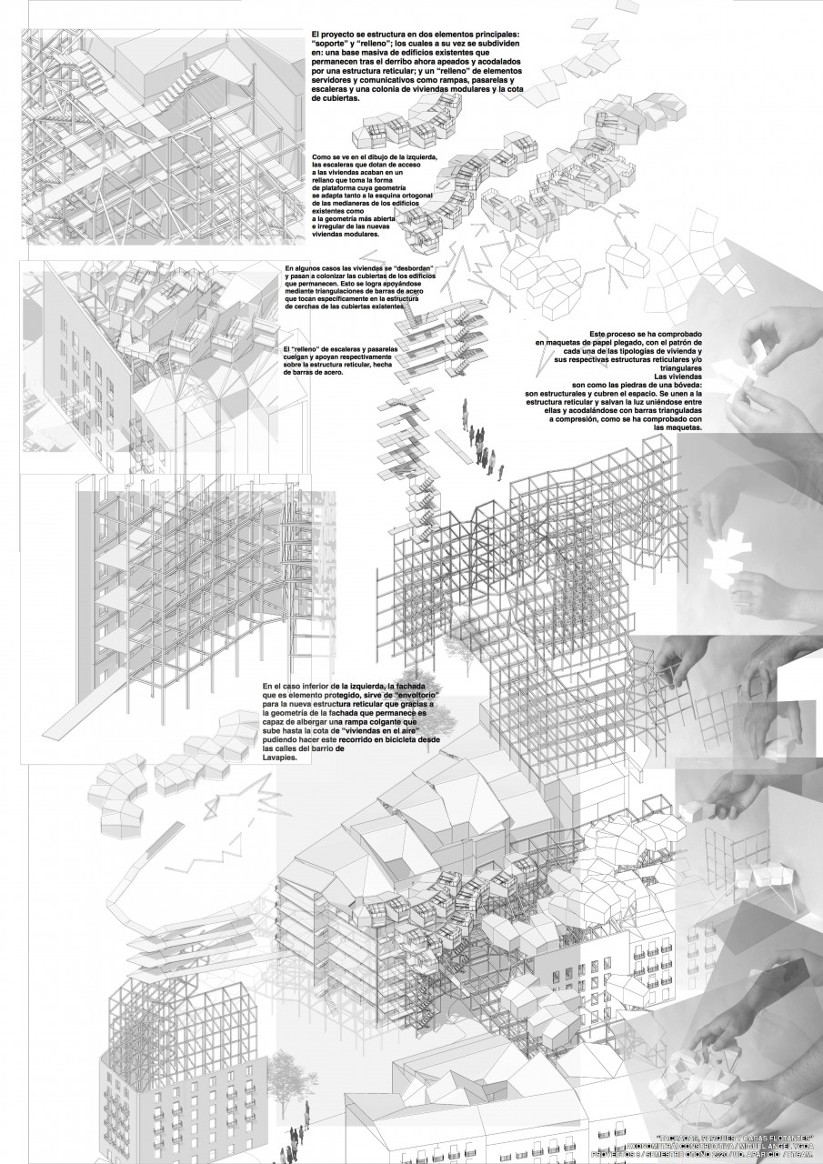 Tras un análisis de Lavapies se suprimen los elementos no protegidos dejando en pie muchas de las edificaciones antiguas y numerosas fachadas conservando la identidad del barrio; abriendo pasos diagonales a través de las manzanas. Las construcciones que permanecen se apean con estructuras reticulares de acero que servirán como soporte para las viviendas nuevas que sustituyen a las derribadas. Se libera así la movilidad conectando calles y plazas, dando lugar a parques y jardines públicos, con un nuevo mundo de viviendas que nos sobrevuelan.