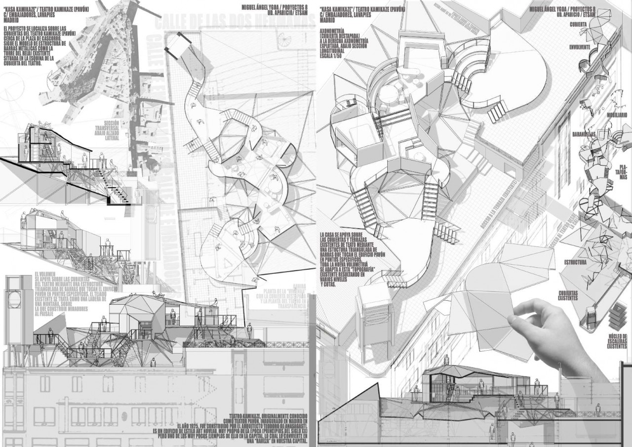 Comenzamos con un habitáculo de 100 m3 en un lugar a elegir. Me coloco en la azotea del Teatro Kamikaze. Sobre ella se proyecta un volumen irregular cuya estructura triangulada se posa sobre puntos estratégicos de las terrazas y cubiertas a dos aguas, como si de una ladera de montaña se tratase. Esta forma de habitar los tejados de Lavapies esquivando sus obstáculos y respetando su contexto se aplicará más tarde al ejercicio principal, así como la estrategia de superposición y el esquema “soporte y relleno”.