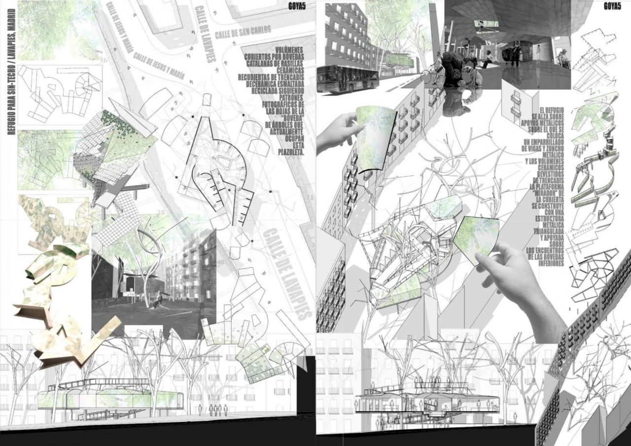 El segundo ejercicio, ahora de 300m3, es un refugio para sin-techo;colocado en el cruce de varias calles. Se levanta un volumen sobre patas para mantener la circulación diagonal y cruzada de la plaza inferior y, al igual que el ejercicio anterior, salvando los elementos existentes, se proyecta una volumetría completamente atada a su contexto.
