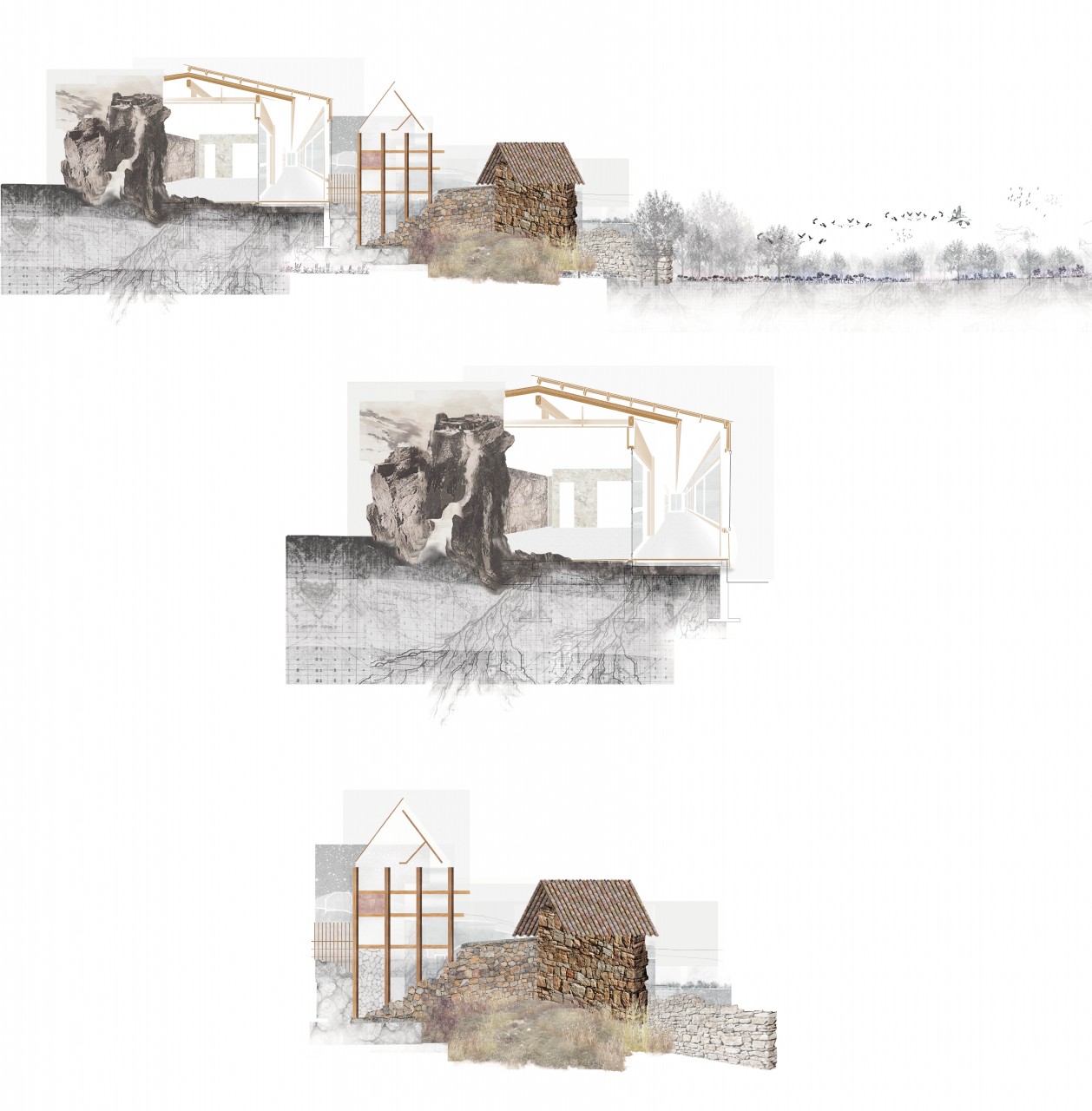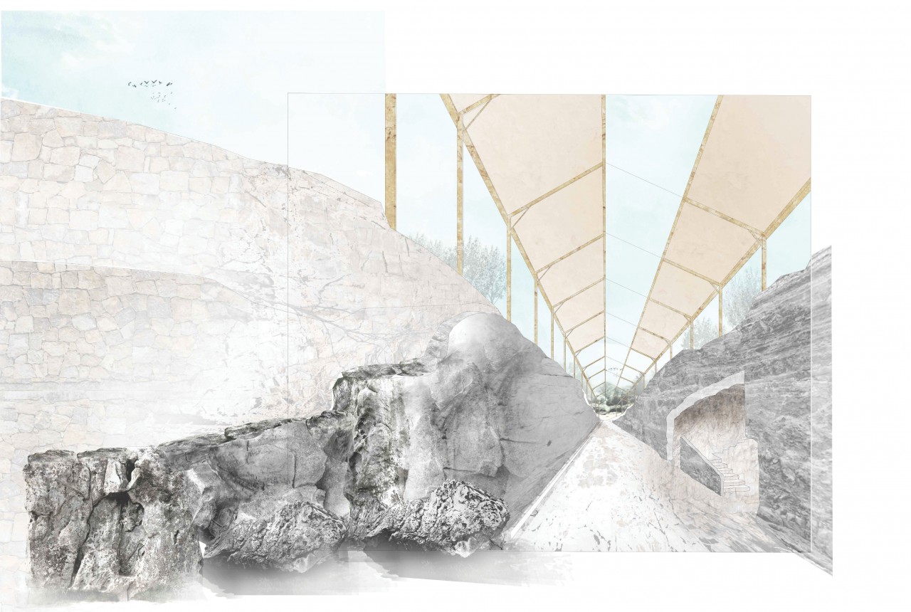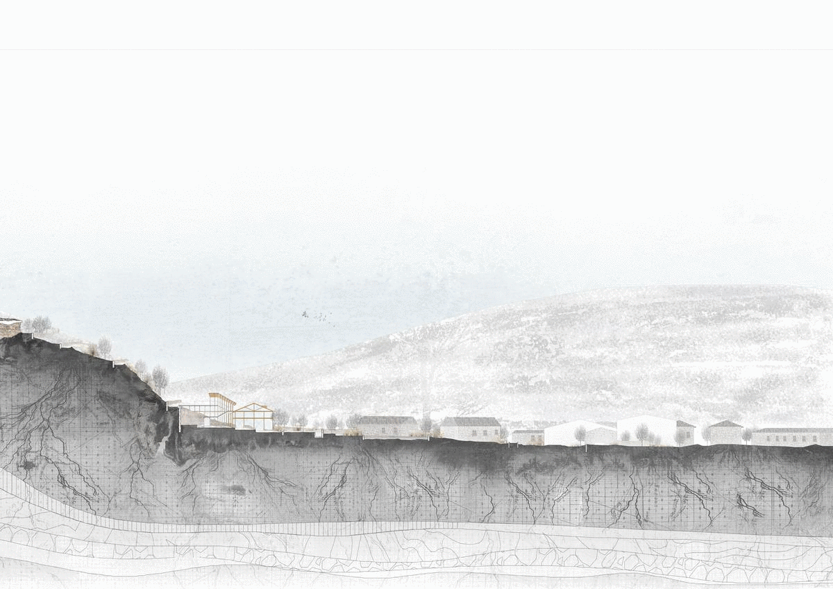 The valley, the flora and fauna, the topographical variety and the existing buildings’ characteristics function as the material palette from which the project is derived. The buildings in the project react to the natural silhouette of the hills and mountains, sometimes echoing it, other times mirroring or contrasting it. They are made of two languages – Heavy and light. The heavy language’s syllables are the local rocks and soil, exposed and become an integral part of the Architecture, to which the typical, local stone-walls connect. The light language’s forms derive out of the existing building typologies of Segovia. It is one of wooden beams and glass – local, low-cost and environmental-friendly materials. and allow light to wash the rocks and coves, emphasizing the eroded layers of the rocks by floating over them.