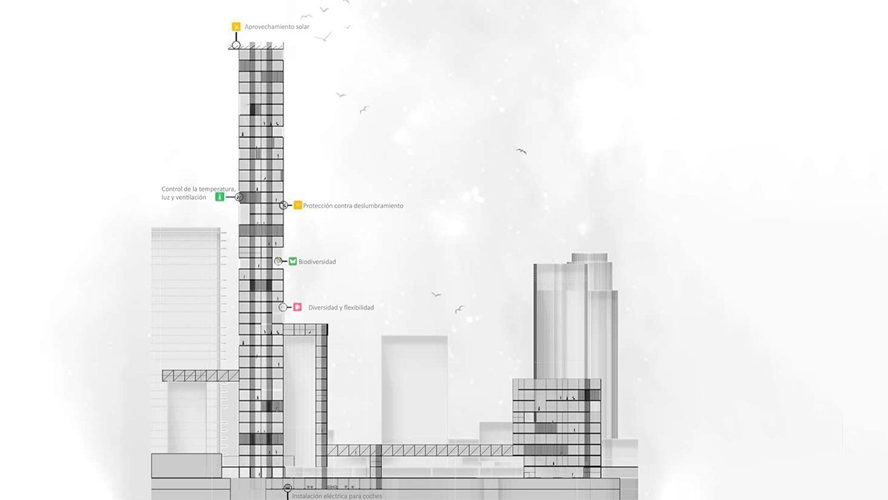 The main sports part is raised at the other end, having as reference the ‘Pabellón Maravillas’ of Alejandro de la Sota. In this space, a rhythmic gymnastics pavilion, a space of music, photography and dance, a gym, recreational space for children and finally a solarium are proposed from top to bottom. All this will be connected by a corridor, which in turn will be a viewpoint towards the green area of AZCA and will allow movement on foot and by bicycle. This corridor ends in an elevator that allows access to the parking area of the tower, which has electrical installation.