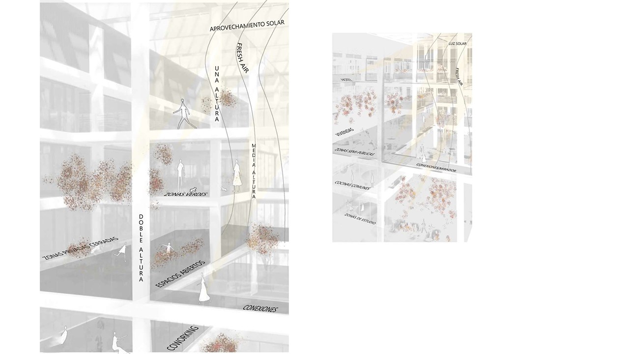 Having as reference two buildings of MVRDV, IF Factory and Koolkiel, a façade is proposed that exhibits the interior modularity on the outside matching the façade line with the structural, composed of a system of slats on the internal face that allow the control of light and ventilation of the entire building, without breaking with the appearance of the facade itself.