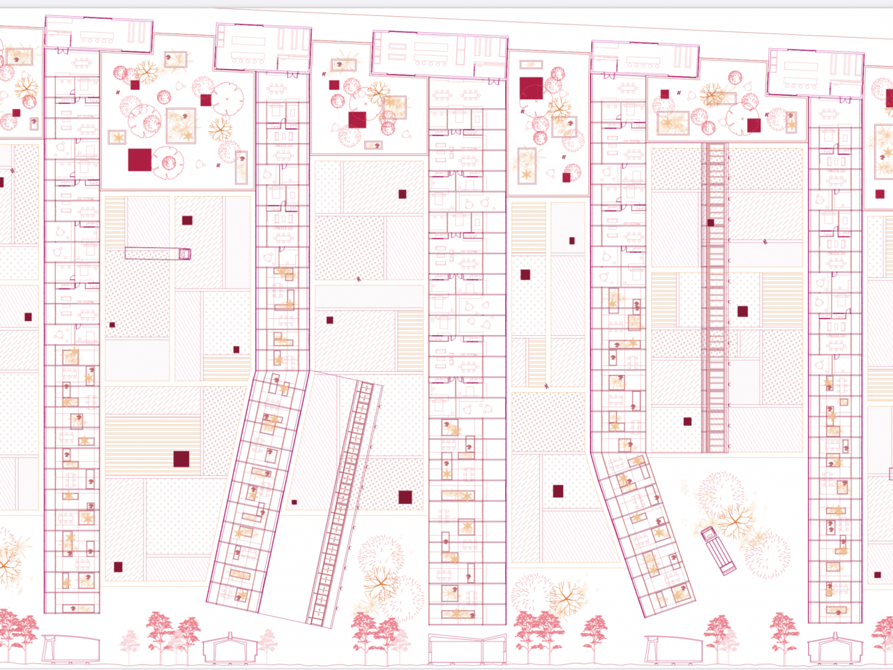 In addition to proposing an outdoor cultivation design adapted to the free space between the modules and equipped with rural post-its that facilitate the storage of supplies, a series of squares are generated that also count with urban post-its and not only act as neighborhood common spaces but also guarantee commercial activity.