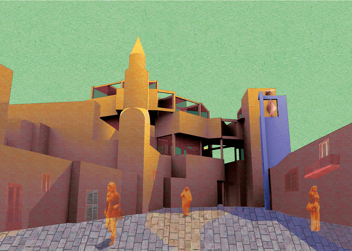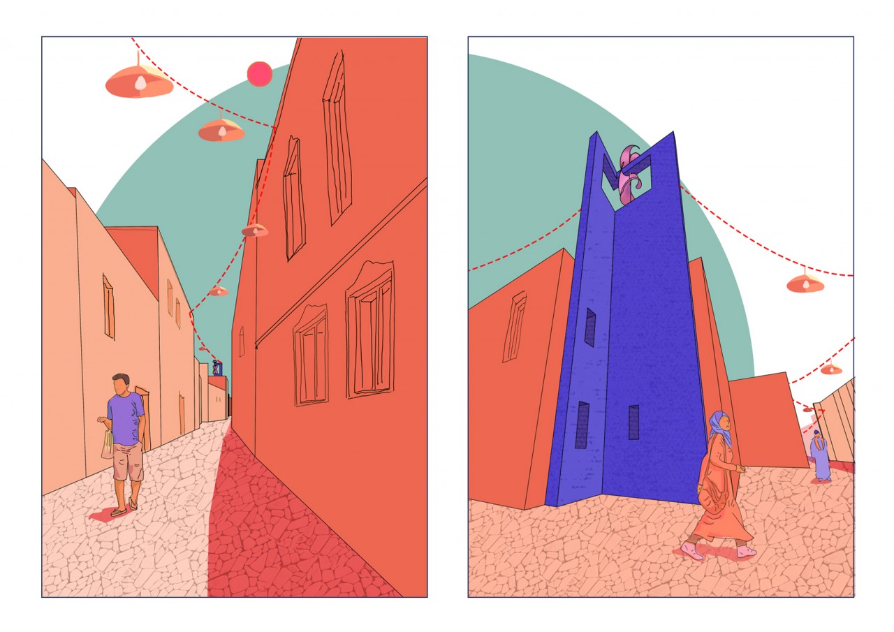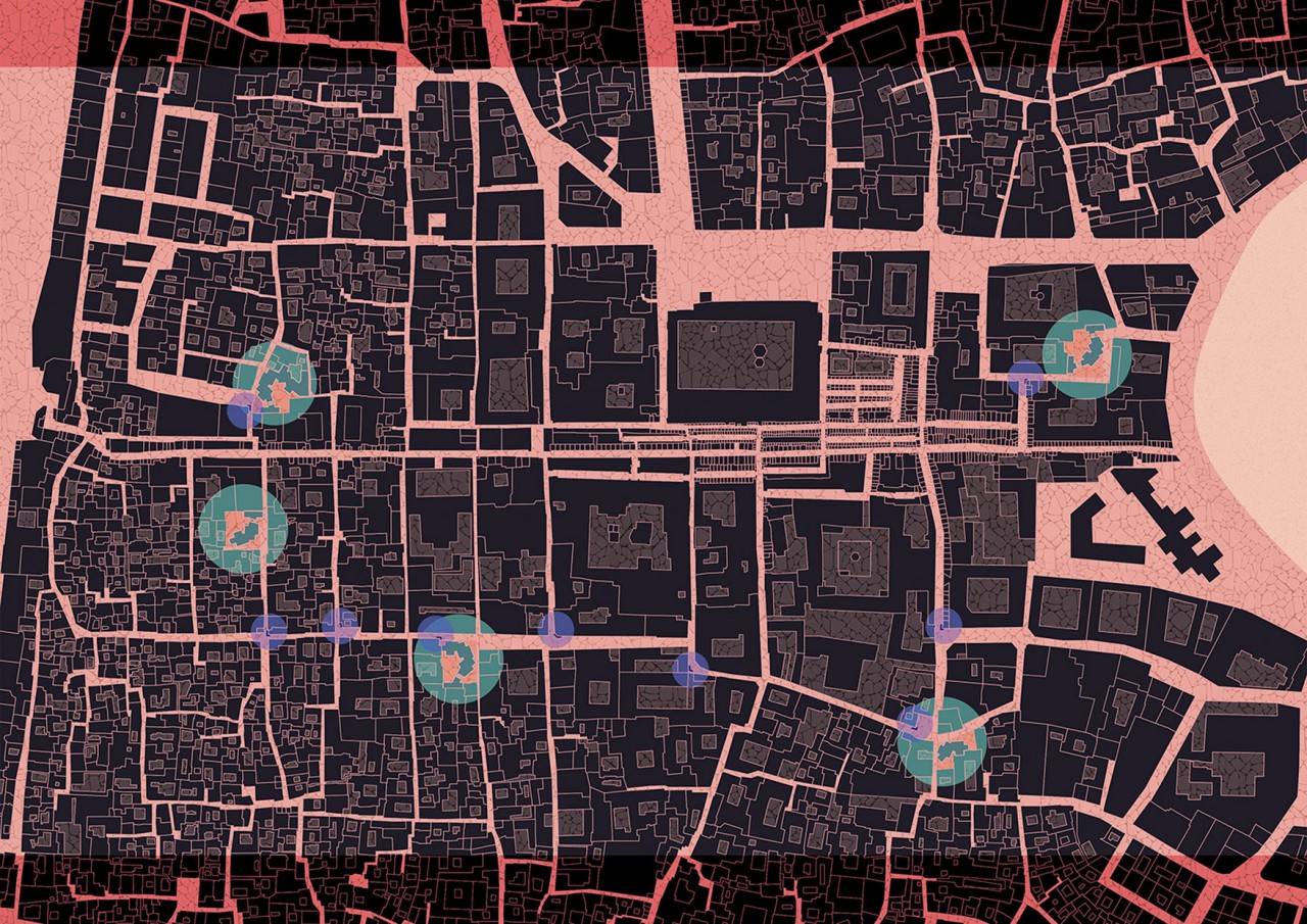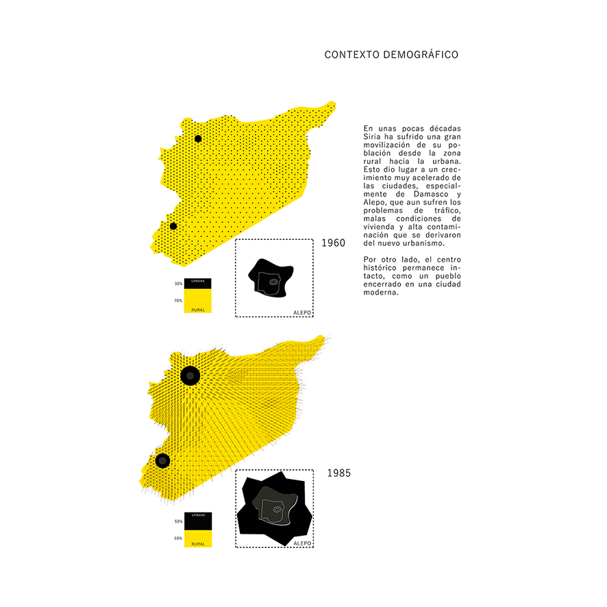 The video is followed by an analysis of the old city of Aleppo. The preservation of the socioeconomic structure of the historic center, linked to the life of the souk, is taken into account for the project. It is necessary to build houses that give asylum to the merchants in order to reactivate the market. On the other hand, it is important to introduce women in the reconstruction of the souk. The project proposes the creation of resting areas linked to the flow of the market, where both men and women can participate in the social life of the public space. Other equipment can be kindergartens, public toilets and laundry. An establishment for tea and conversation is added to the public space generated. These new uses are implemented in the existing structure of the souk.