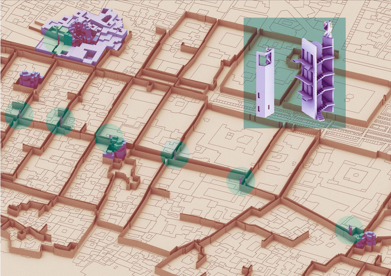 The idea of a tower is incorporated into the territorial scale of the project. These elements generate different paths towards new public spaces. They have an energy function, lighting the streets and supplying electricity.