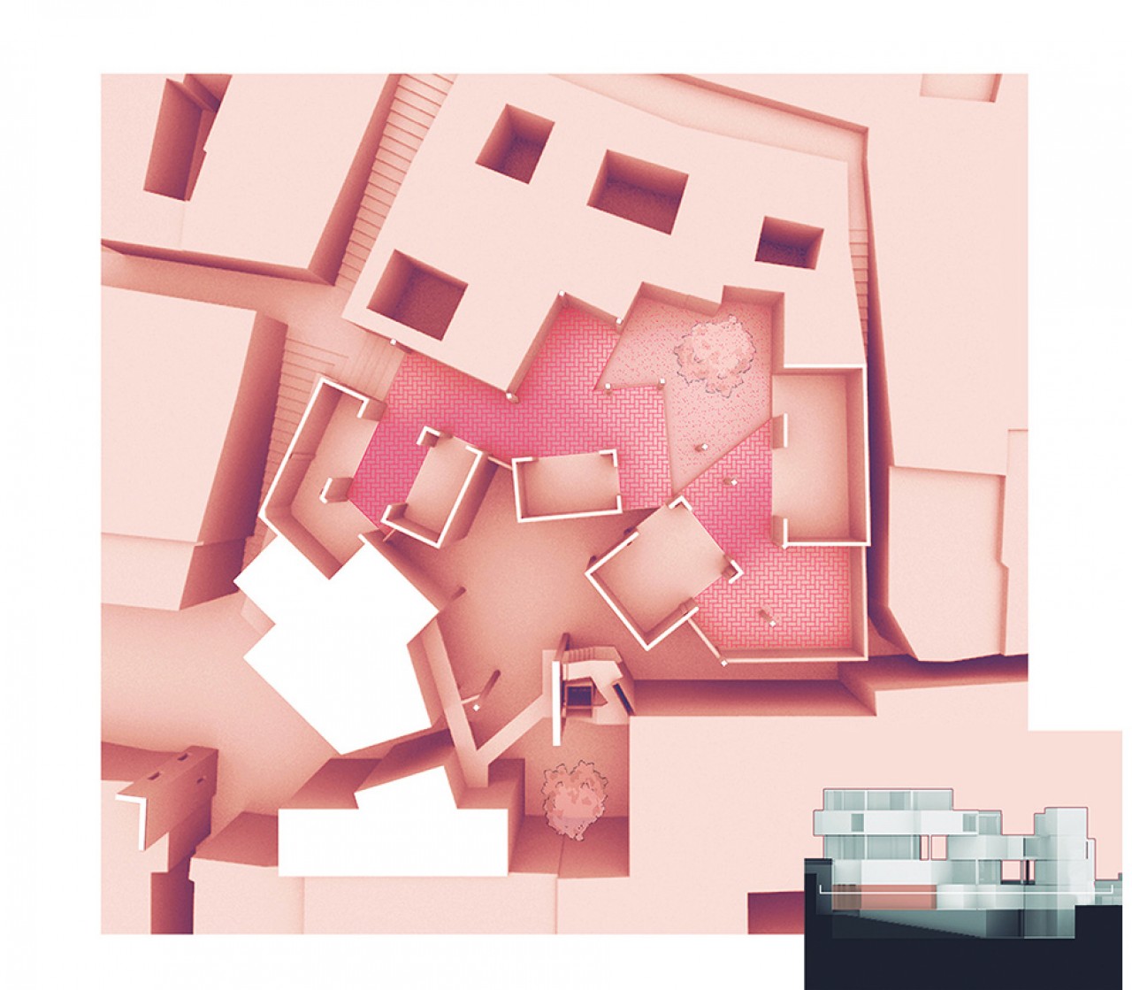 The project is developed in the ancient city of Aleppo, Syria. Homes are created by reinterpreting the patio house, stacking them vertically. A series of other uses fill the lower levels, sewing the building with the social and economic structure of the souk.