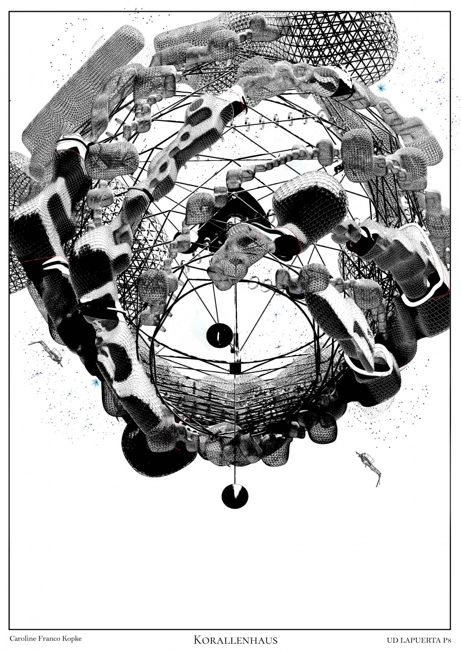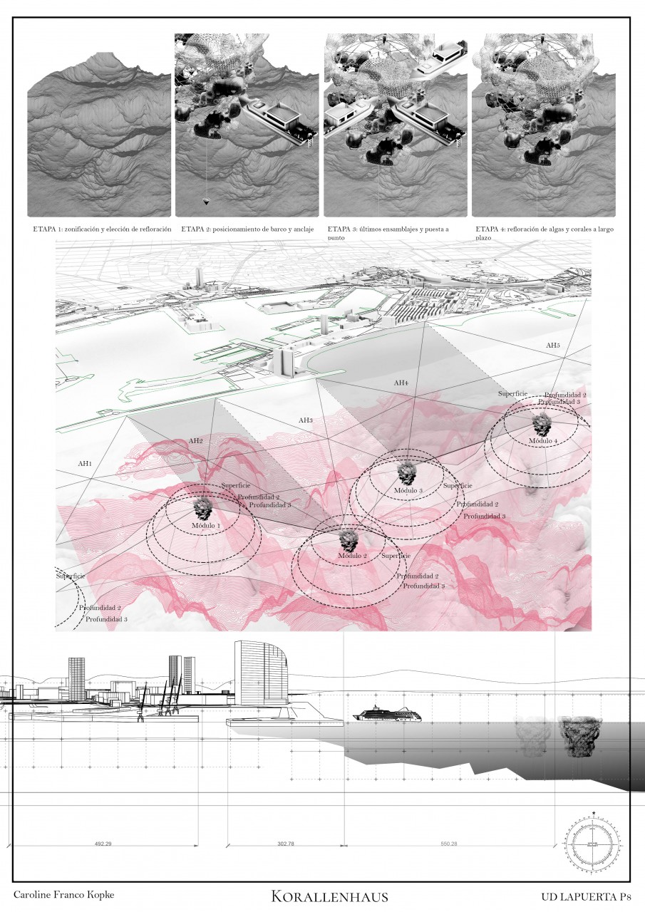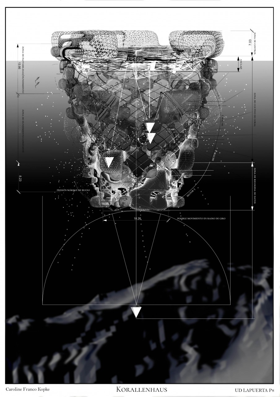 Korallenhaus is a project that aims to establish a link between architecture and nature so that one works for the benefit of the other. Therefore, the project is a device that helps in the restoration of the seabed of the Mediterranean Sea, as they have been devastated by trawling and pollution. In the organic structure, the coral cuttings are tied to control their growth until they are large enough to take them to the seabed.