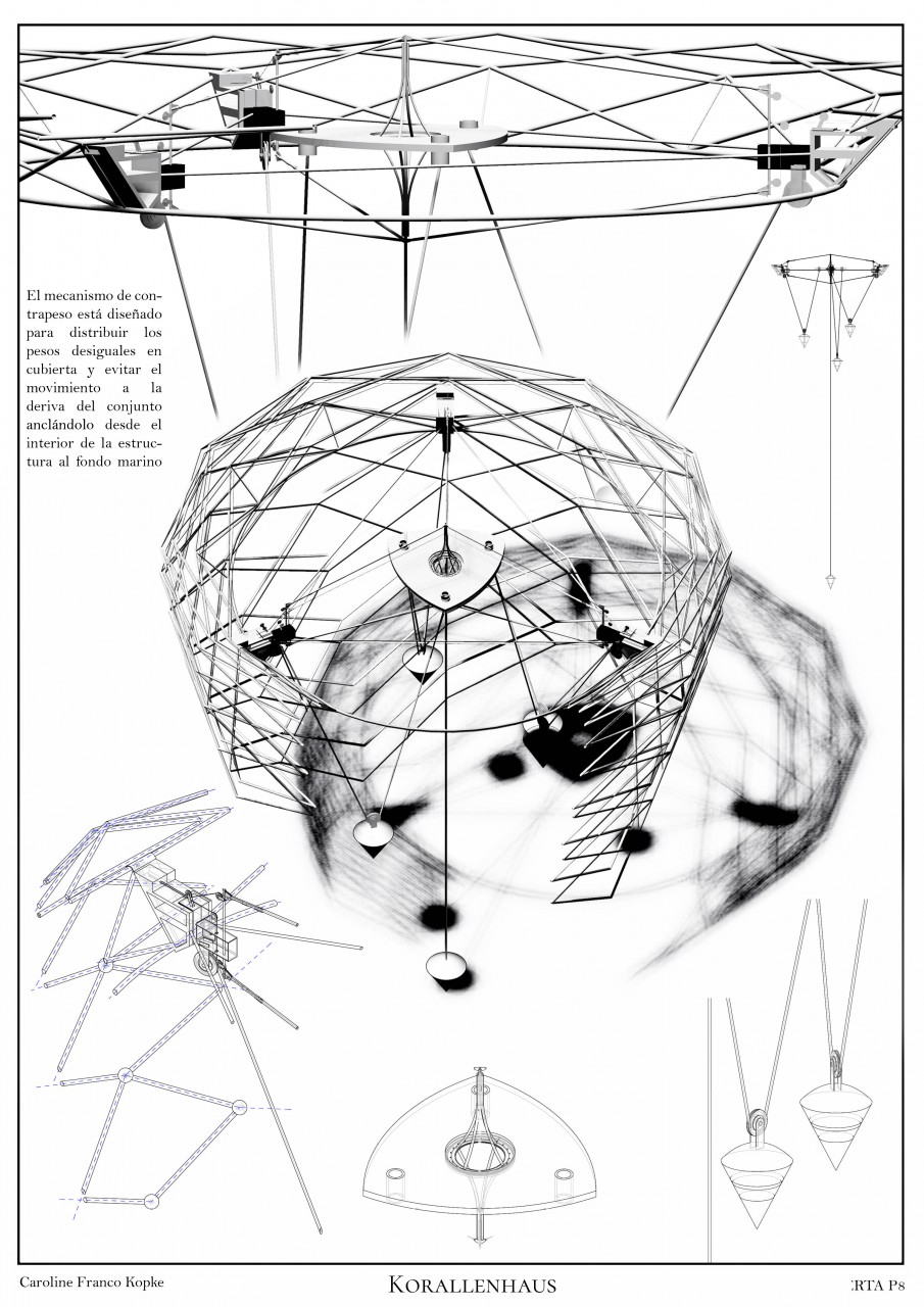 It is formed by a main structure, where the organic arms that cultivate the corals are fixed, as well as the observatory on the roof and the anchoring system by counterweights at the bottom.