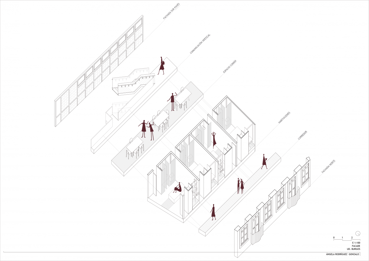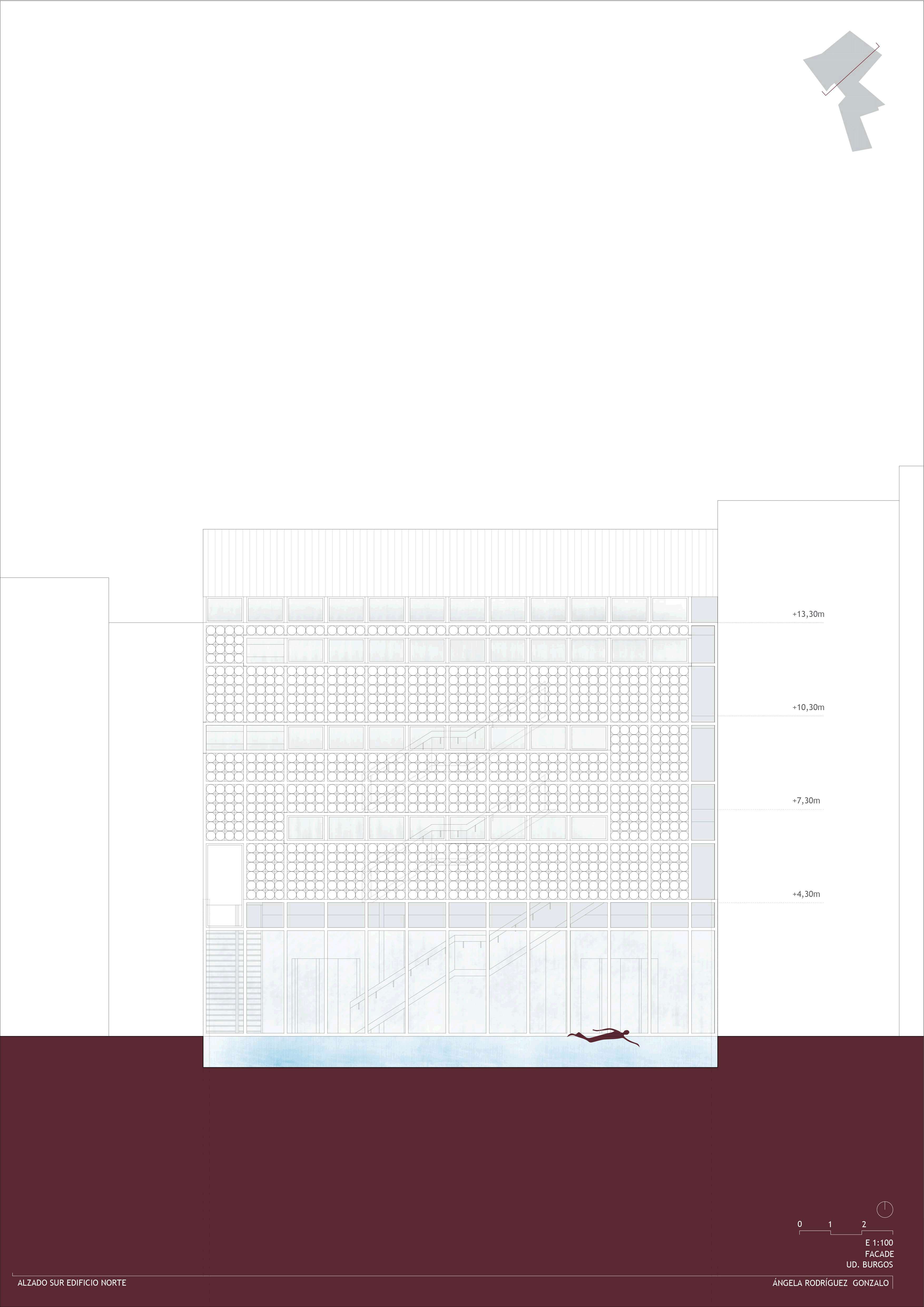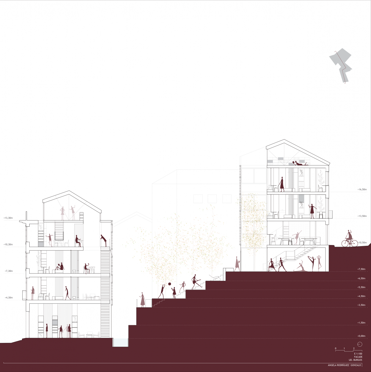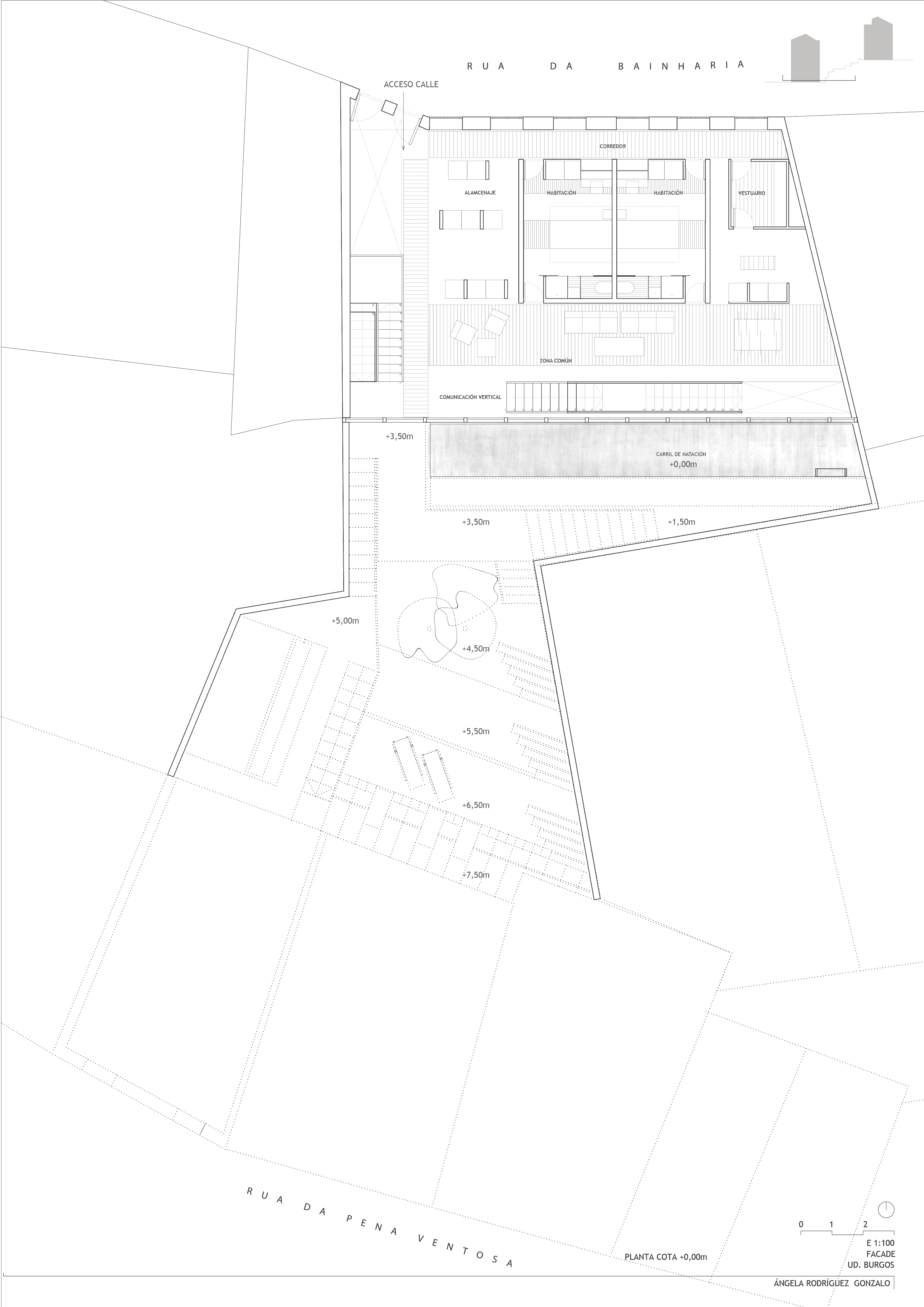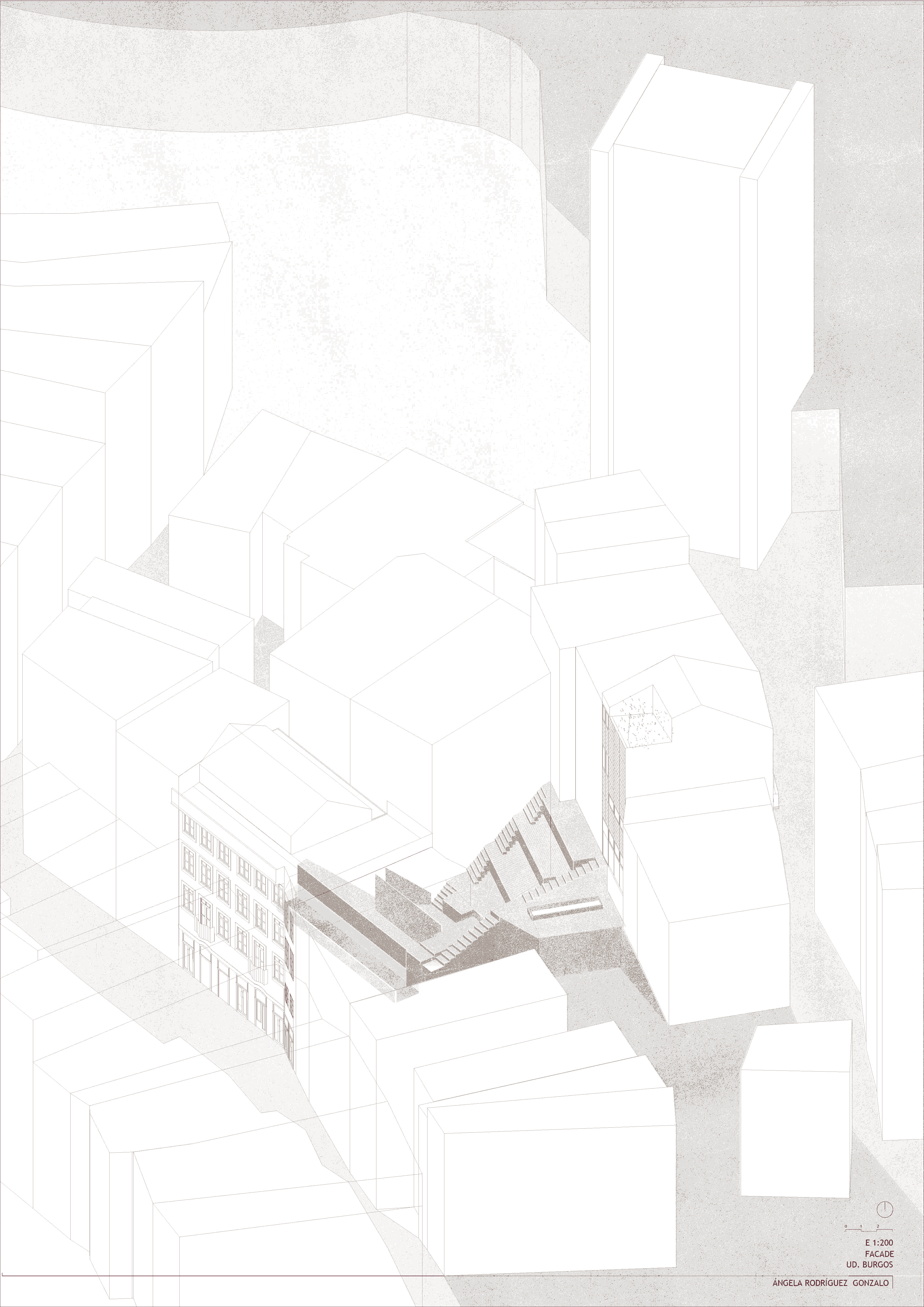 FAÇADE is a band project as well, where in a site conditionated by the existance of three ruined buildings, the emty space between them, and the difference in elevation between both, it is decisive to mantain the exterior facades.