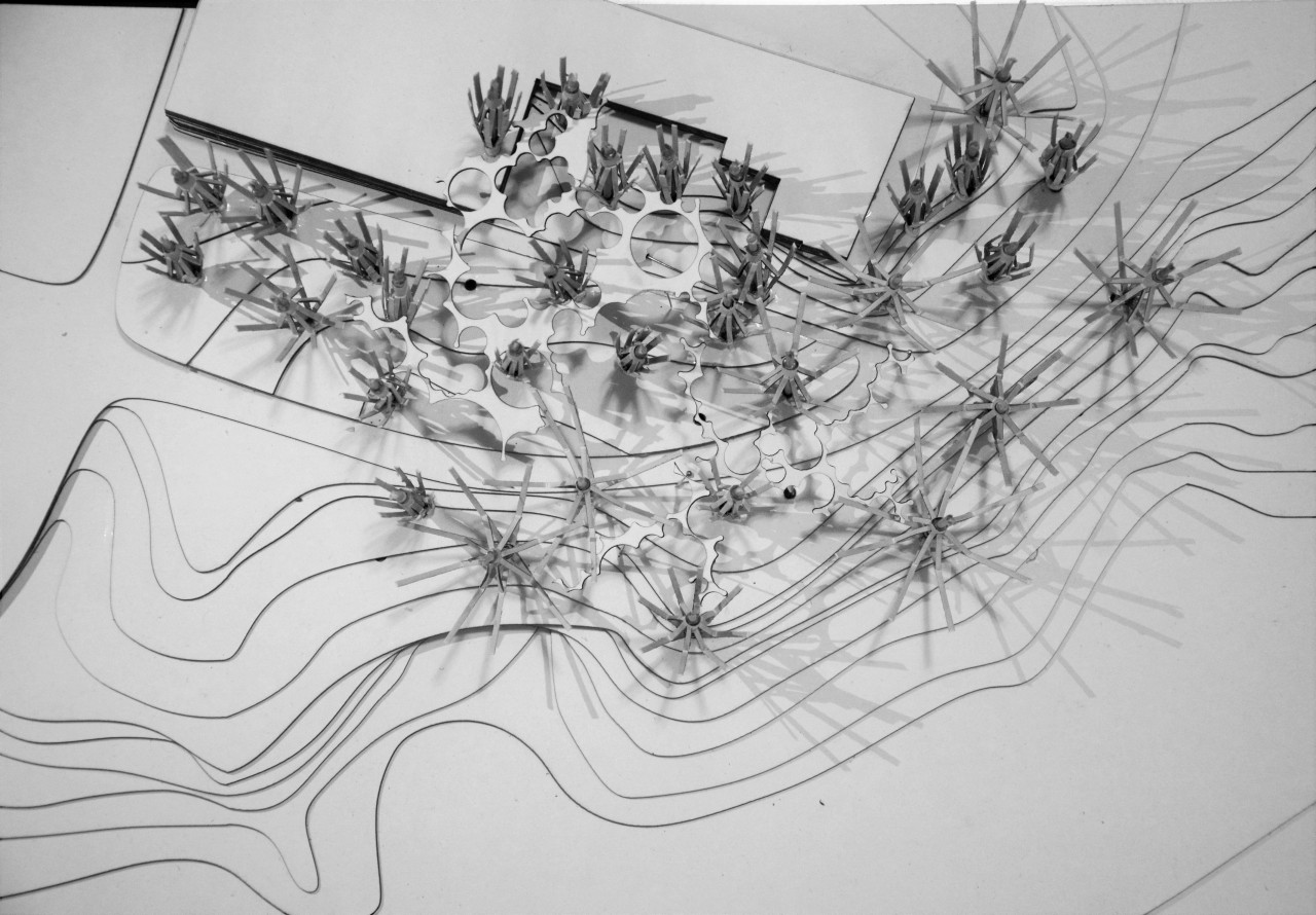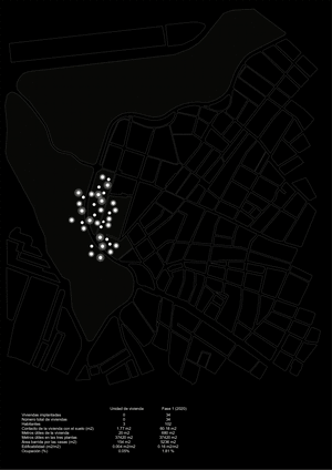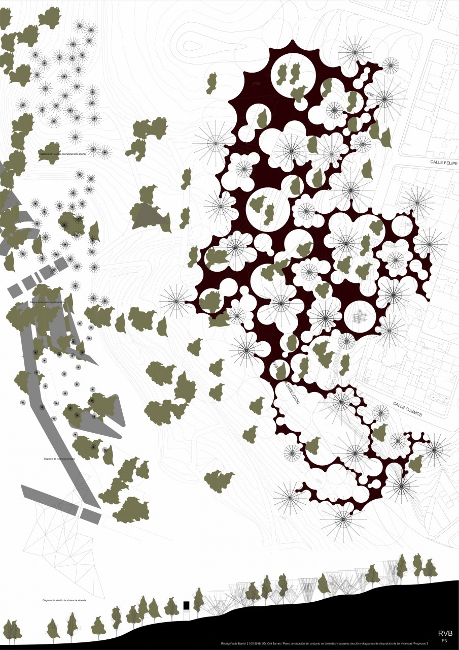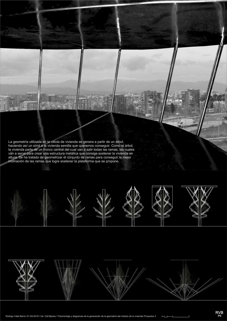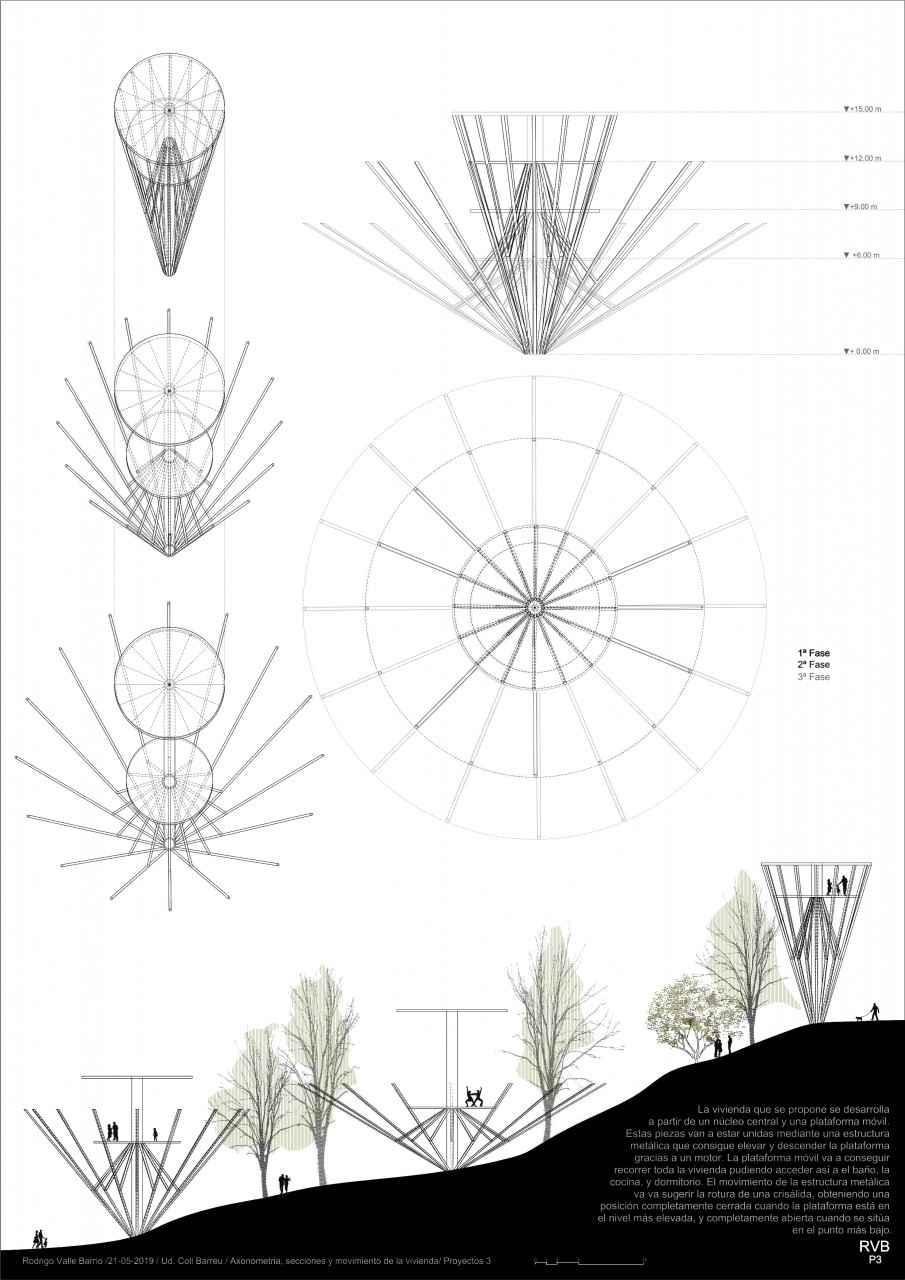 The proposal is based on the idea of returning to a continuous relief, thus extending the park to the housing barrier of Cosmos Street. The house develops in height starting from a central core, which contains all the facilities and furniture necessary to develop the life of the house, a roof and a mobile platform, which from a metal structure, manages to raise and lower the platform to access the housing services proposed in the nucleus. This project thus achieves the least destruction of the land, thus developing the park's life and, in turn, the life of the high-rise dwellings.