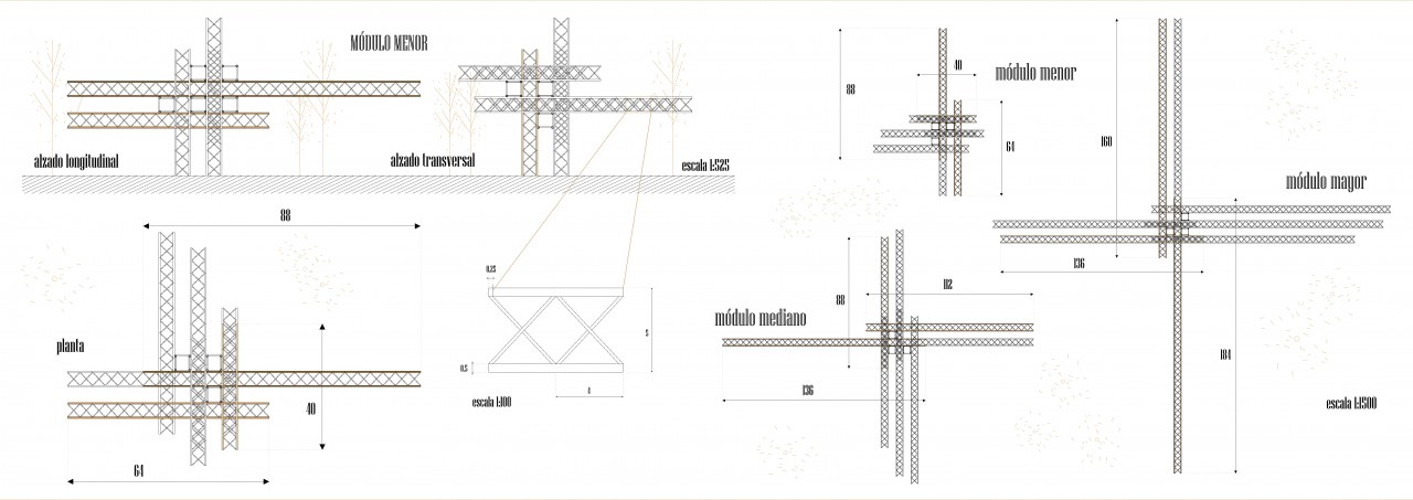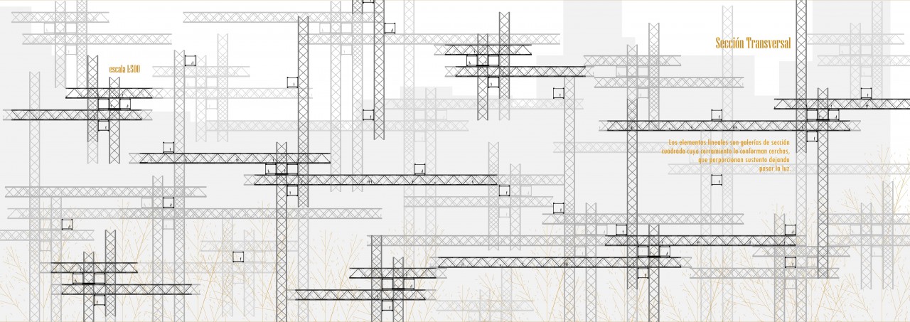 The graticule is shaped by both linear elements and knots. These are, in turn, created by prismatic galleries whose walls are made by rambling structures, so that they provide sustent while the light is still able to go through them.