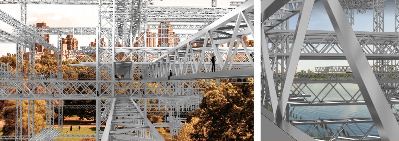 The project presents its main objective, to duplicate the available Central Park surface, by following a strategy based on the design of a modular structure. This structure pretends to shape a three-dimensional graticule, following the American idea of dividing the area in a large organized grid.