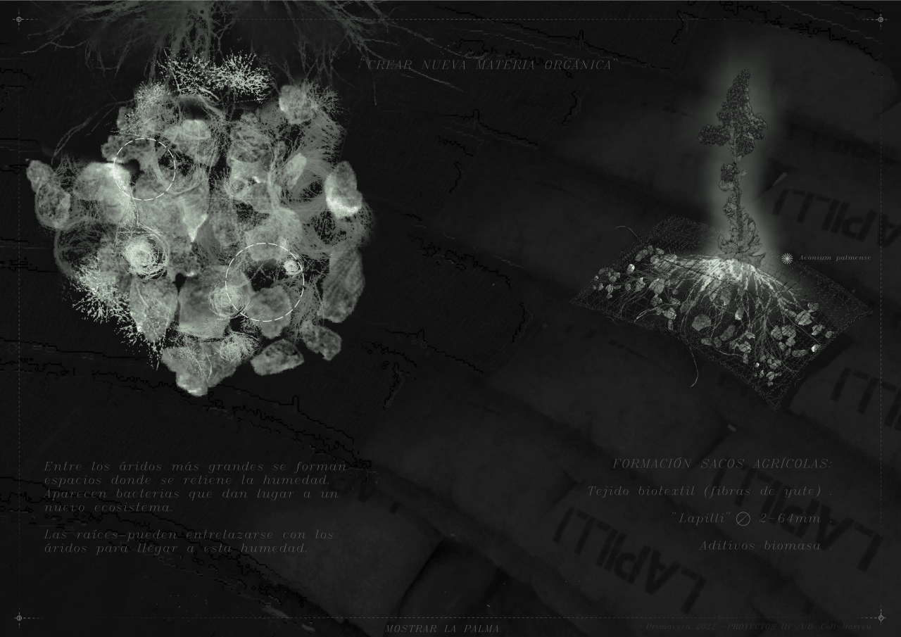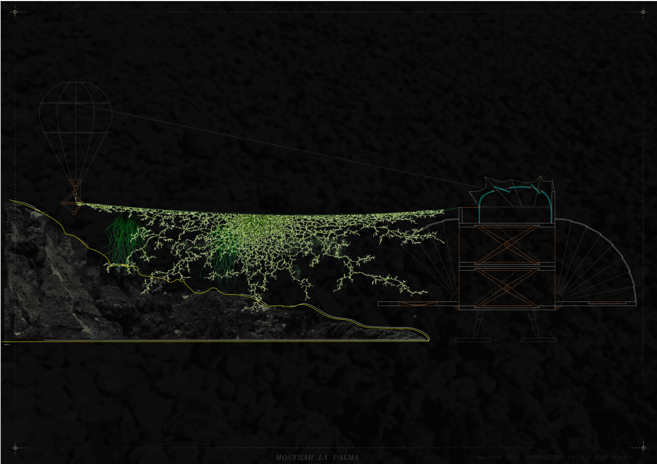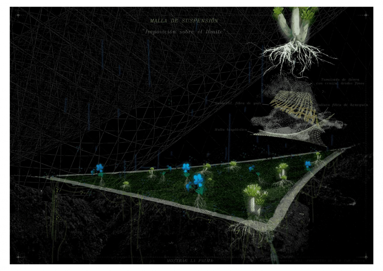 The repopulation is based on the creation of new matter thanks to geotextile meshes that are suspended in the air to avoid contact with the lava. These meshes would support a new layer of organic matter that would be imposed on the limit once generated, settling on the lava surface.