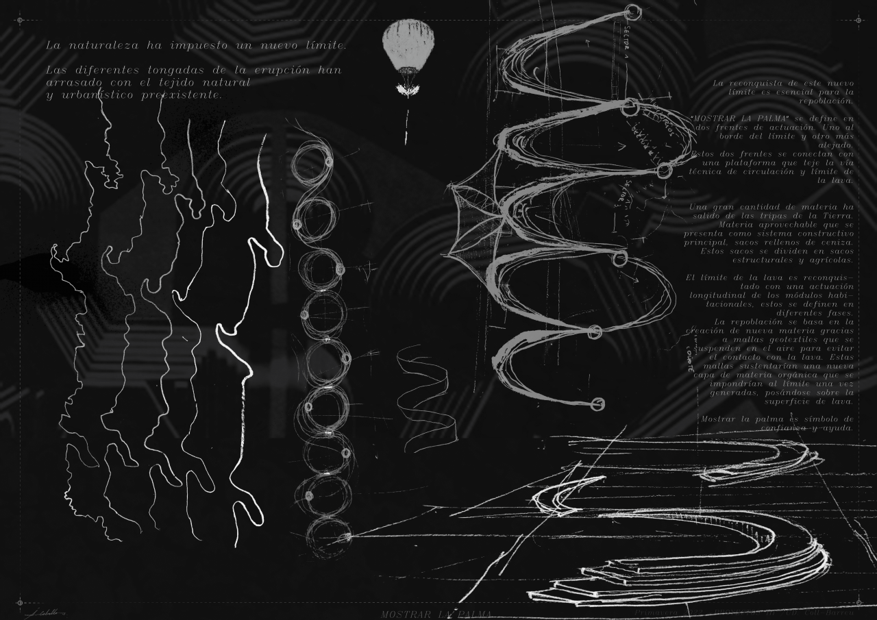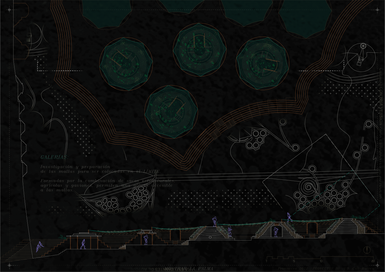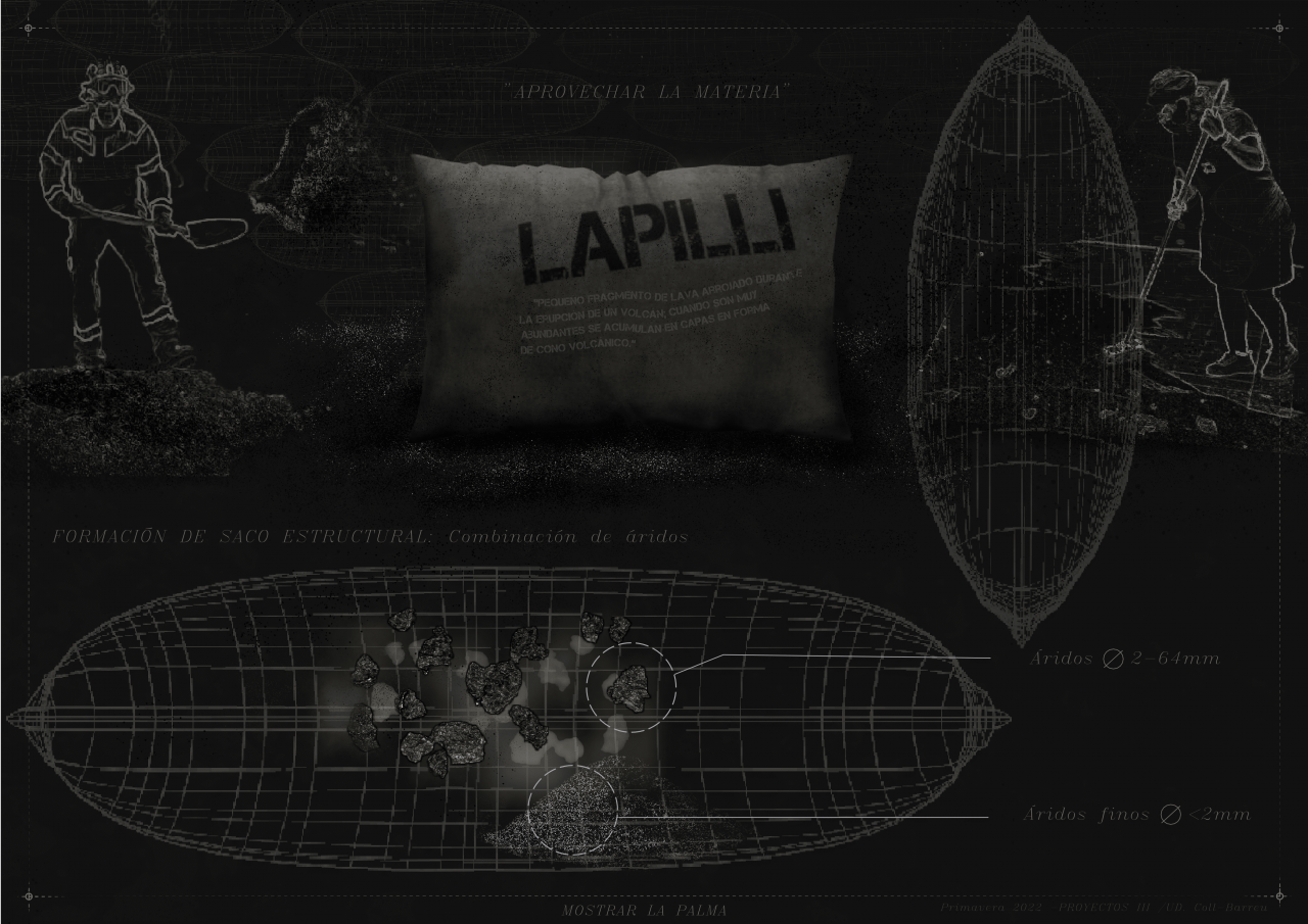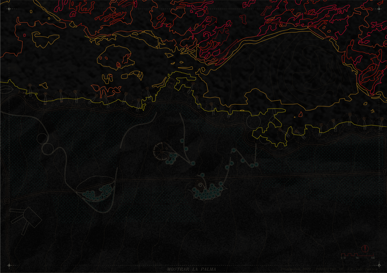 The repopulation is based on the creation of new matter thanks to geotextile meshes that are suspended in the air to avoid contact with the lava. These meshes would support a new layer of organic matter that would be imposed on the limit once generated, settling on the lava surface.