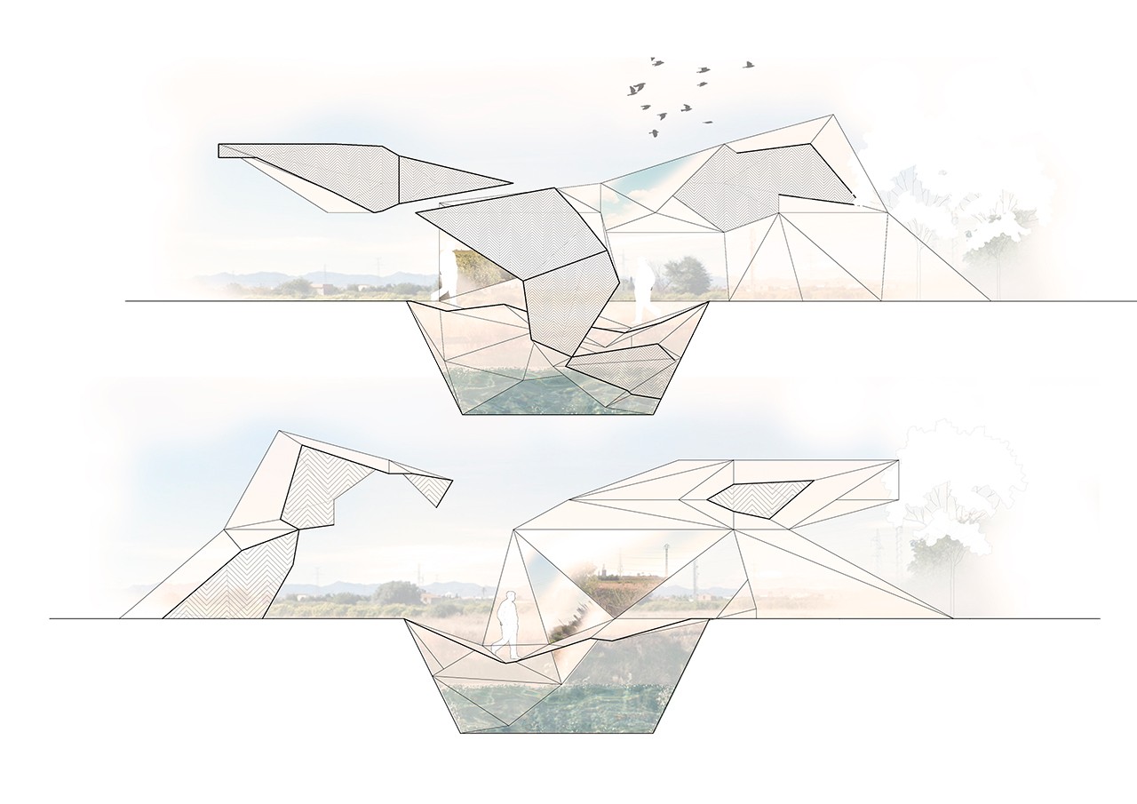 The bridge proposal, which in turn functions as a viewpoint, is based on an initial experimentation in search of a formal result capable of breaking with the organicity of the landscape. Based on the folding of triangulated flat surfaces, a kind of geometric cloud is generated, which is inserted into the ditch and manages to go unnoticed due to its transparency. The sensation of lightness contrasts with certain mirrored surfaces that allow cross reflections of the panoramic background of Castellón, and distort the perception of the individual crossing the bridge allowing new experiences.