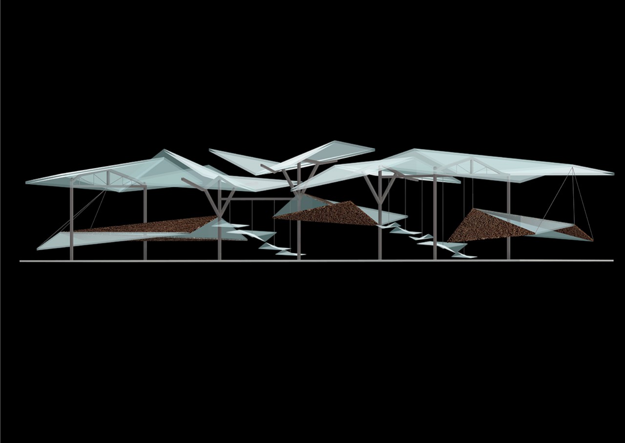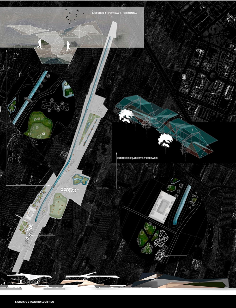 The objective to define the idea of a horticulture and garden fair in the same area of the bridge was aimed at solving a large roof for an enclosure that would house different stalls and a leisure and meeting space for the social reactivation of the area, in addition to promoting local commerce. It is a double-layer roof, the lower one being walkable and accessible through hanging platforms on a smaller scale. With the premise of transparency and the play of planes, folded modules are created that draw very different silhouettes depending on the perspective of observation, and give rise to a living and functional environment inside.