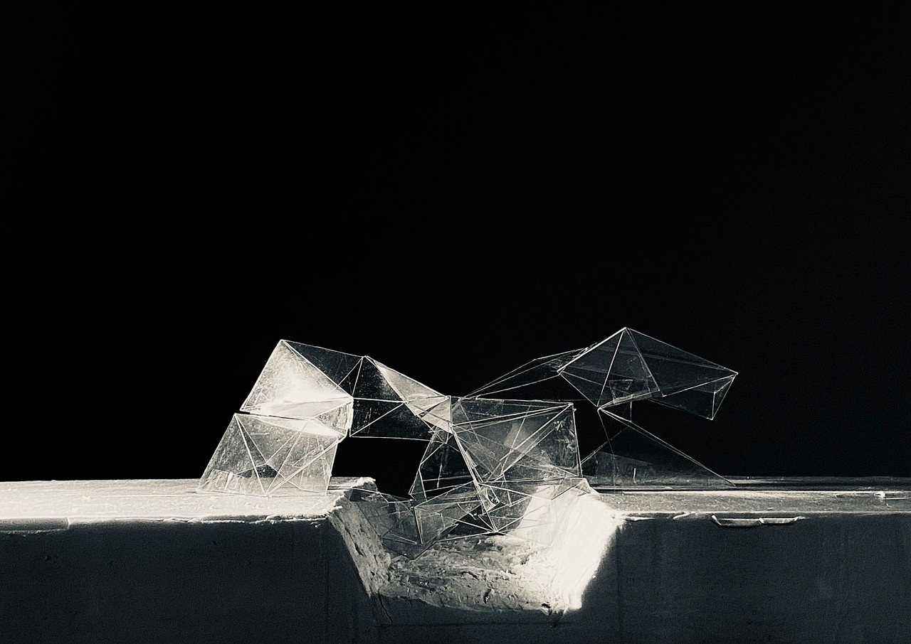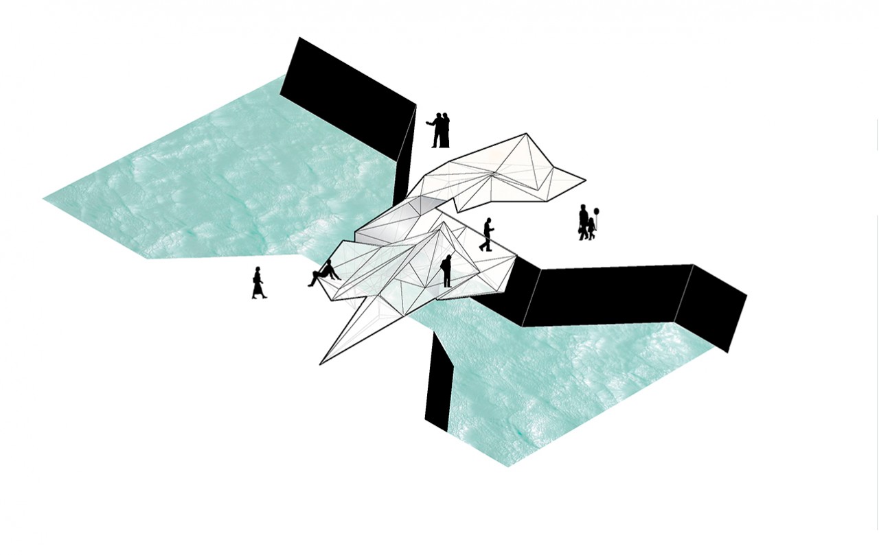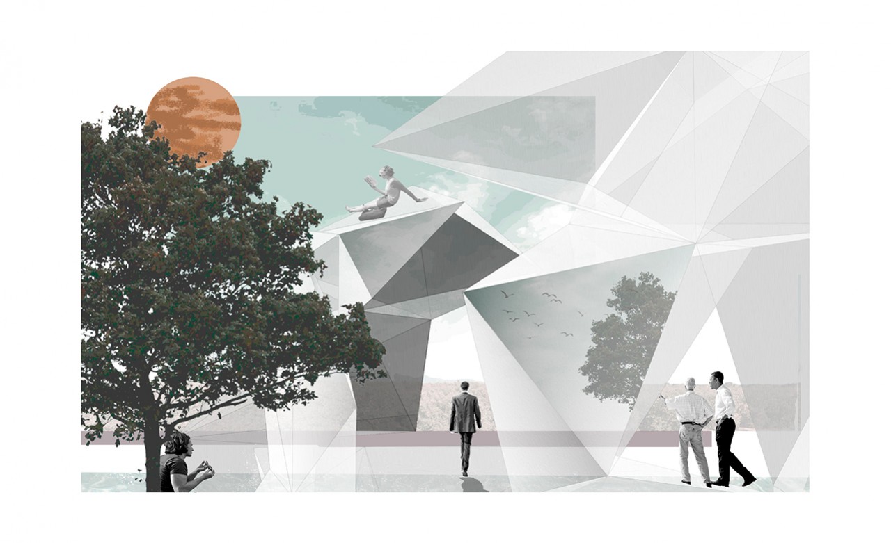 The proposals play with complex triangulated geometries that produce transparent and mirrored volumes intentionally to play with the panoramic view of the place, mainly devised from the experimentation of models created by folds of flat surfaces.