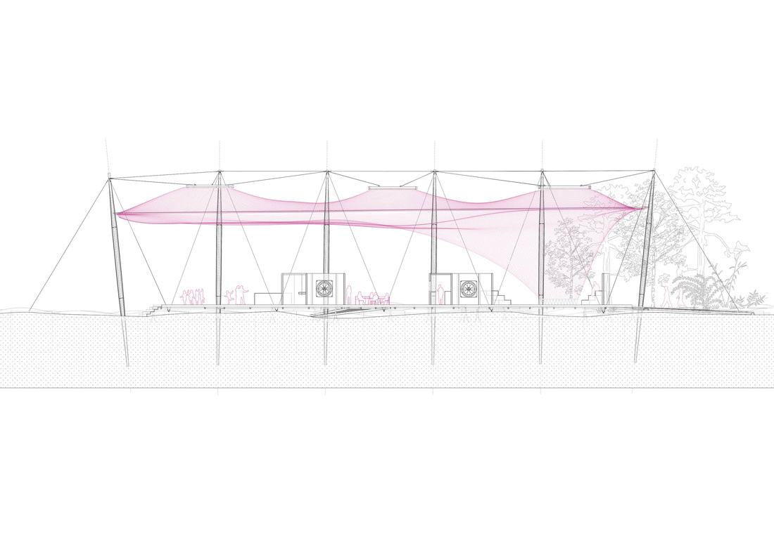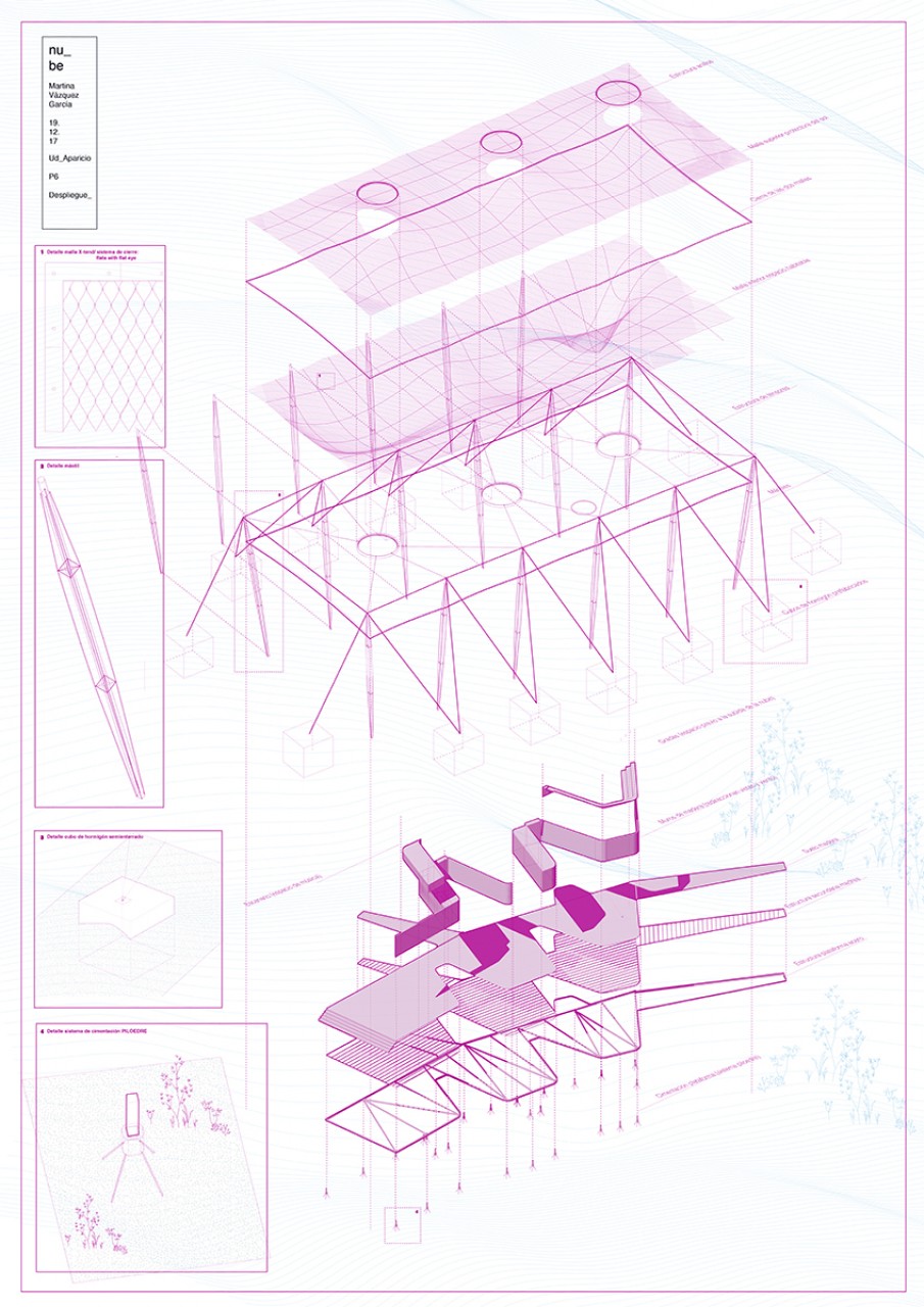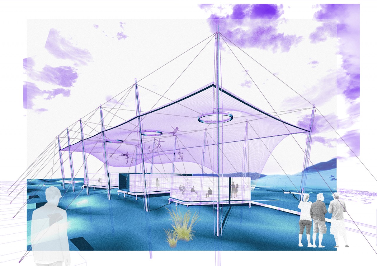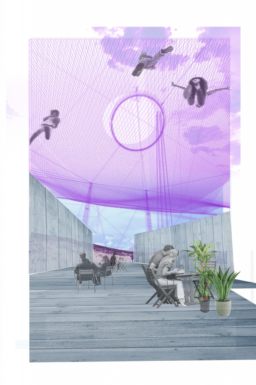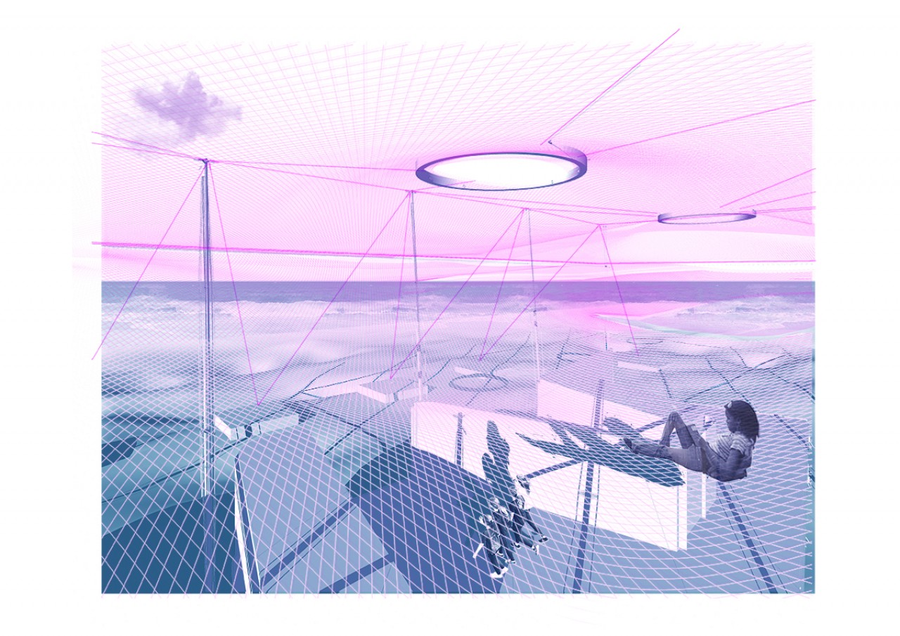 The higher part allows us to inhabit the air, which is the main theme of the course. Its a giant hammock for everyone and it let us to recover the view of the horizon and the sea and give us another perspective of this amazing place and another way of living the project. It is a double mesh that provides shadow to the lower part and its structure is formed by masts that are stuck in the sand and tensors that make it stable.