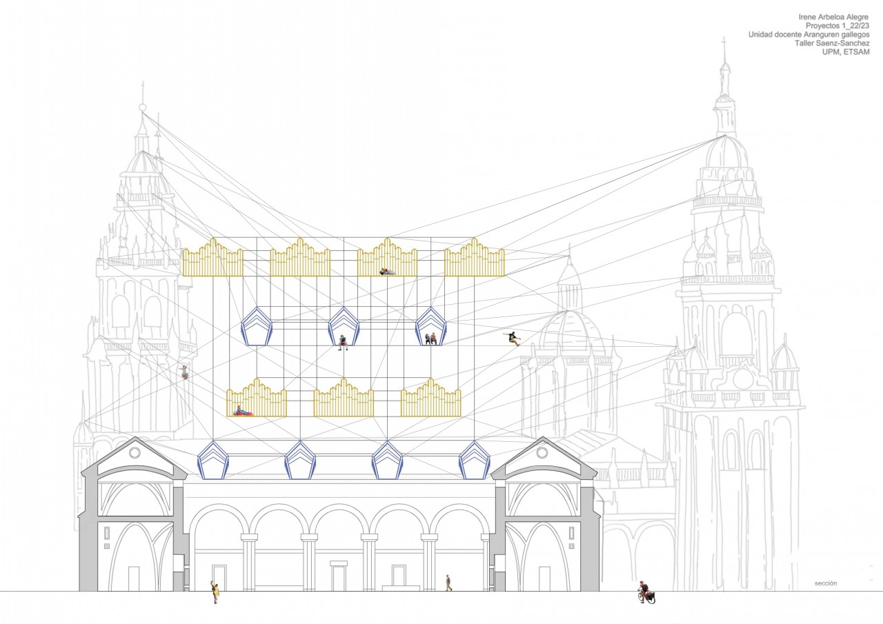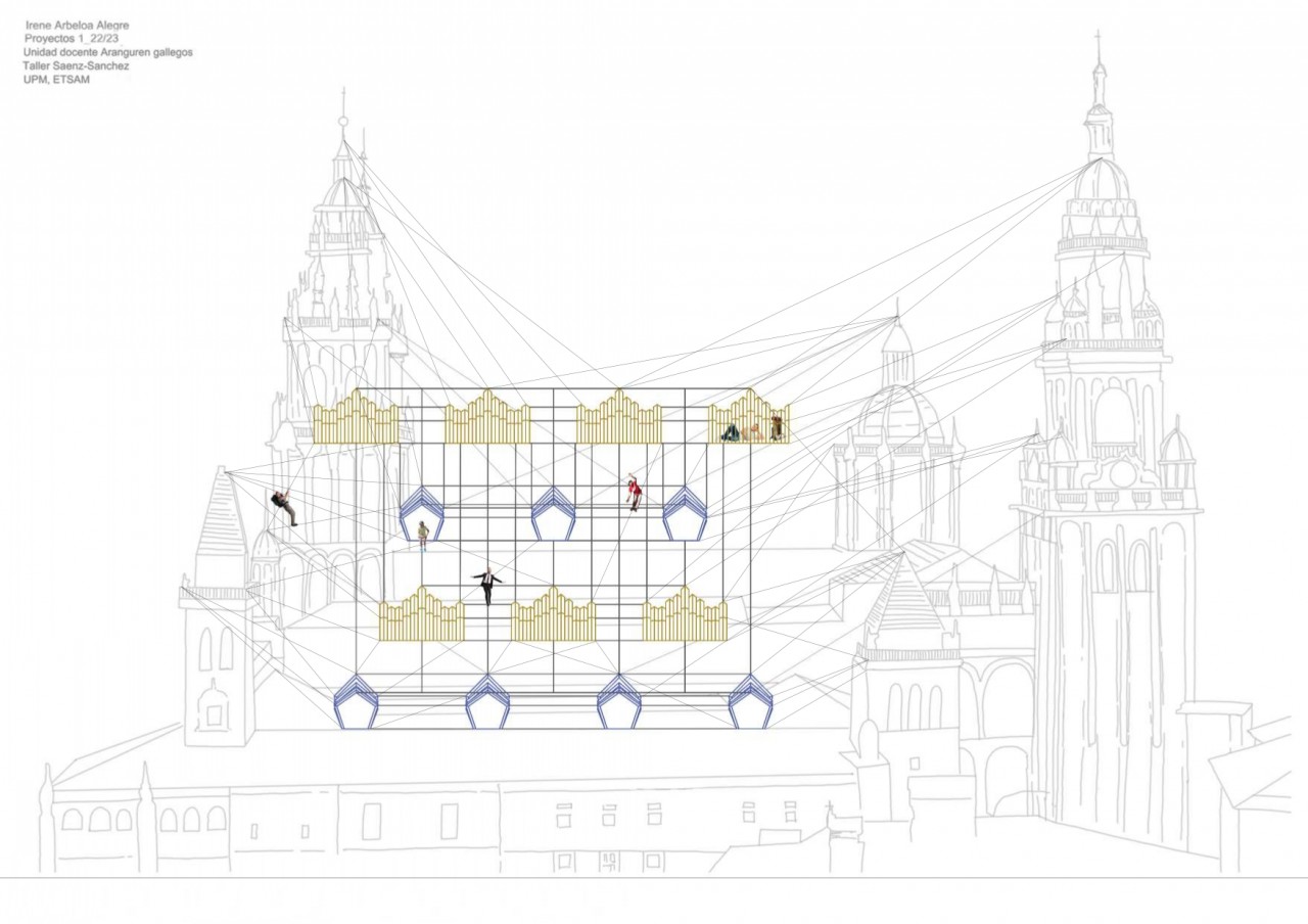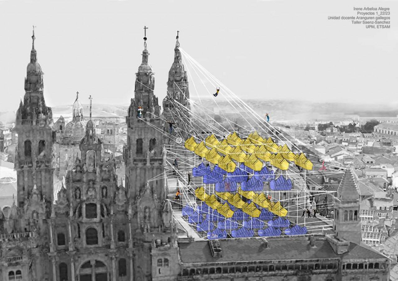 From the accumulation and repetition of cart modules emerges a new temporary and fleeting lodging that will serve pilgrims to stay once they have arrived at their destination, Santiago. It will consist onindependent modules supported by tensioned cables that will fly over the cloister inspired by the botafumeiro, creating a small elevated city for pilgrims. These modules will also be foldable, depending on the desired use. Private and individual spaces will be created within these modules, and public spaces will be created on the cables that serve as a pathway to them.