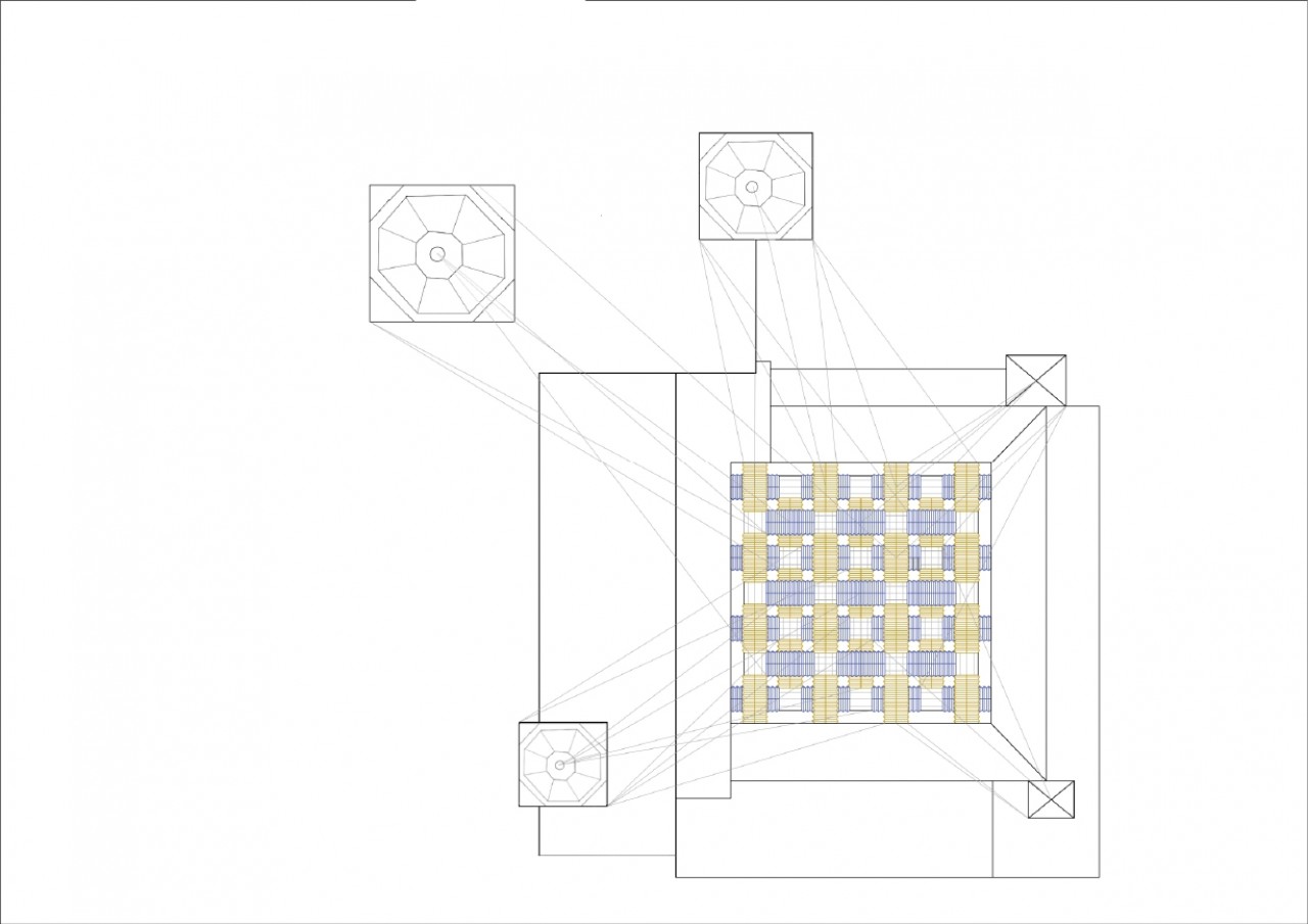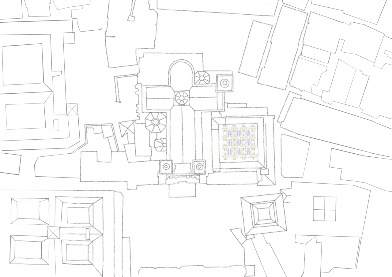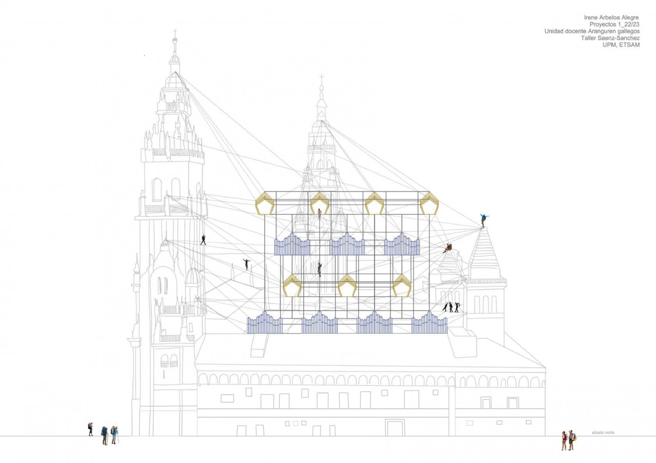 From the accumulation and repetition of cart modules emerges a new temporary and fleeting lodging that will serve pilgrims to stay once they have arrived at their destination, Santiago. It will consist onindependent modules supported by tensioned cables that will fly over the cloister inspired by the botafumeiro, creating a small elevated city for pilgrims. These modules will also be foldable, depending on the desired use. Private and individual spaces will be created within these modules, and public spaces will be created on the cables that serve as a pathway to them.