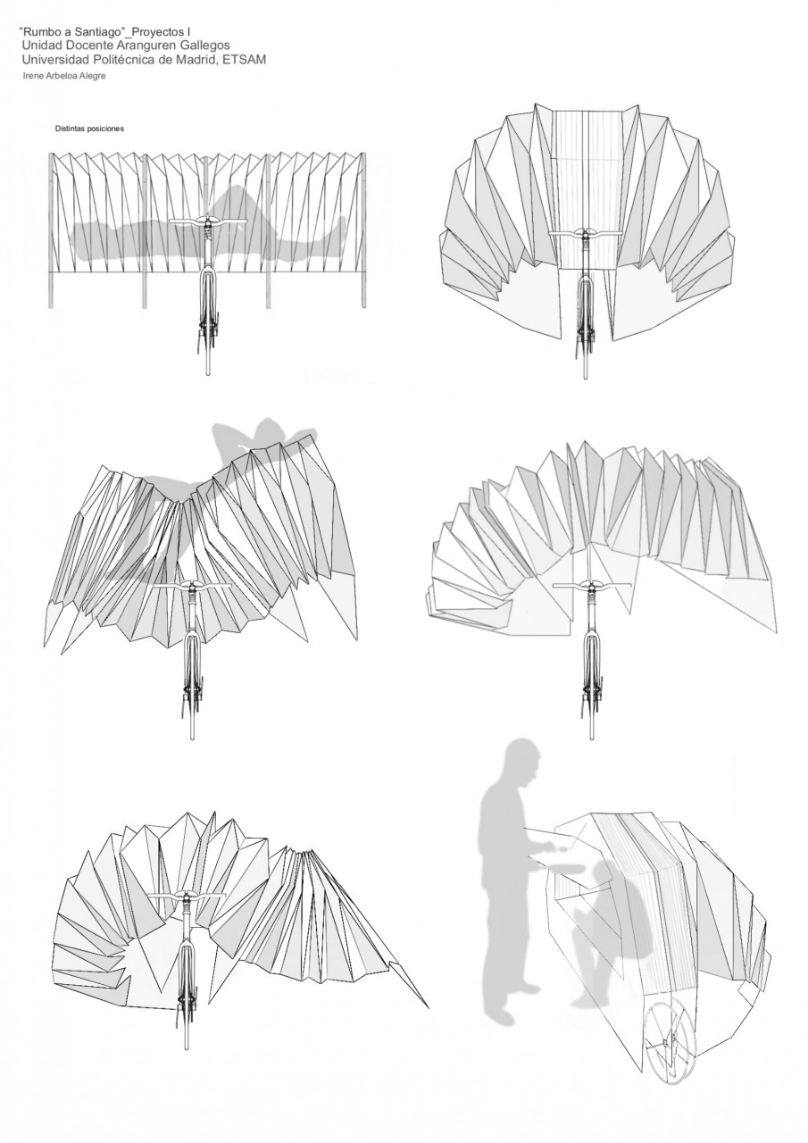 The portable cart consists on a foldable auxiliary accommodation that will be attached behind a bicycle. It is based on an origami-inspired structure that allows it to be folded and unfolded to obtain a minimised space when in transit, making transportation as aerodynamic as possible. The cart also features multiple positions depending on the different needs of the pilgrim along their journey.