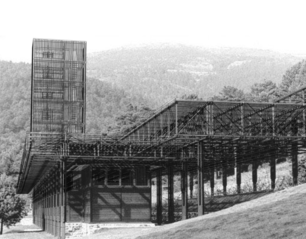 In the third project, a hostel for pilgrims is proposed in lath house of Cercedilla, which is located in Sierra of Guadarrama. It consists of three bodies in the form of wooden lattices that are placed on a sloping hillside and contains changing rooms and a swimming pool. It has been decided to build some towers to look over the forest, reinterpreting the reading of the lath house. The lath house is inhabited again with an extensive program to serve the pilgrims. Two towers have been placed at different heights where the letters are located, which occupied double heights. The dimensions of the tower are governed by the traces of the lath house itself and by the measurements of the human body. In such a way that an austere and minimal space is created.