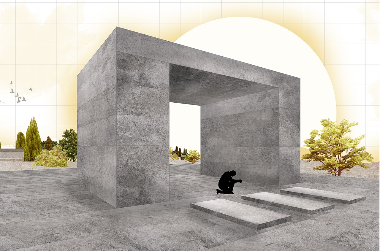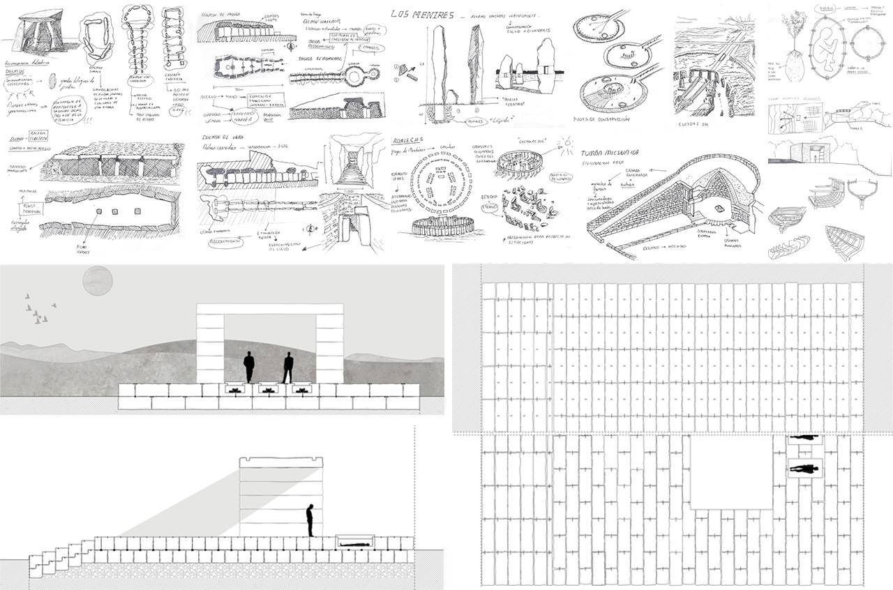 Pilgrimage is the movement, usually on foot, of people to sacred places. It is a universal phenomenon. The three projects are going to focus on the Camino de Madrid, which is a route of the Camino de Santiago, the most important medieval pilgrimage route in Europe. In the first place, the creation of a family tomb of its own is proposed in the Fuencarral cemetery that passes through the Camino de Madrid and has views towards the Sierra de Guadarrama. To make the tomb, burials in the past, such as dolmens and menhirs, were analysed. The project is placed on the highest level of the cemetery and builds a kind of podium with stairs through which they rise. There is a long section that works as a transition space and finally reaches a covered monolith.