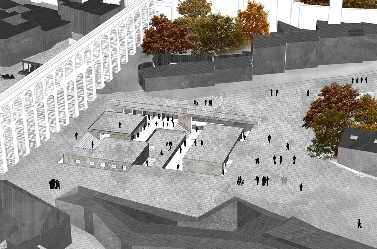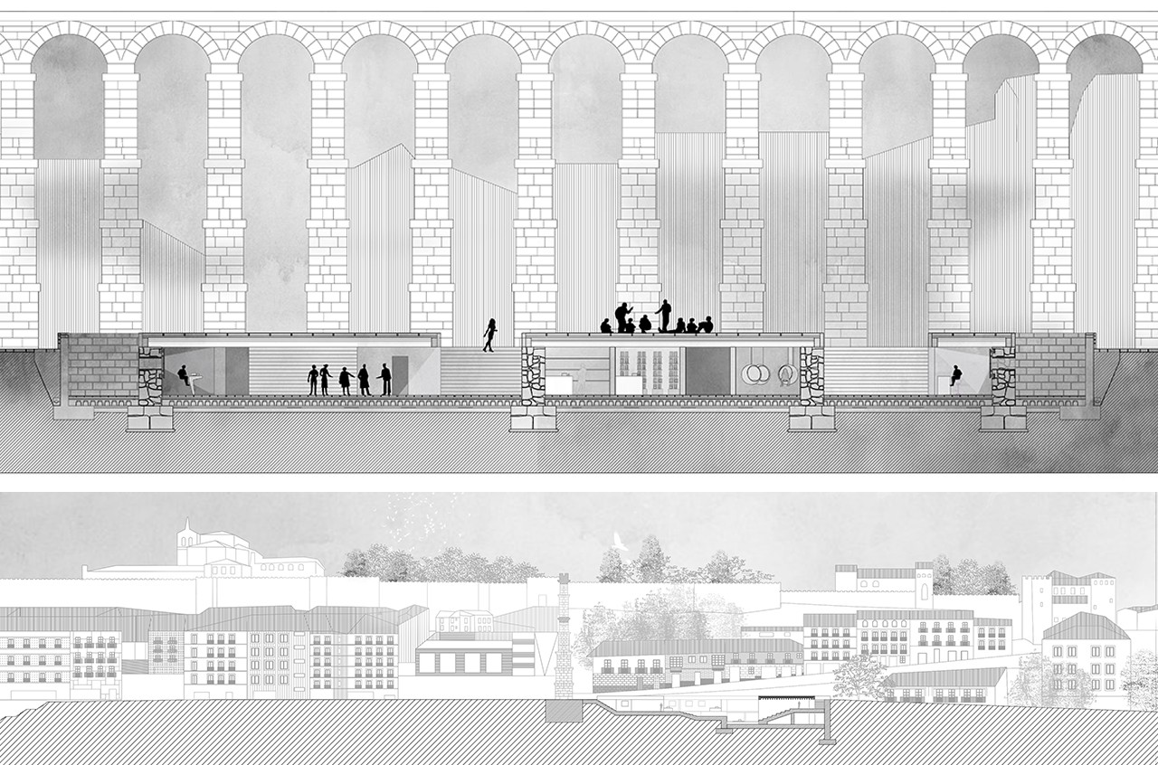 The second project, a space for reception and events, is located in the Segovia aqueduct. It is proposed to act in the Plaza de Oriente, where the aqueduct reaches its maximum height. an element of union is created between the part of the dense and consolidated city and the part in which the void is the protagonist. To do this, we excavated a plane on which the aqueduct rests and a route is created in such a way that the aqueduct can be viewed from different perspectives. The first space dedicated to fairs that has a series of stalls and a grandstand where interactive events are held.