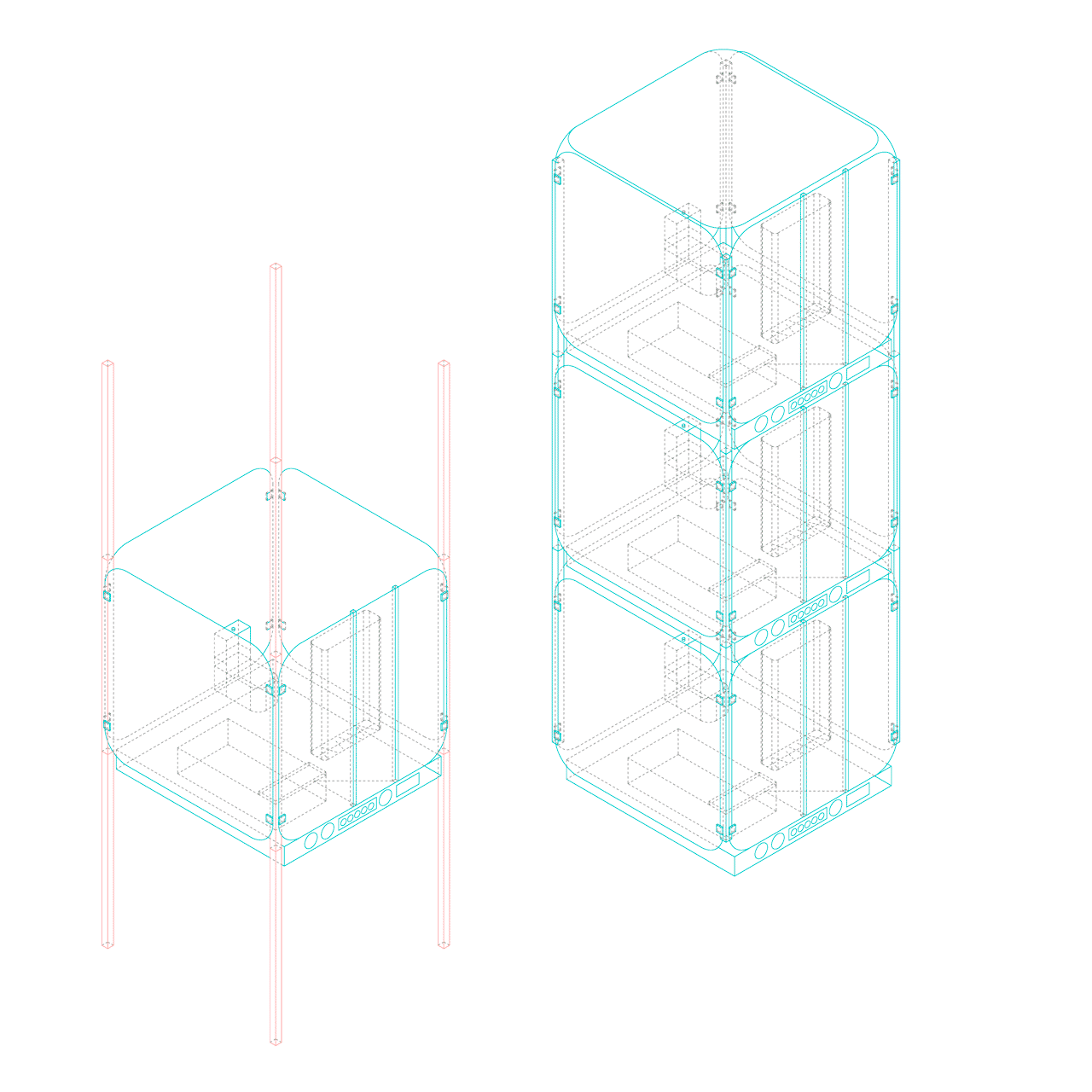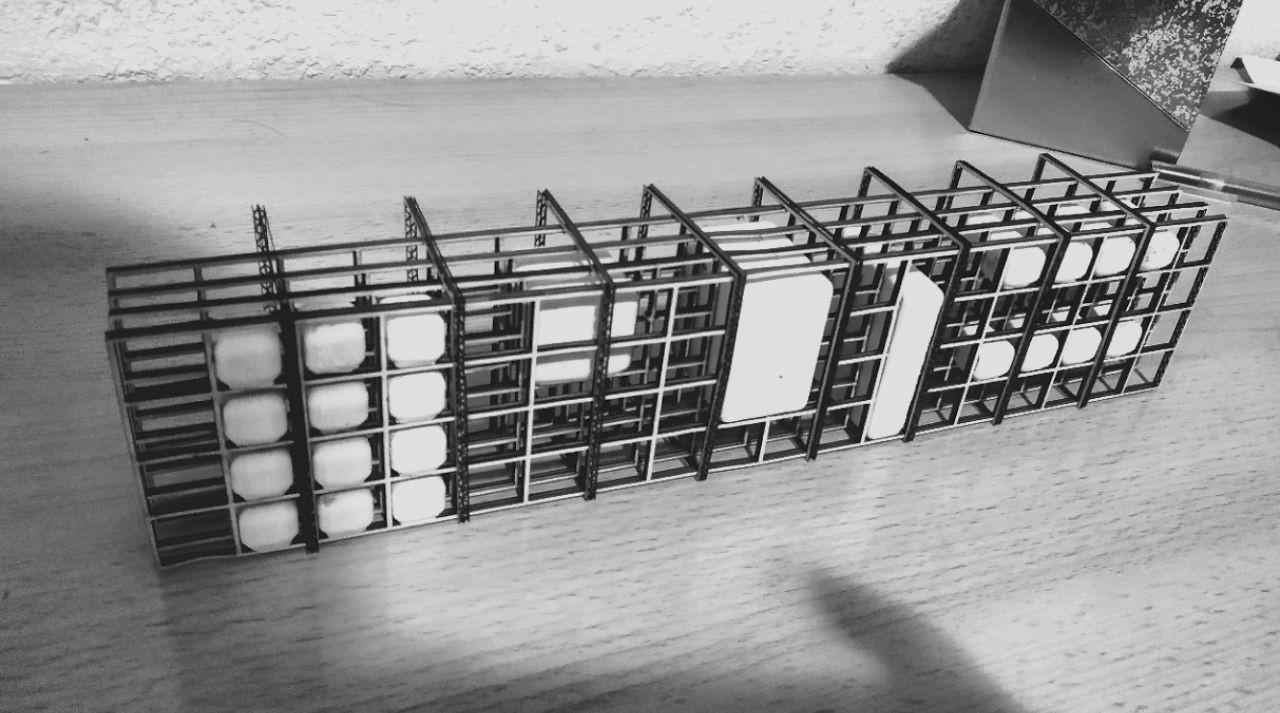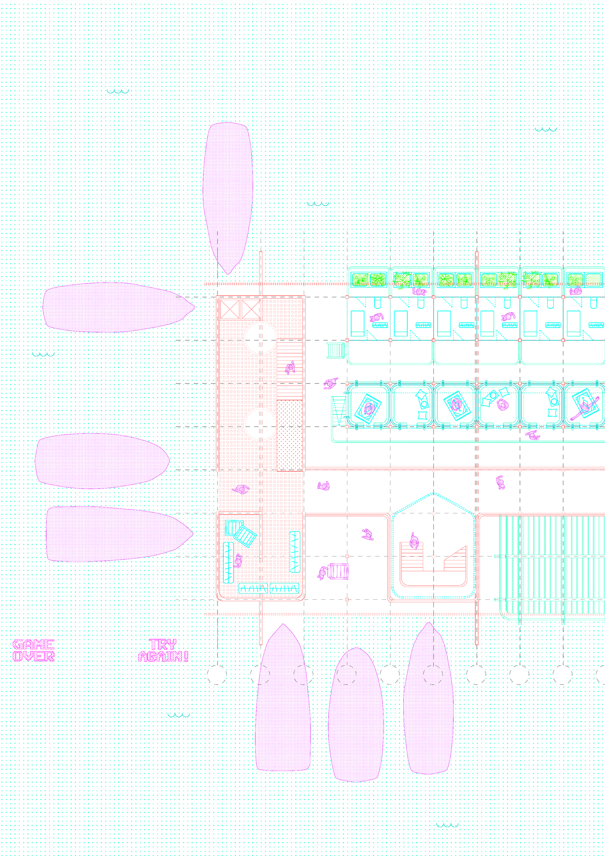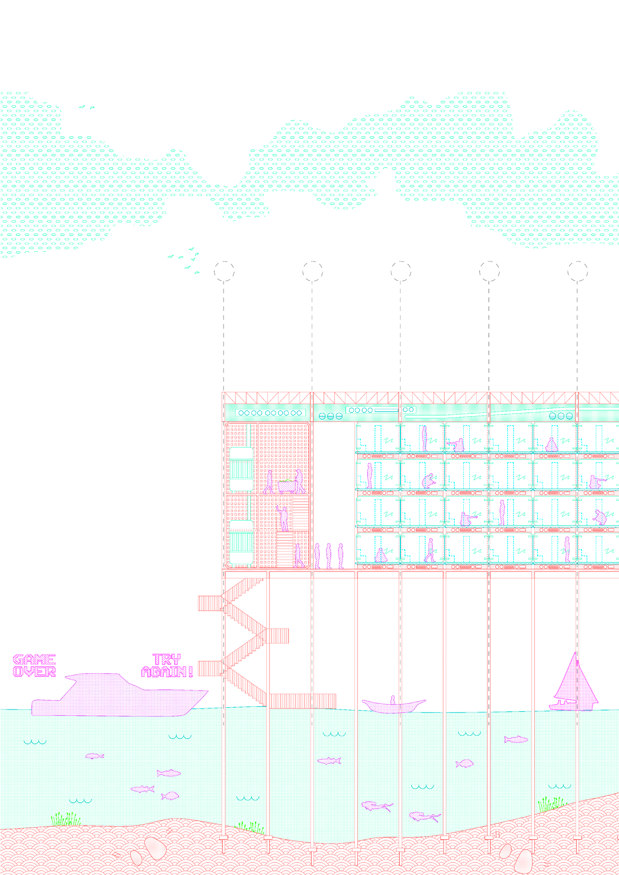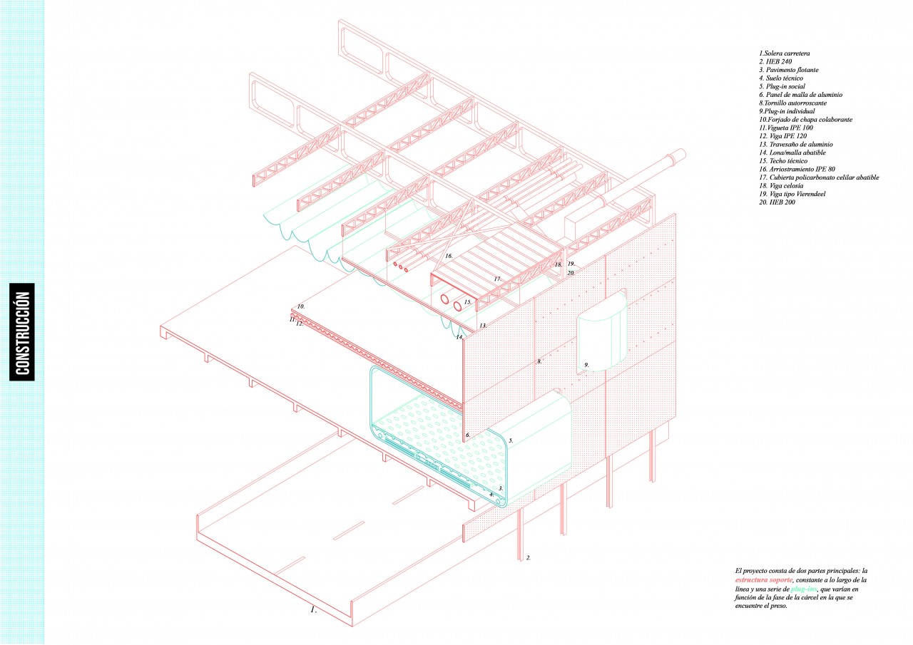 Prisioners get to the prison by boat while their relatives and friends create a whole new community at the rear of the building. The prison is divided into 4 stages with different levels of intimacy, privacy and socialization, separated by control pieces in which prisioners are evaluated to go on their path. The building is composed by a main structural support continuous along the line and a whole catalogue of plug-ins which vary depending on the stage.